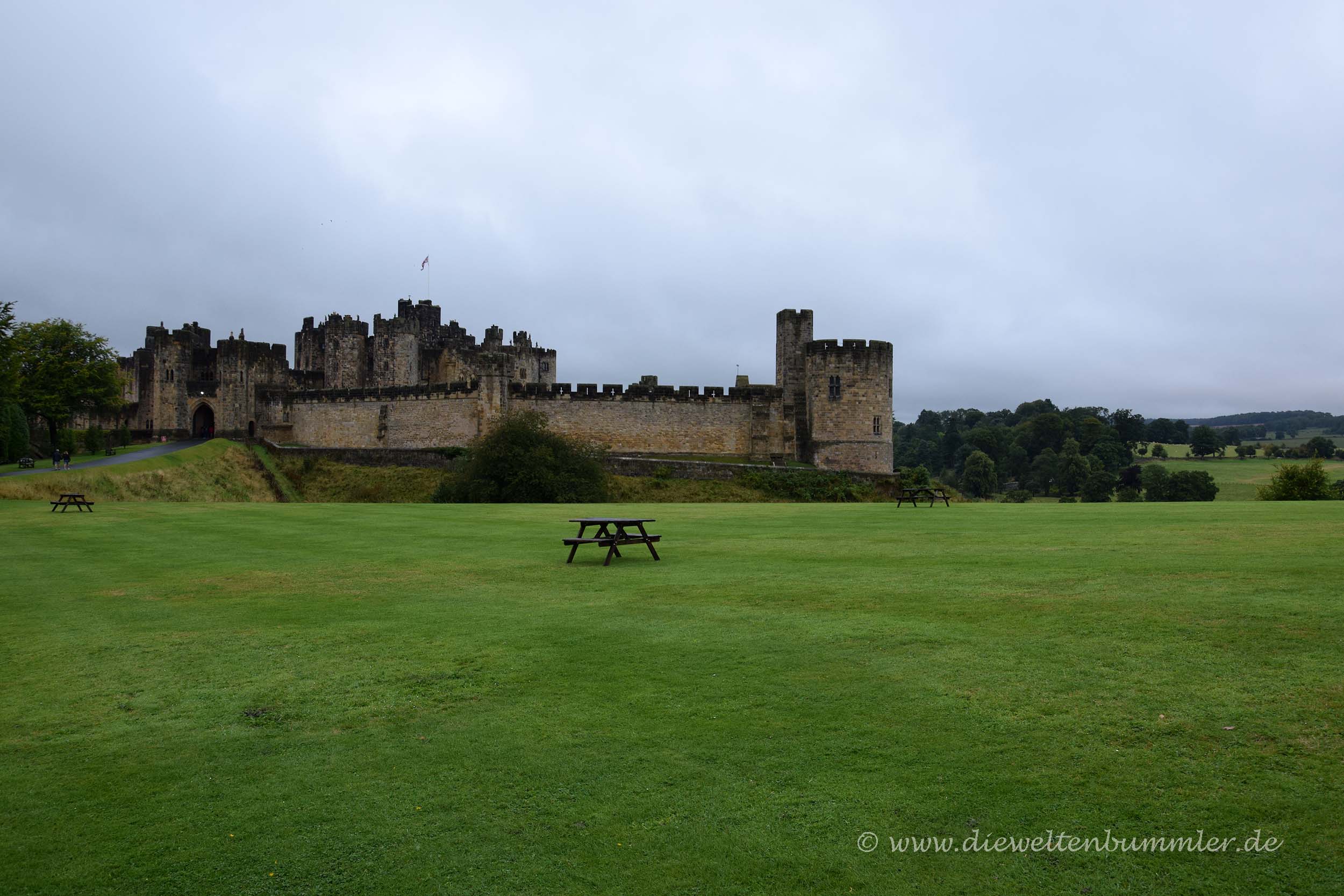 Netterweise ließ die junge Dame mit sich reden und wir durften für einige Bilder in die Grünanlage hinein. Da sie darum bat, nicht zum Schlosseingang zu gehen, weil sie dann Ärger bekommen würde, blieben wir natürlich nur auf der Wiese und machten einige Aufnahmen vom Schloss, die allerdings richtig schlecht geworden sind. Der Grund hierfür ist mangelndes Licht und viel, viel Regen. Im angrenzenden Alnwick Garden gab es gleichzeitig eine große Hochzeitsfeier und während wir wieder zum Wohnmobil zurückkehrten, kamen die zahlreichen Gäste an. Sie waren so gekleidet, als würden Kate und William hier noch einmal heiraten. Wir kamen uns mit unseren durchnässten Outdoor-Klamotten ziemlich fehl am Platze vor. Wobei eigentlich die Hochzeitsgäste die völlig falsche Kleidung für das Wetter hatten. Ein bisschen tat mir das Brautpaar leid. Sie hatten sicherlich sehr viel Geld für die Feier investiert, die nun im strömenden Regen stattfand.