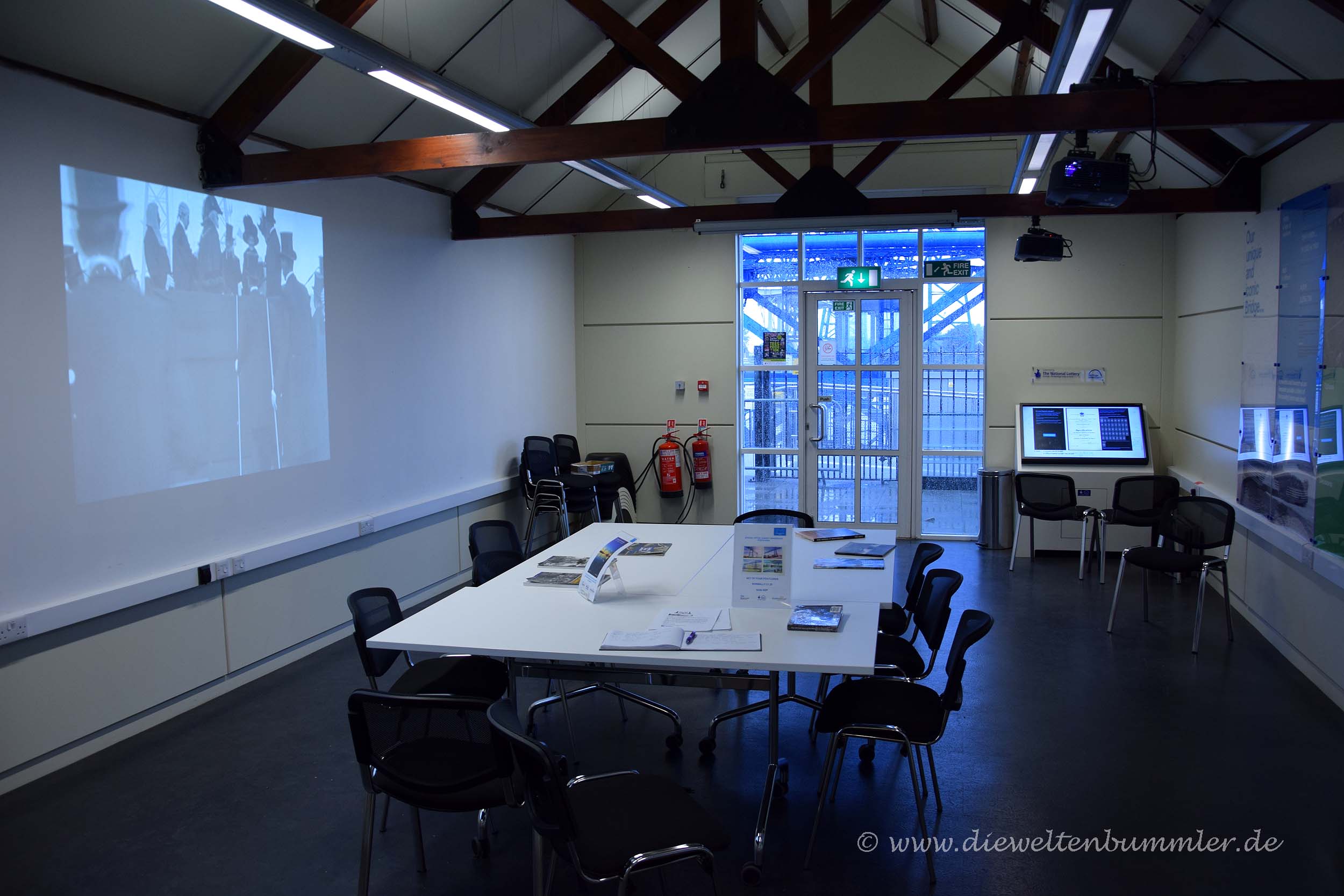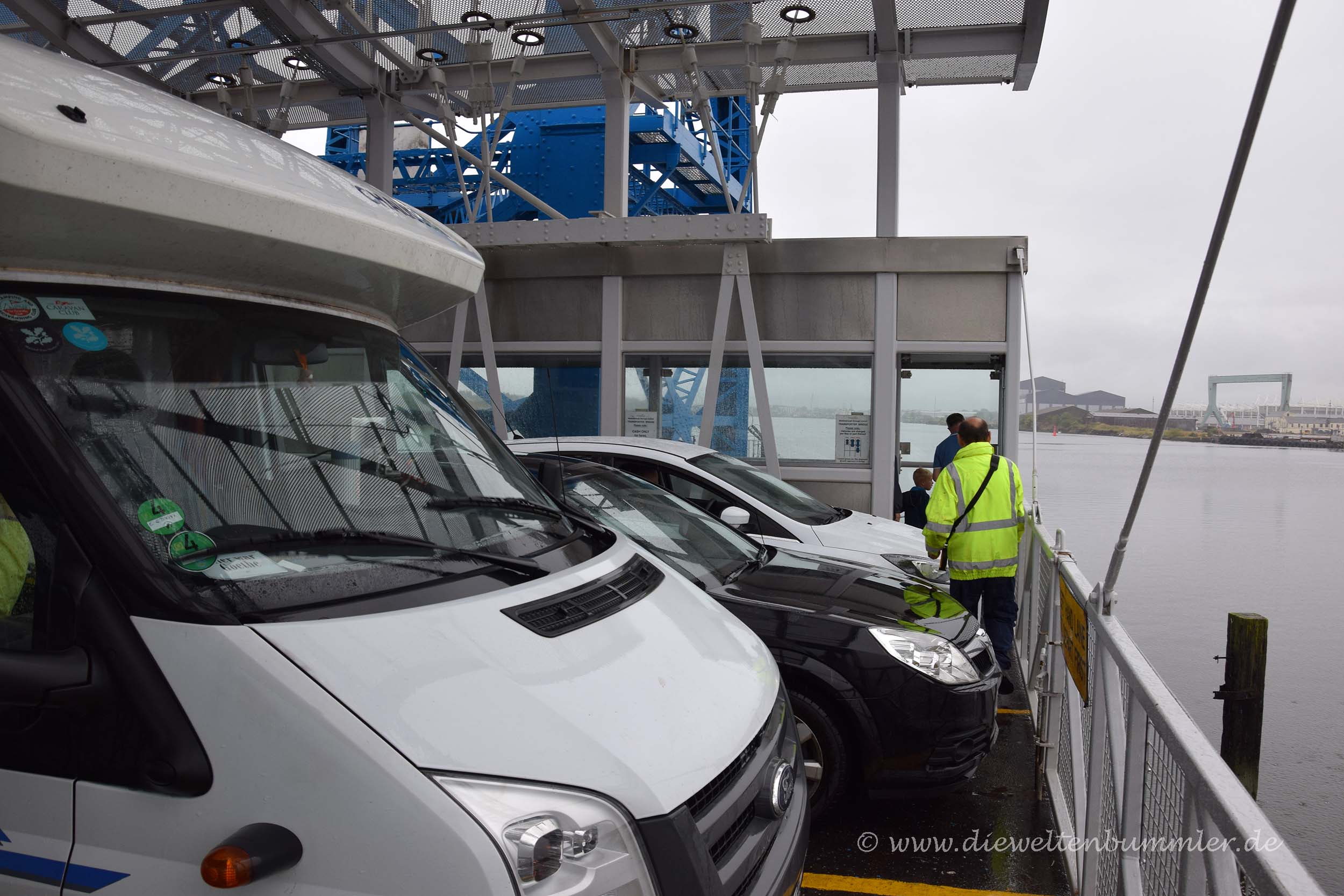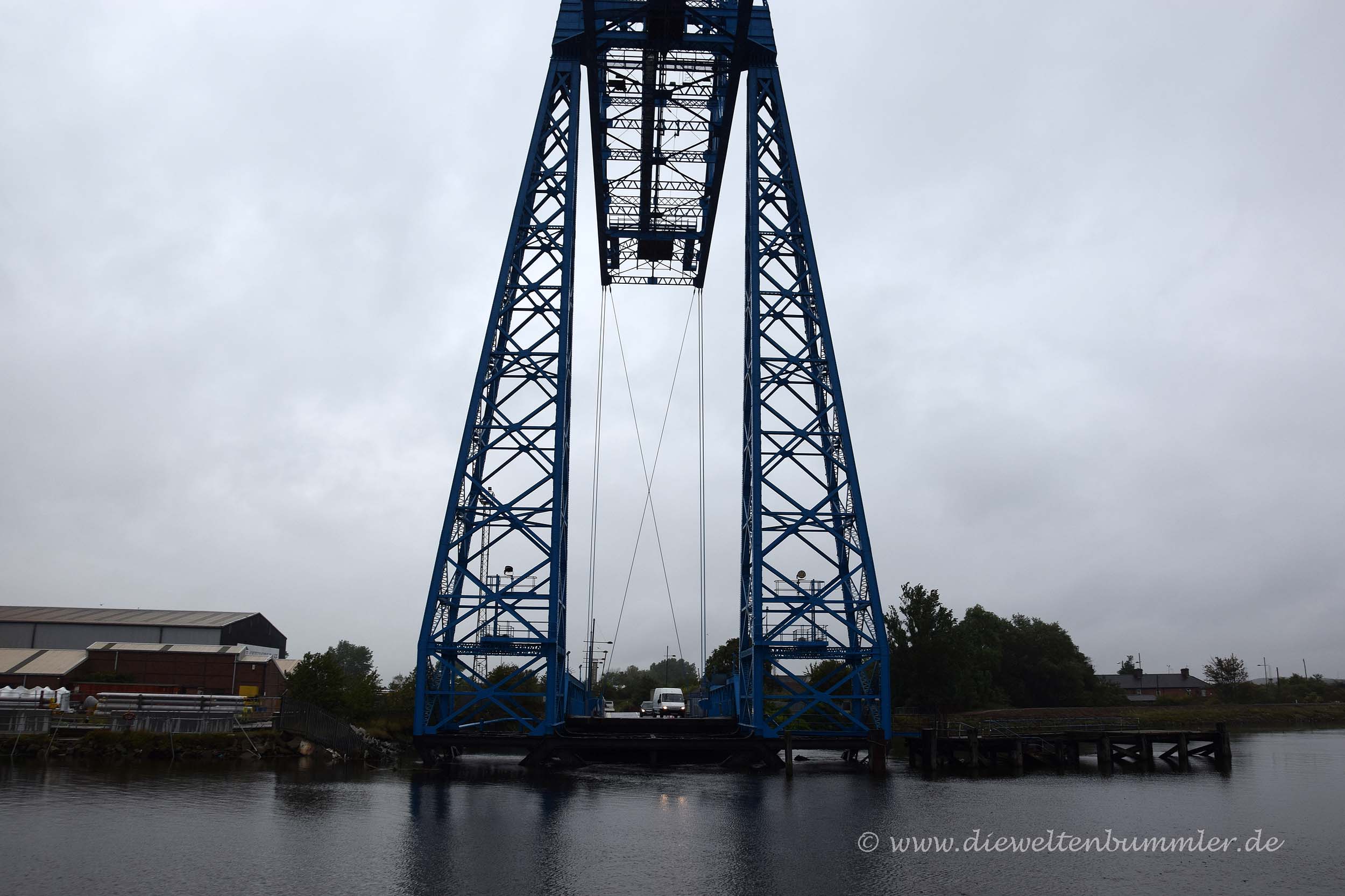 Verstärkt wurde die Hässlichkeit dieser Landschaft noch durch die extrem dunklen und tief hängenden Wolken, aus denen das Wasser nur so plätscherte. Auf der Schwebefähre hatten deutlich mehr Fahrzeuge Platz als in Newport in Wales, aber diese Schwebefähre hat für den Durchgangsverkehr auch noch eine wesentlich größere Bedeutung. Das war schon alleine daran zu spüren, dass die Fähre komplett voll war und es überhaupt nicht touristisch wirkte. Wir fuhren auf die Fähre auf, wurden über den Fluss gebracht und stiegen am anderen Ufer wenigstens kurz aus, um einen schnellen Blick in das kleine Besucherzentrum zu erhaschen. Aber wenigstens sind wir damit gefahren und das war unser Ziel. Hat wieder einmal Spaß gemacht.