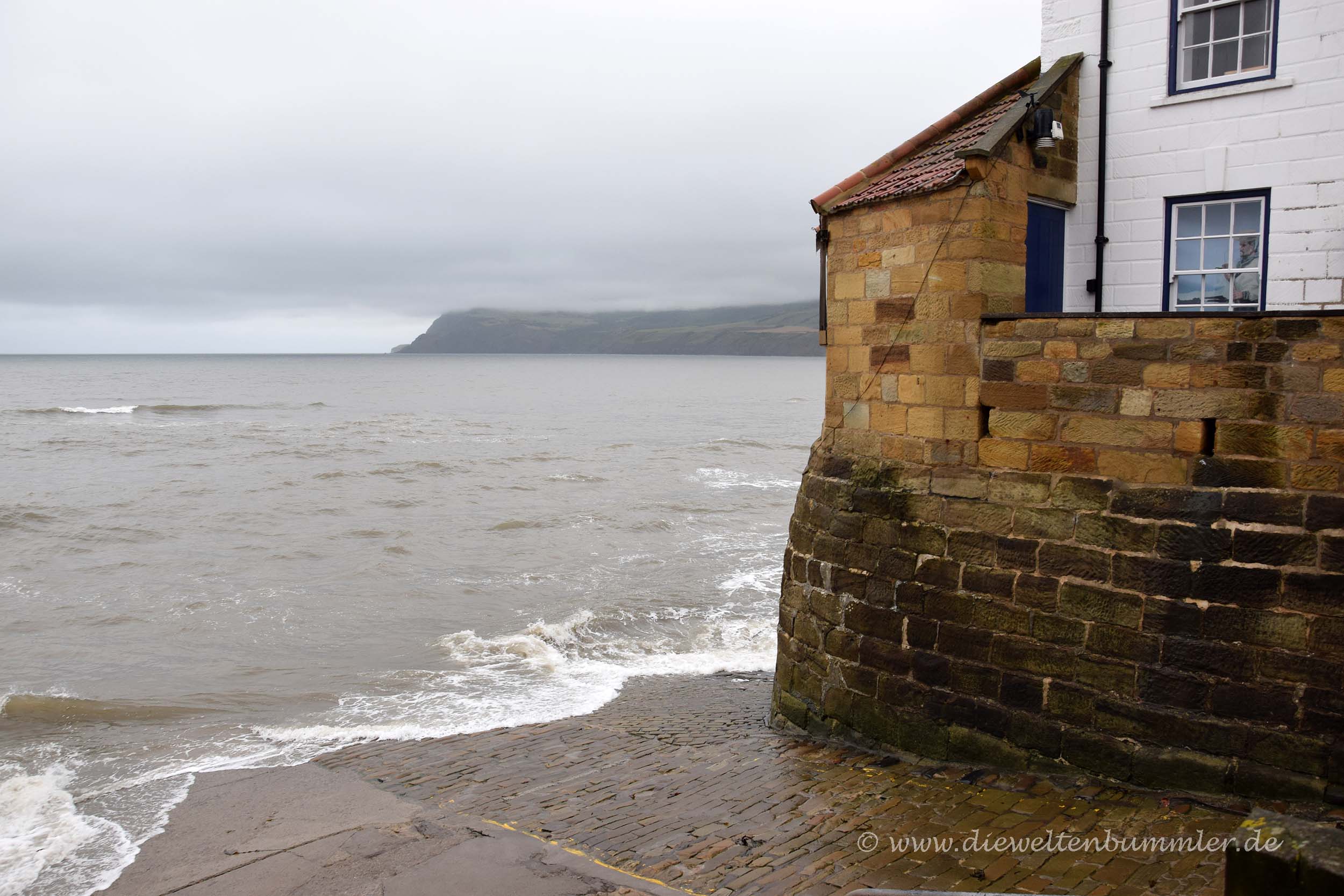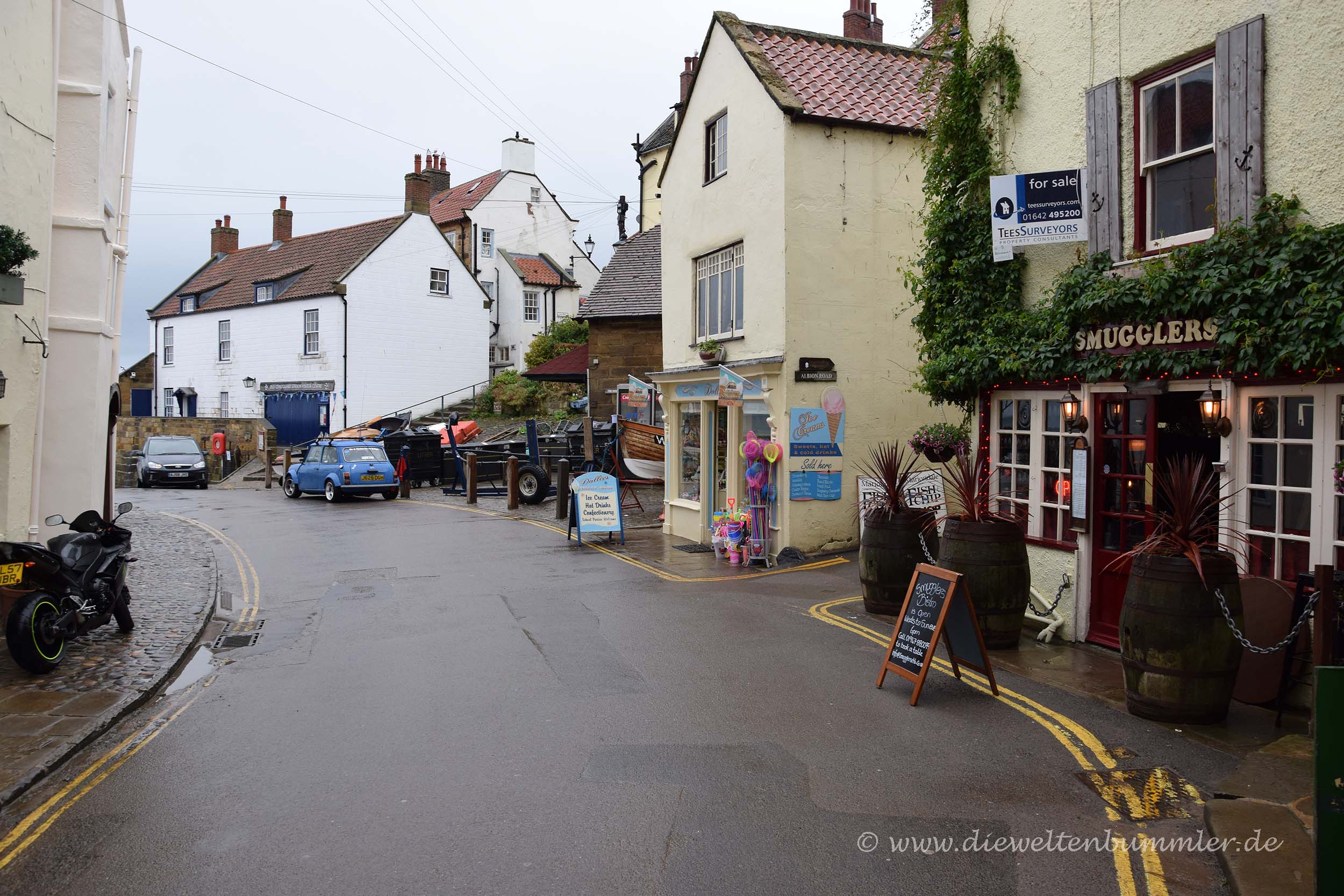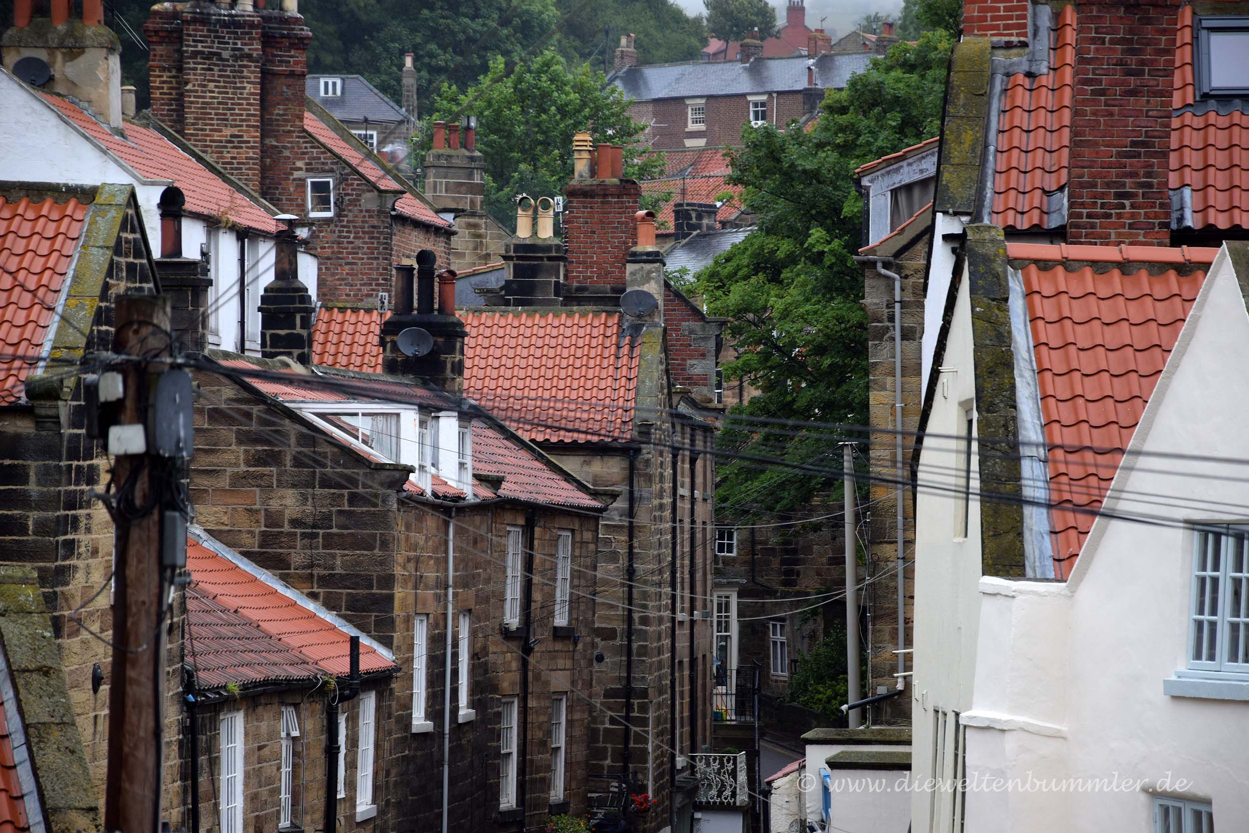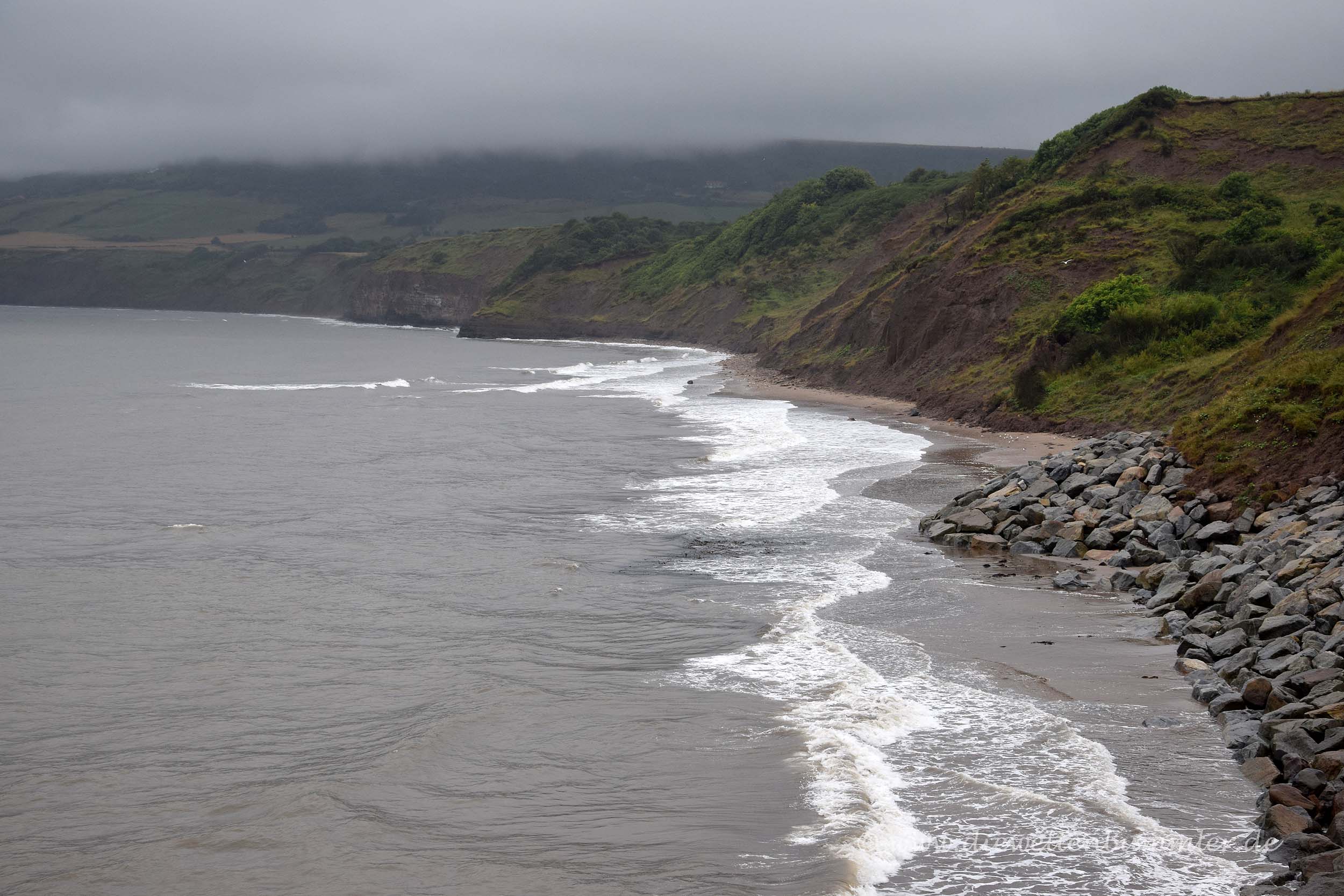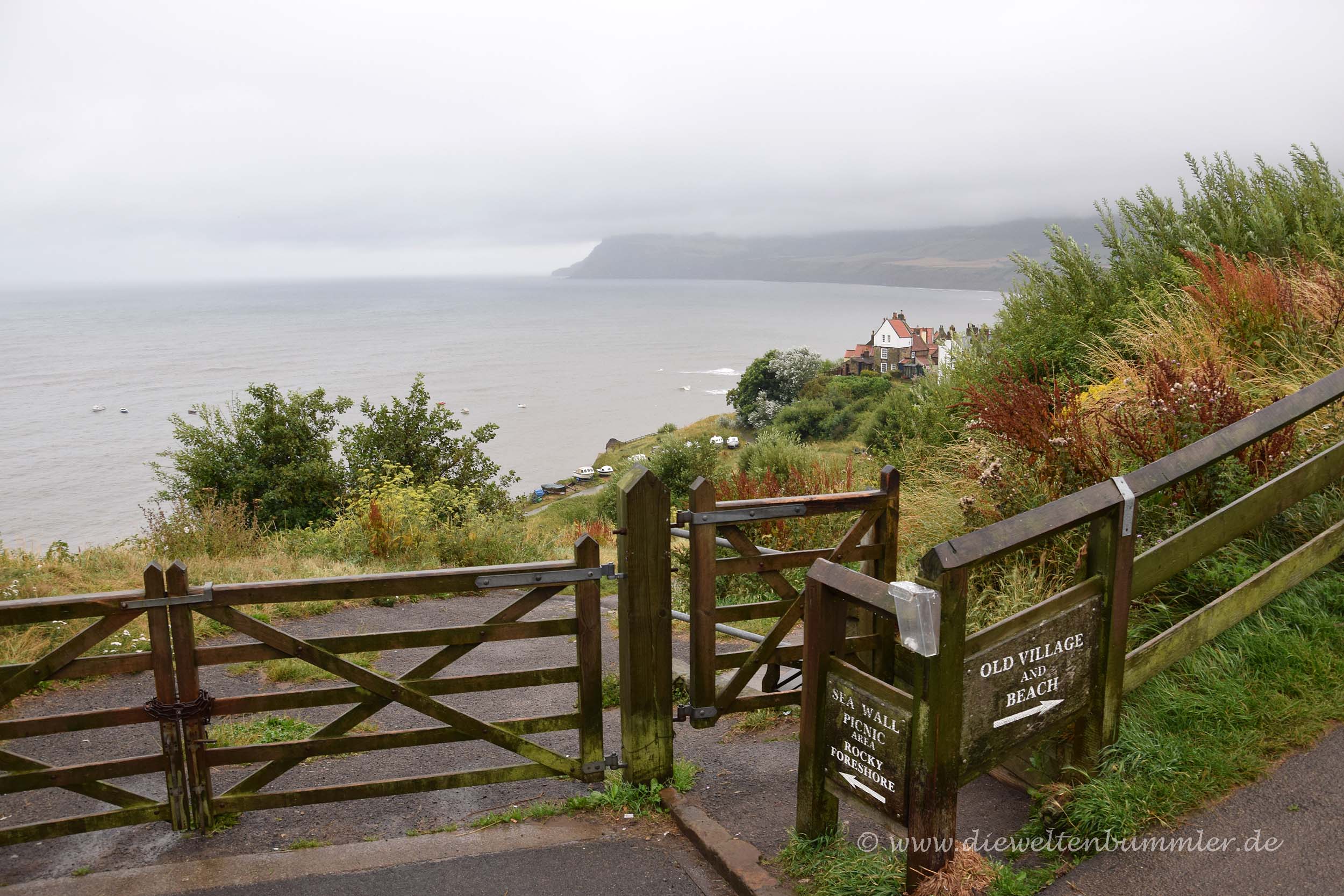 Da wir nach 18 Uhr ankamen, durften wir kostenlos parken. Na, das war doch schon mal etwas. Mittlerweile regnete es zwar nicht mehr, aber die Lichtverhältnisse waren einfach nicht besser geworden. Wir spazierten in den kleinen Ort hinein, den man nur zu Fuß erkunden kann. Zwischen schmalen Gässchen spazierten wir umher, gingen zum Ufer hinab und erkundeten den an sich hübschen Ort. Ein wenig erinnerte er uns an Manarola im italienischen Cinque Terre. Nur gab es den Unterschied, dass das Wetter in Italien trotz Jahreswechsel deutlich besser war als jetzt hier im Sommer. Nach dem Rundgang durch das Dorf fuhren wir ein Stück zurück, wo wir einen Campingplatz sahen. Wir dachten darüber nach, dort zu übernachten, um am nächsten Morgen noch einmal nach Robin Hoods Bay hinab zu gehen, falls das Wetter bis dahin besser sein würde.
