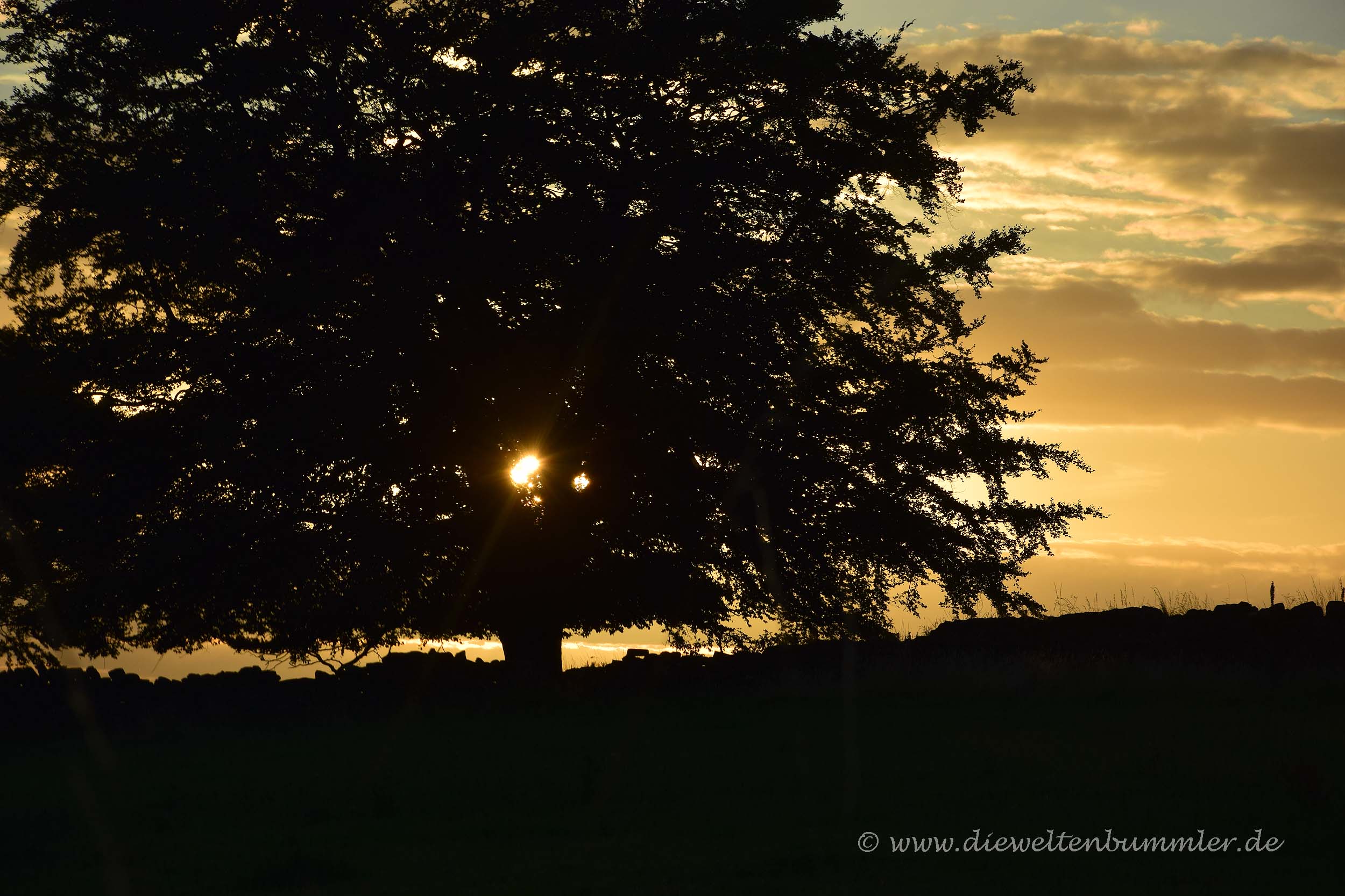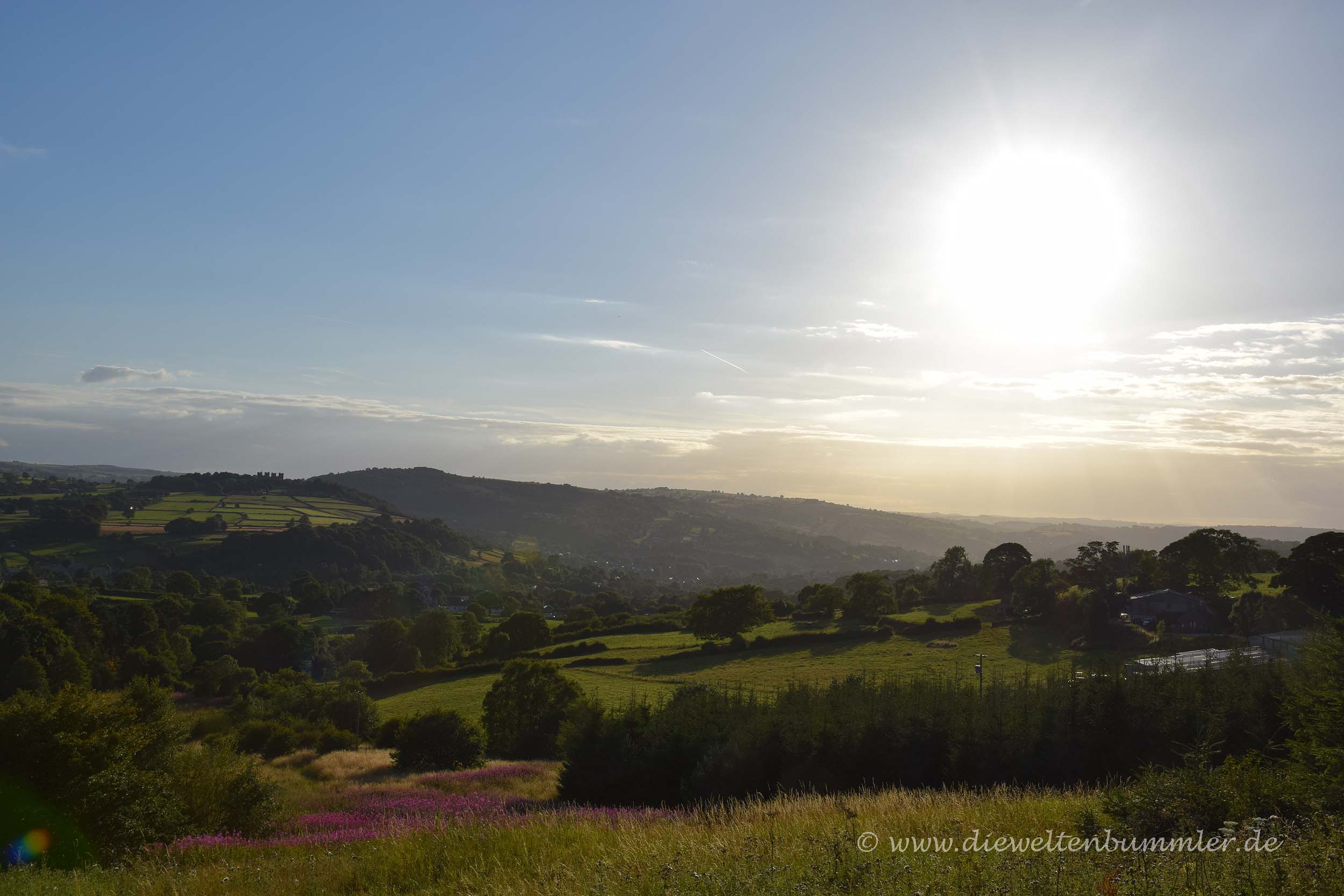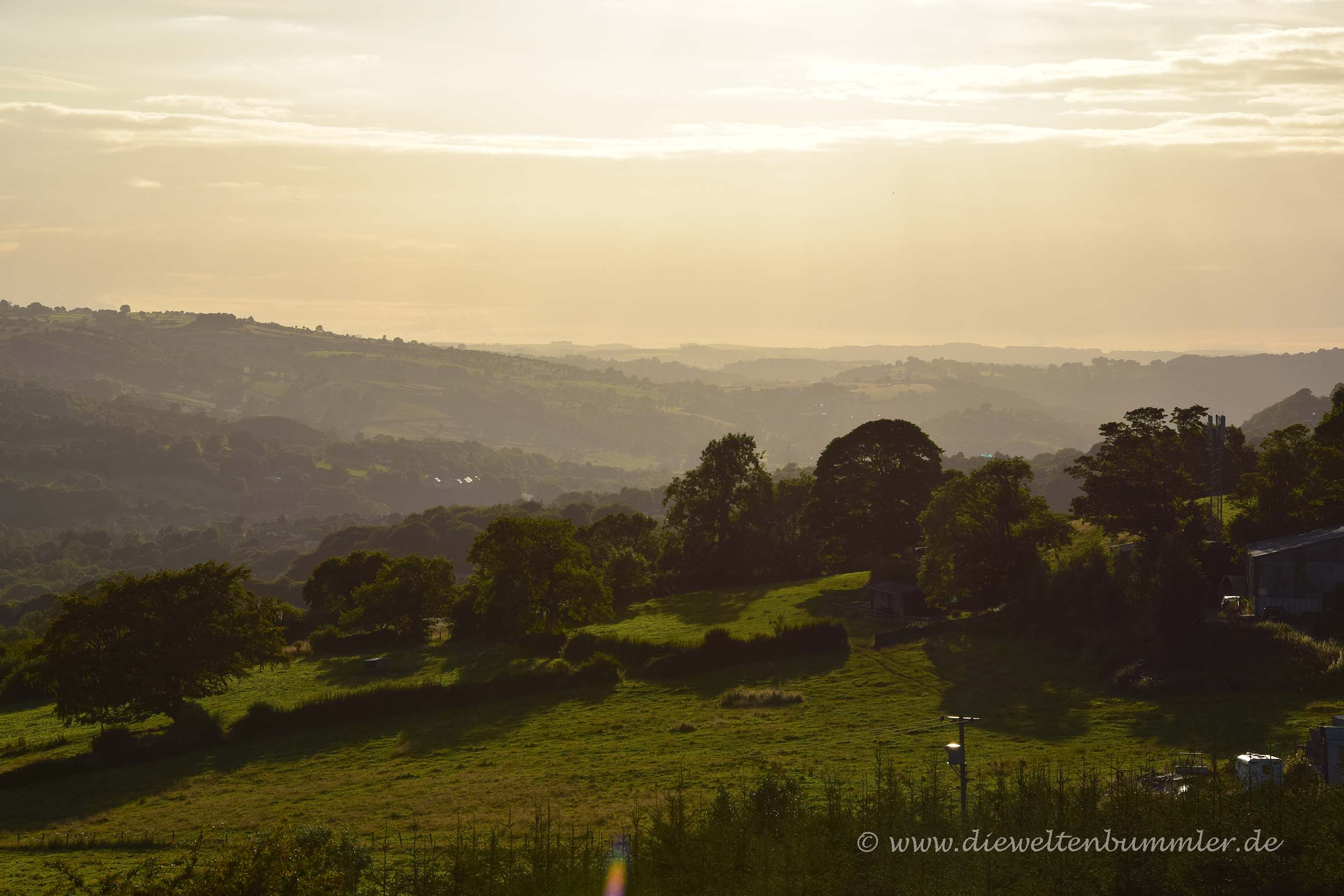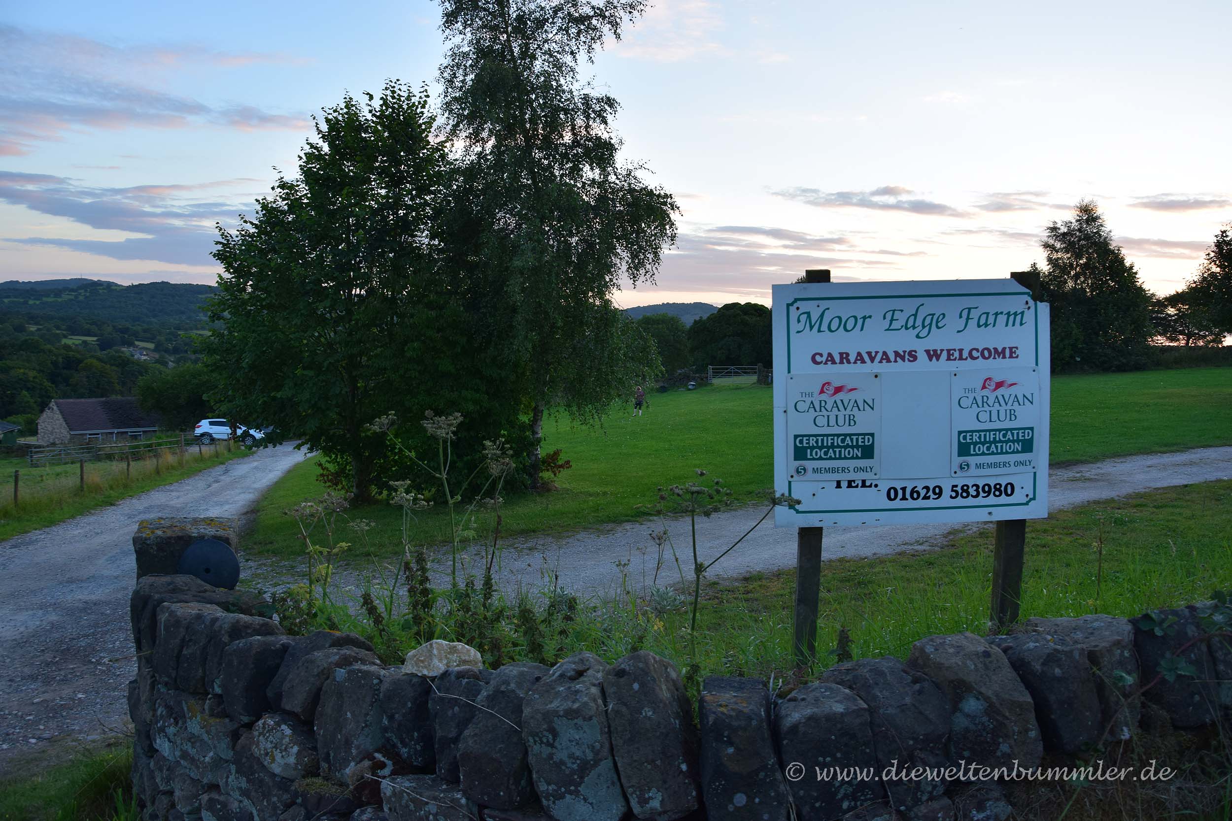 Wir fuhren noch zum Bahnhof von Matlock, wo ein Sainsburys uns zu weiteren Lebensmitteln verhalf und stöberten dann in unserem schlauen Buch vom Caravan Club. Auf einen großen, teuren Campingplatz hatten wir nämlich keine Lust und freies Stehen war hier undenkbar. Wir fanden auch eine Farm, die sich sehr nett anhörte. Sie befand sich nicht weit von Matlock entfernt und war in wenigen Minuten zu erreichen. Dort angekommen, waren wir mal wieder das letzte Fahrzeug, das gerade noch auf das Grundstück fahren durfte. Dort konnten wir nicht nur einen wunderschönen Ausblick mit Sonnenuntergang über den Peak District Nationalpark genießen, sondern kamen auch mit den anderen Campern in Kontakt.