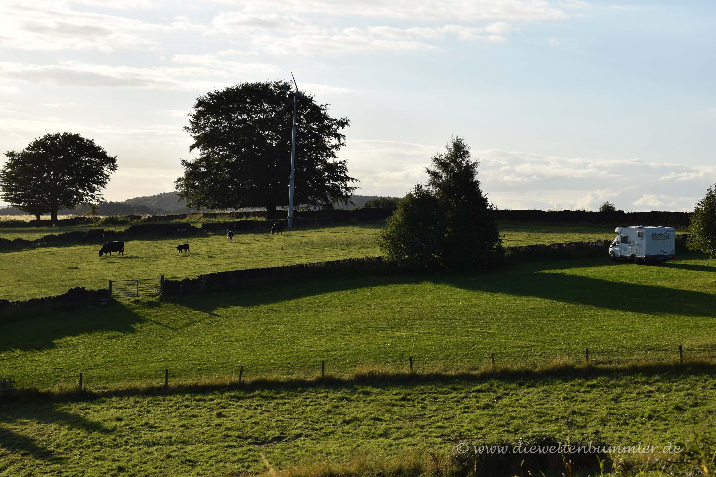Doch als wir am Campingplatz ankamen und nach den Preisen fragten, hatte ich es satt, auf teuren Campingplätzen zu übernachten. 20 Pfund wollte man für eine Stellfläche ohne Strom und direkt neben der Einfahrt also auch direkt neben der Landstraße haben. Eine andere Fläche wäre nicht frei. Na gut, das mag so sein. Aber dann möchte ich doch nicht den vollen Preis für einen noch nicht mal halb so gut gelegenen, stromlosen Platz bezahlen. Obwohl es uns eigentlich schon zu spät war, fuhren wir weiter und fanden glücklicherweise einen schönen Platz am Rande des North York Moors Nationalparks bei einem Privatmann, der sein Grundstück Mitglieder des Caravan Clubs bereithält.