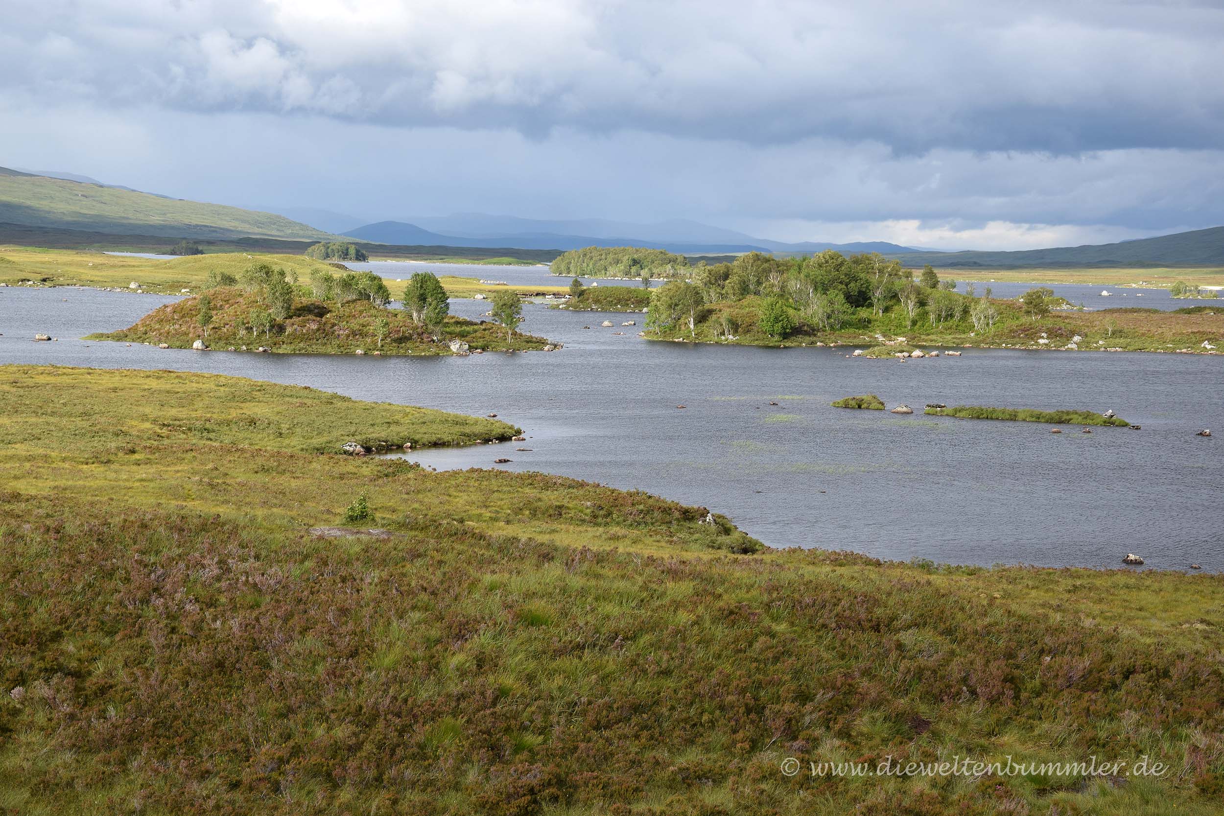 Also fuhren wir weiter, um an diesem Abend noch dorthin zu gelangen und dort zu übernachten. Die Rede ist vom Rannoch Moor bzw. vom Tal Glen Coe, wo wir schon beim letzten Mal von der Landschaft begeistert waren. Glen Coe und das Rannoch Moor gehen direkt ineinander über und sind eine der schottischen Landschaften, die wir eigentlich nicht noch einmal besuchen müssten, weil wir bereits genug Bildmaterial von dort hatten. Aber hier wollte ich einfach auch nochmal persönlich hin, ganz unabhängig von der Recherche für den Reiseführer. So fuhren wir also nach Tyndrum, wo wir sofort ein Geschäft wieder erkannten, in dem wir zwei Jahre zuvor einkaufen waren. Von dort ging es dann am Loch Tulla vorbei zu einem Aussichtspunkt, von dem aus man einen prächtigen Blick auf den See hat.