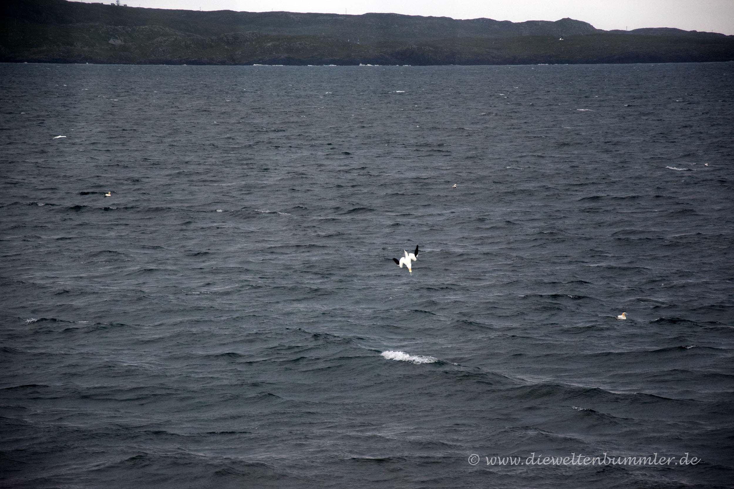 Auf einer Seekarte konnten wir sehen, dass das der übliche Seeweg ist und es keine direkte bzw. gerade Verbindung zwischen den beiden Häfen geben konnte. Dadurch dauerte die Fahrt für das eigentlich kurze Stück doch recht lange. Aber das war nicht schlimm. So konnten wir nämlich dann auch bezahlen. Und die Bezahlung des Tickets sah so aus, dass mitten in dem Aufenthaltsraum, wo die Passagiere sitzen konnten, ein kleines Büro existierte. Dieses wurde von einem Steward aufgeschlossen und man stand Schlange, um sein Fährticket zu bezahlen. Gut, von einer Menschenschlange zu sprechen, ist bei vier Personen vielleicht ein wenig übertrieben, aber so in etwa war das halt. Erstaunlicherweise funktionierte die Bezahlung mit Kreditkarte auf hoher See nicht nur reibungslos, sondern auch extrem schnell. Den Rest der Fahrt verbrachte ich damit, Basstölpel zu beobachten, wie sie im Sturzflug in die Wellen eintauchten und sich ihre Nahrung besorgten.