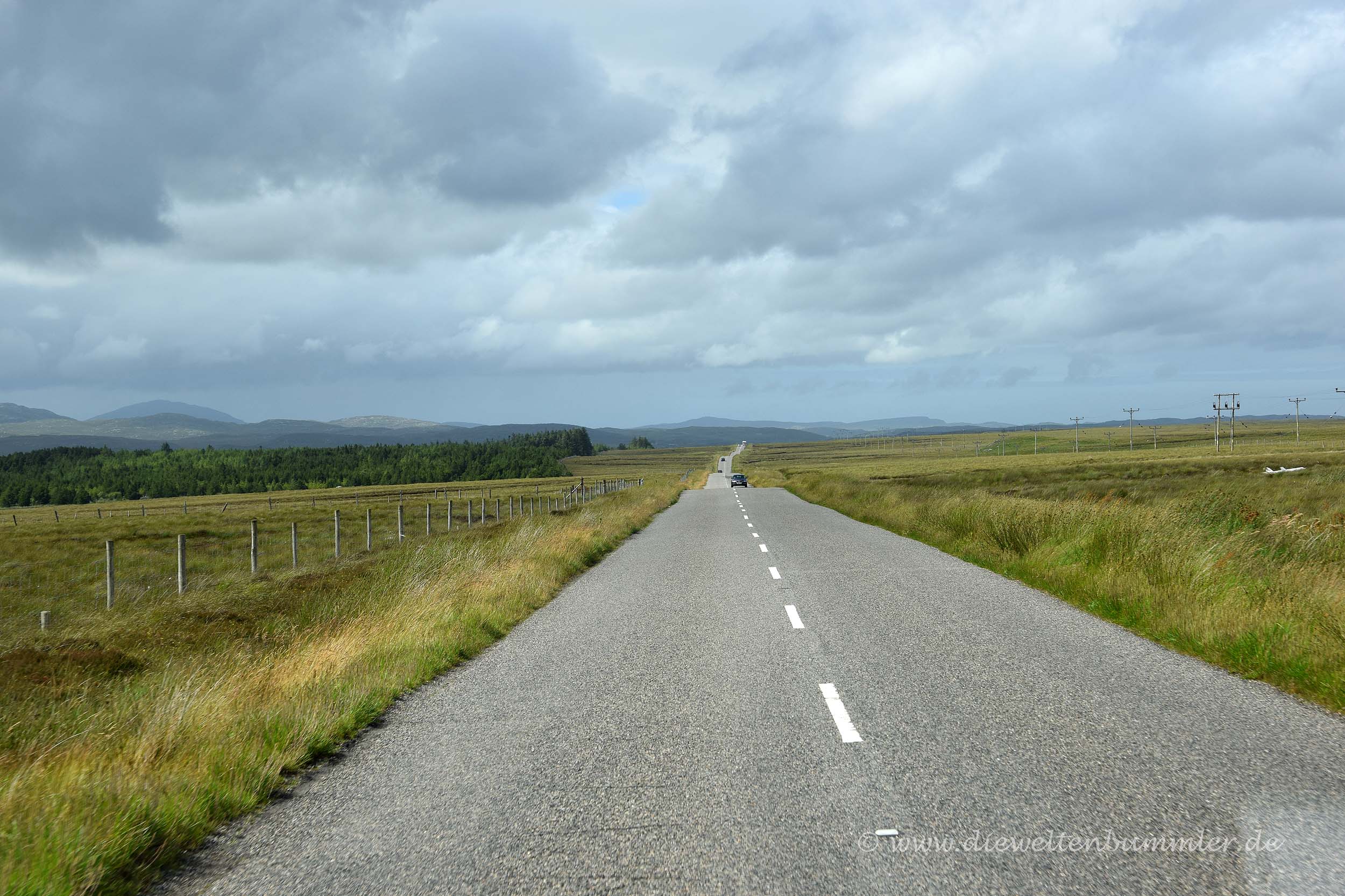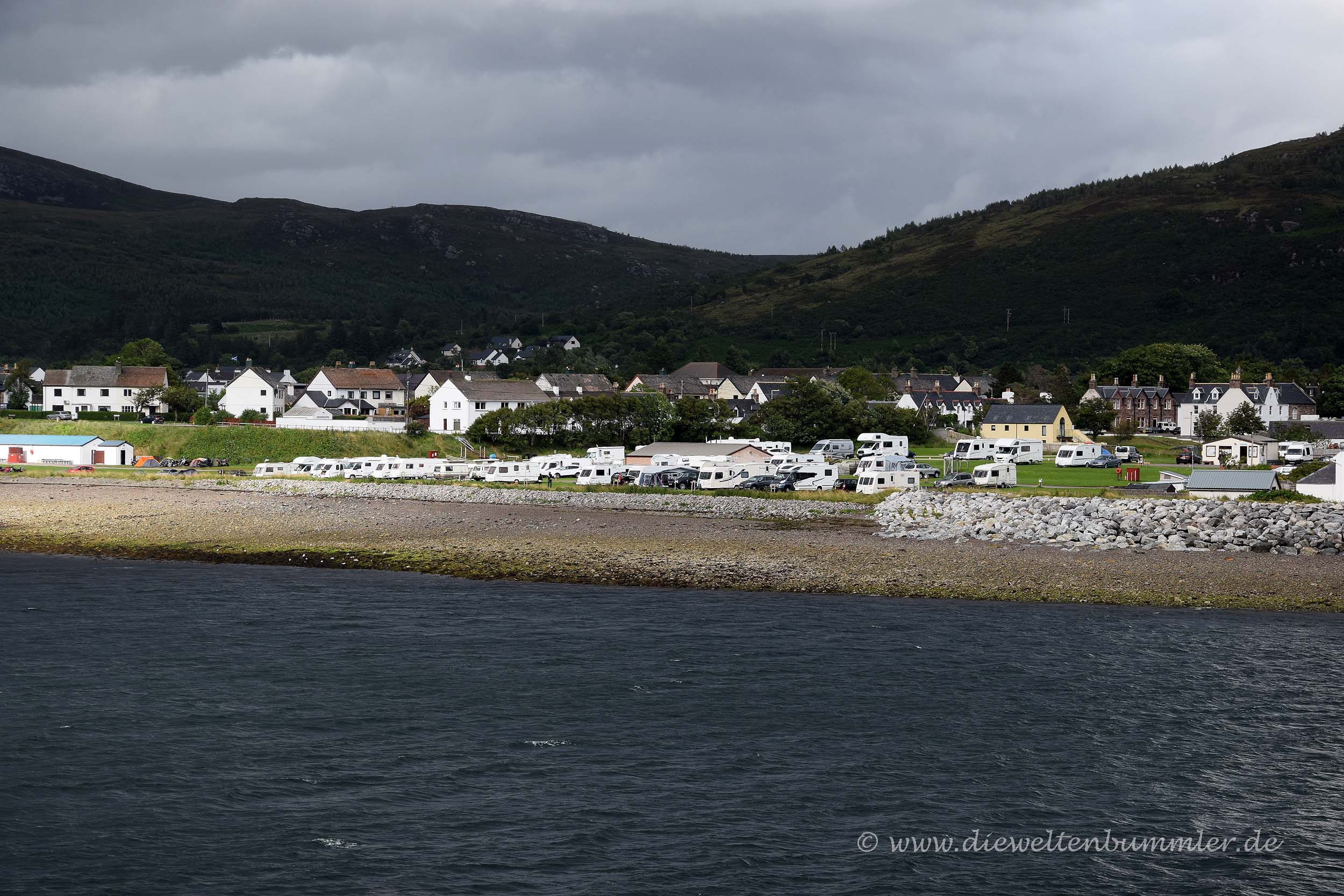 Kurz hinter dem Ardwreck Castle bogen wir rechts ab, und machten sofort wieder Halt. Dieses Mal bestand der Grund aber aus einer rollenden Sehenswürdigkeit. Ganz 18 italienische Wohnmobile kamen uns entgegen, die in einer geführten Tour durch Schottland reisten. Wir hatten später nach dieser Tour gegoogelt und tatsächlich den Reiseanbieter gefunden. Das was wir noch vorhatten, hatten diese Wohnmobiltouristen gerade hinter sich. Allerdings legten sie sogar ein deutlich schnelleres Tempo zurück als wir, denn ihr Tag begann morgens noch auf den Orkney-Inseln. Wir freuten uns zwar auch auf die Orkney-Inseln, doch so eilig, dort hinzukommen, hatten wir es noch nicht. Gerade hier in den schottischen Highlands gab es ja noch einiges zu entdecken.