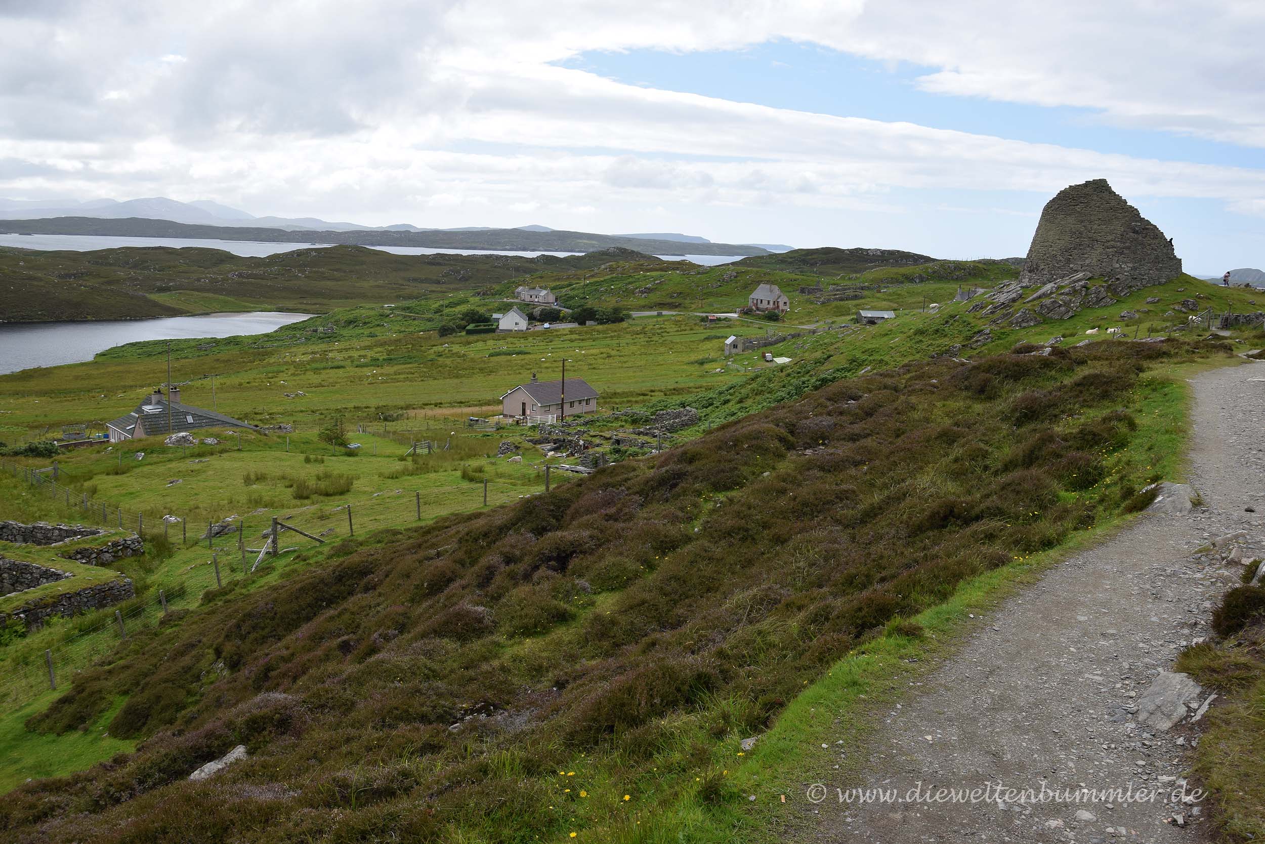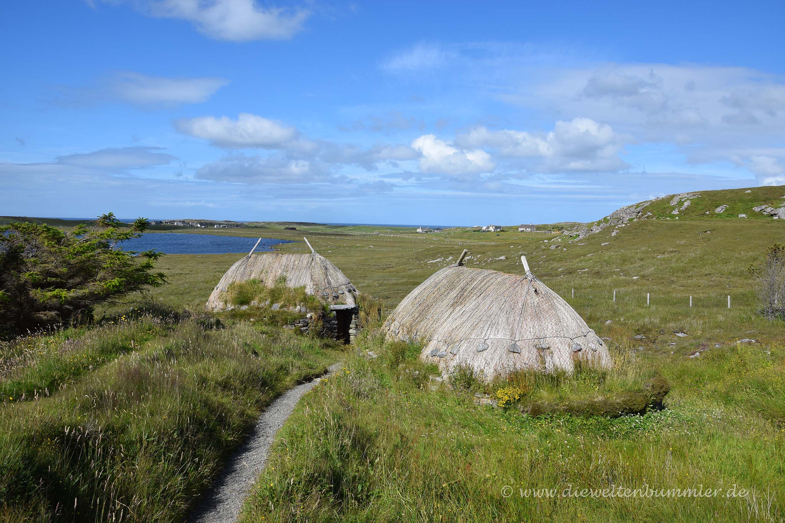 Am Loch Raoinebhat gab es einen weiteren Parkplatz. Von diesem führte ein kleiner Wanderweg zu alten Mühlen, die ganz im Stile der früheren Häuser der Inseln gebaut wurden. Diese gefielen uns gut. Das könnte einerseits daran liegen, dass das Wetter nun deutlich besser war und wir sogar gelegentlich blauen Himmel genießen durften aber auch daran, dass diese historischen Häuser mit ihren Reetdächern deutlich schöner wirkten als die modernen Wohnhäuser, die grau, blass und irgendwie trostlos wirkten. Das war etwas, was uns auf den Hebriden ebenfalls auffiel.
