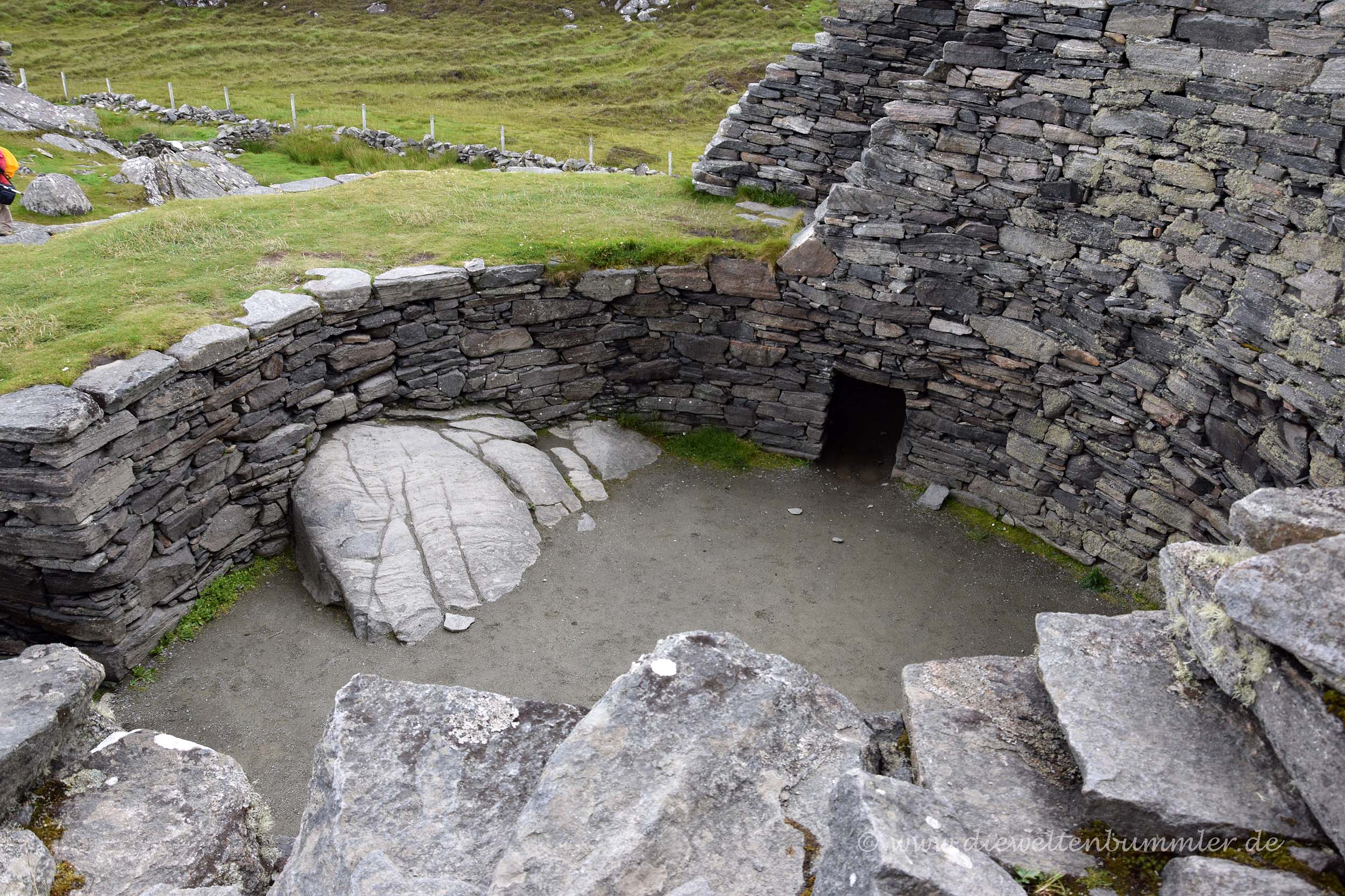 Als wir zum Parkplatz zurückkehrten, sahen wir dort das Auto des deutschen Pärchens. Ich blickte noch einmal in Richtung Freilichtmuseum und sah die beiden plötzlich mitten in dem Museum herumlaufen. Ich war etwas überrascht, denn das konnte nur bedeuten, dass sie das Museum außen herum betreten haben mussten. Der einzige offizielle Eingang war der an der Shop-Kasse vorbei, wo wir uns die ganze Zeit aufhielten. Und da sie nach uns ankamen, hätten wir das sehen müssen, wenn sie bezahlt hätten. Anscheinend hatten sie das nicht, was mich ein wenig ärgerte, denn in diesem Moment war es mir peinlich, zu diesen Landsleuten zu gehören. Besonders so weit abseits der Touristenströme ist das Leben auf den Hebriden sicherlich nicht einfach für die Einheimischen. Wenn man sich dann schon für eine Sehenswürdigkeit interessiert, dann sollte man auch den geforderten Eintritt bezahlen oder es eben sein lassen. Aber so etwas gehört sich einfach nicht.