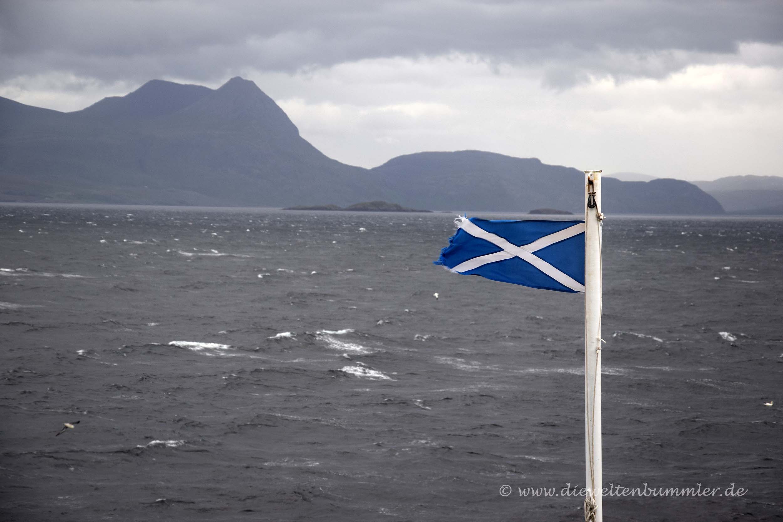 Rund eine halbe Stunde, bevor das Schiff in Ullapool auf dem schottischen Festland anlegen sollte und es auch wieder völlig ruhig fuhr, machte ich mich auf die Suche nach Moni. Ich schnappte mir unsere Jacken sowie Taschen und ging vollbepackt zu den ersten Toiletten, die auf dem Weg lagen. Dort fragte ich eine wartende Dame, ob sie mal nachschauen könnte, was sie auch tat. Aber bereits als sie die Tür öffnete, sah ich Moni schon kreidebleich im Vorraum stehen. Ihr ging es wirklich nicht gut und war froh, dass das Schiff nun mittlerweile ruhiger unterwegs war. Die letzten Minuten ruhte sie sich noch liegend in der ruhigen Lounge aus. Sie kommentierte diese Überfahrt damit, dass sie für sie schlimmer gewesen sei, als die damalige Fahrt mit dem Frachtschiff über den Atlantik nach Südamerika.
