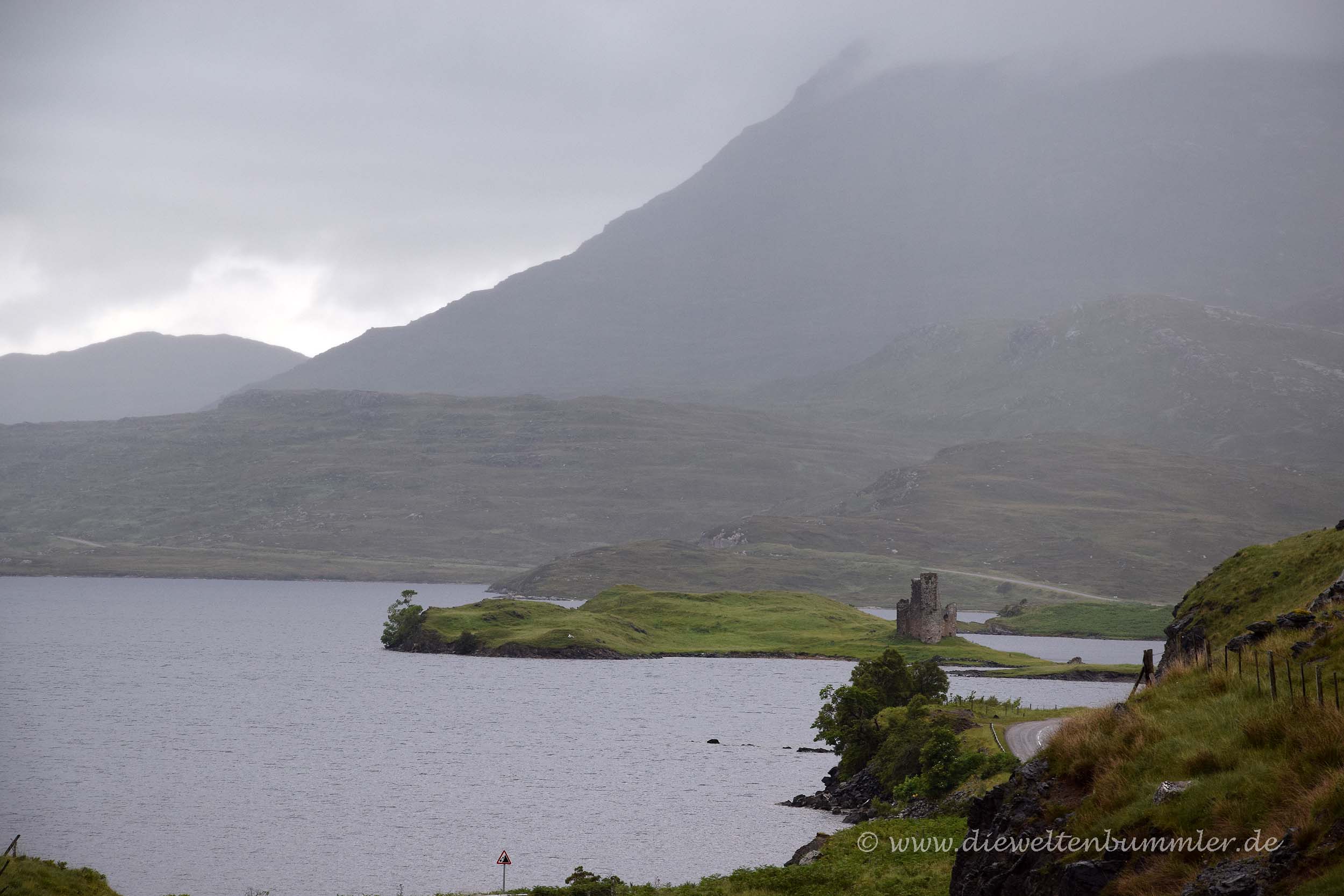 In Ullapool angekommen, waren wir ganz froh, dass bei dem Geschaukel alles mit dem Wohnmobil in Ordnung war. Man weiß ja nie, ob andere Fahrgäste wirklich die Handbremse angezogen haben. Wir schauten in der Stadt noch schnell bei Tesco rein, kauften ein paar Kleinigkeiten und fuhren bei weiterhin schlechtem Wetter nordwärts. Am Loch Assynt stoppten wir erst wieder, um einen Blick auf das Ardwreck Castle zu werfen. Es war gerade eine kurze Regenpause, die wir nutzen wollten, doch wir hatten den Parkplatz keine 50 Meter verlassen, als sich die Schleusen des Himmels wieder öffneten und es in Strömen herunter regnete.