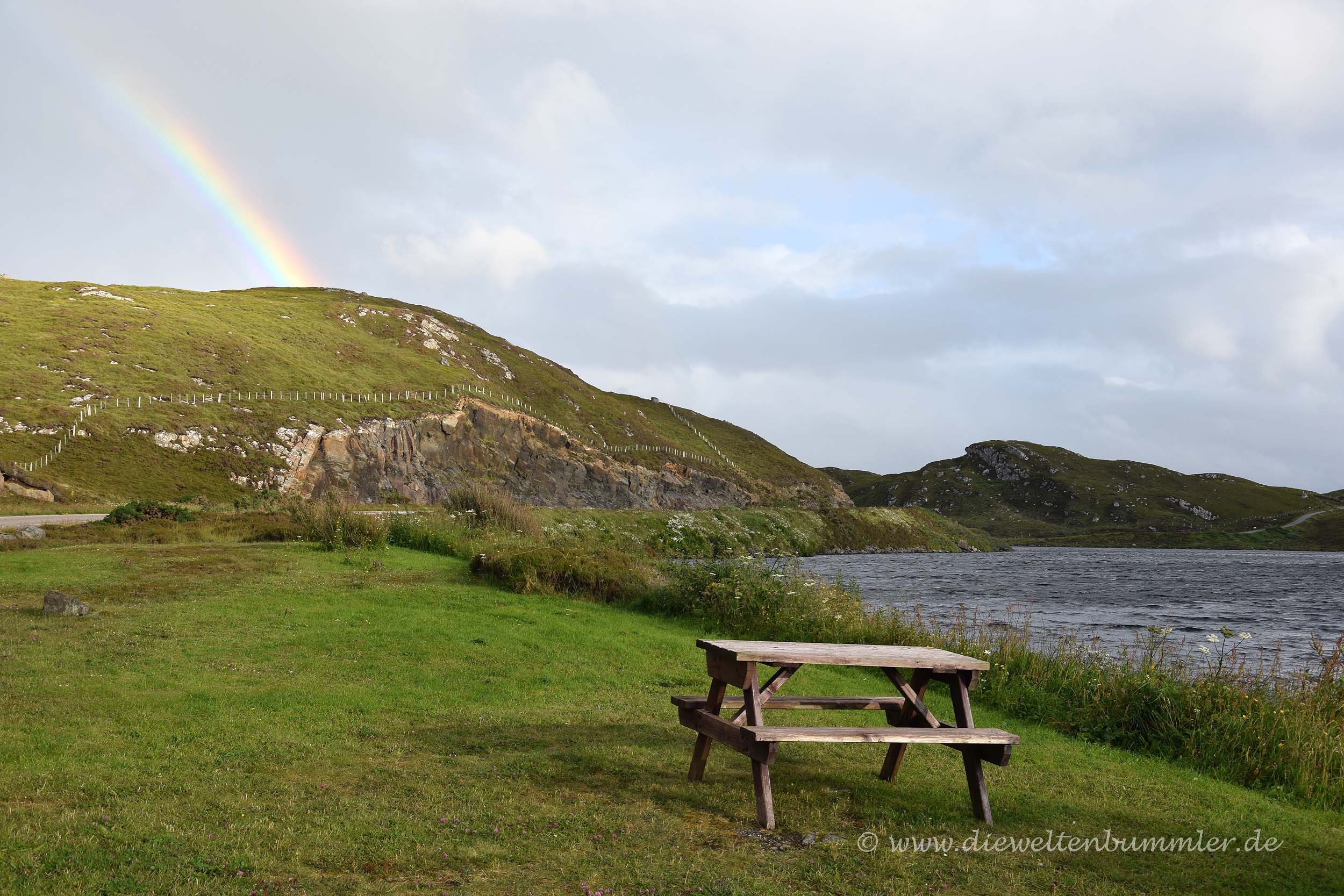 Bei Kylesku hielten wir noch an einer Brücke an, die einen schönen Blick auf einen Loch ermöglichte. Dieser wiederum erinnerte uns schon sehr an norwegische Fjorde und wir stellten abermals fest, dass Schottland landschaftlich sehr schön ist. Schade nur, dass wir das nicht auch mal bei Sonnenschein genießen konnten. Doch als der Regen irgendwann später doch mal aufhörte und sogar die Wolken ein wenig verschwanden, wurde unsere Wettergeduld wenigstens mit einem schönen Regenbogen belohnt. Nur zum Übernachten fanden wir leider keinen geeigneten Platz, bis ich plötzlich links einen kleinen Campingplatz direkt an der Küste fand. Da es nun schon nicht mehr ganz so früh war und wir nach dieser aufregenden Schiffsreise auch mal Entspannung vertragen konnten, fuhr ich spontan zur Rezeption, zahlte leidige 20 Pfund und sicherte uns einen Stellplatz an der Steilküste mit Blick auf das Meer.