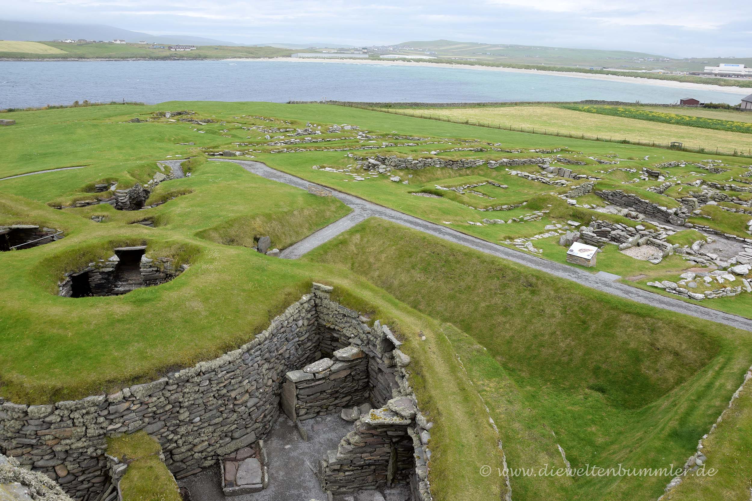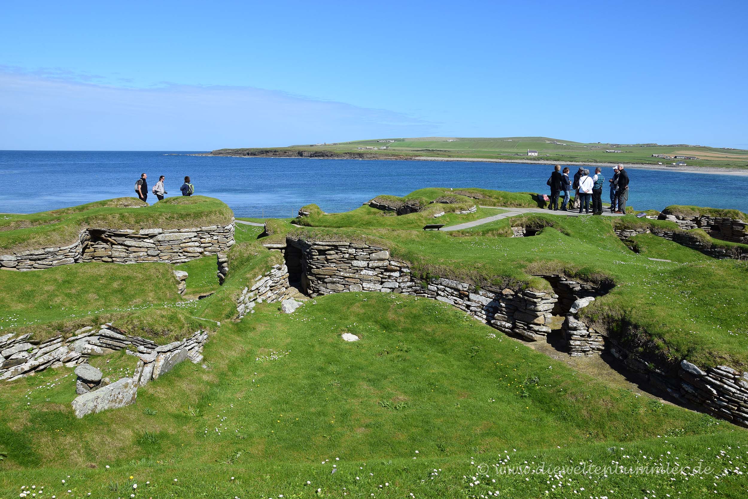 Von einer kleinen behelfsmäßigen Tribüne konnten wir dem Treiben der Forscher ein wenig beiwohnen. Danach wollten wir endlich die Orkney-Inseln erkunden, setzten uns ans Steuer und fuhren westwärts zu Skara Brae. Diese prähistorische Siedlung befindet sich direkt an der Küste und ist kostenpflichtig. Die Siedlung wurde erst Mitte des 19. Jahrhunderts entdeckt und ist für die Orkney-Inseln sehr bedeutsam. Kein Wunder also, dass sie zusammen mit einigen anderen frühzeitlichen Funden auf der Liste der Weltkulturerben eingetragen ist, dazu zählt zum Beispiel der bereits besuchte Ring of Brodgar. Bei strahlen schönem Sonnenschein gingen wir hinein und schauten uns Skara Brae in Ruhe an, wobei ich sagen muss, dass es räumlich nicht besonders groß ist. Nun ja, es war ja auch keine Metropole, sondern eine steinzeitliche Siedlung.