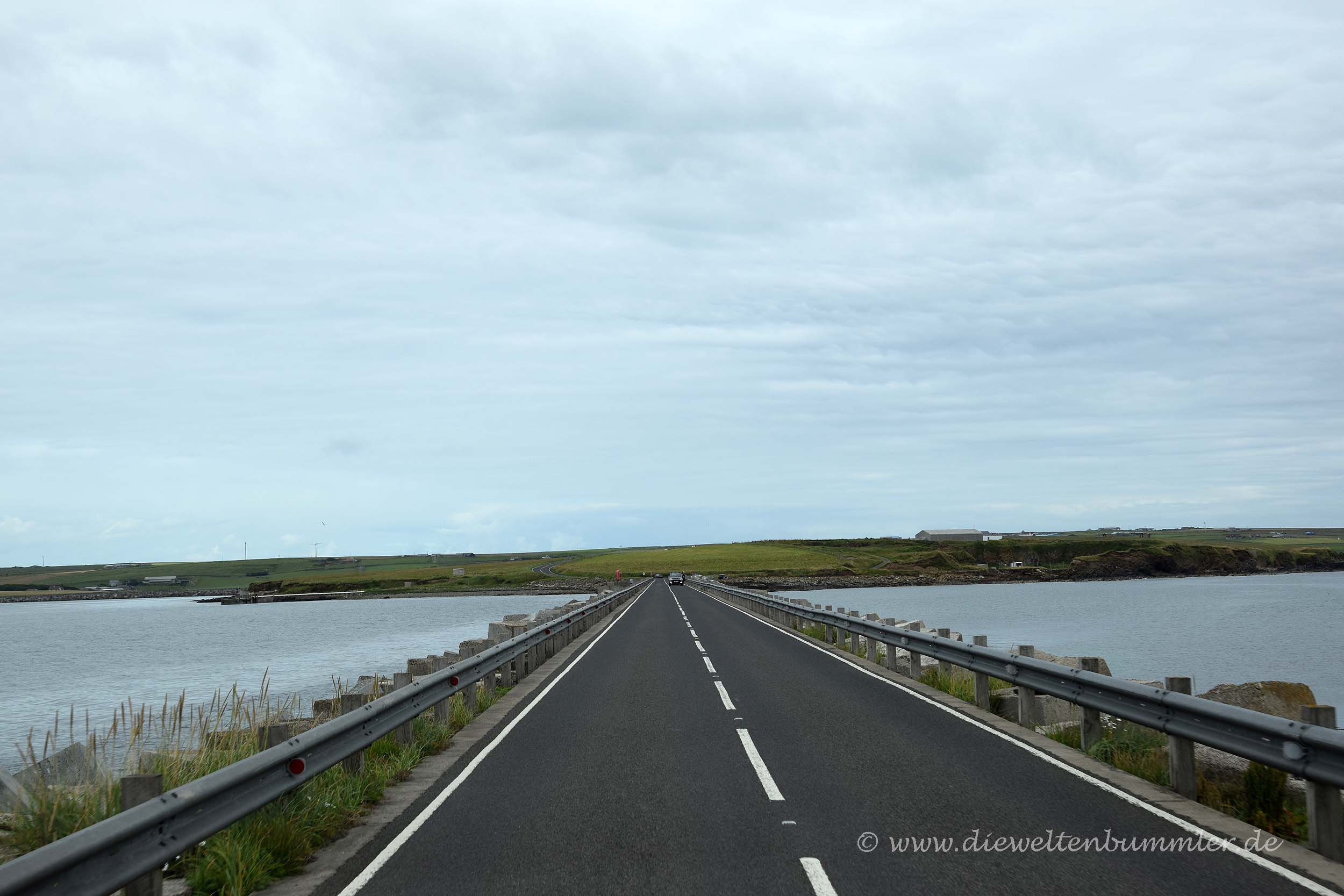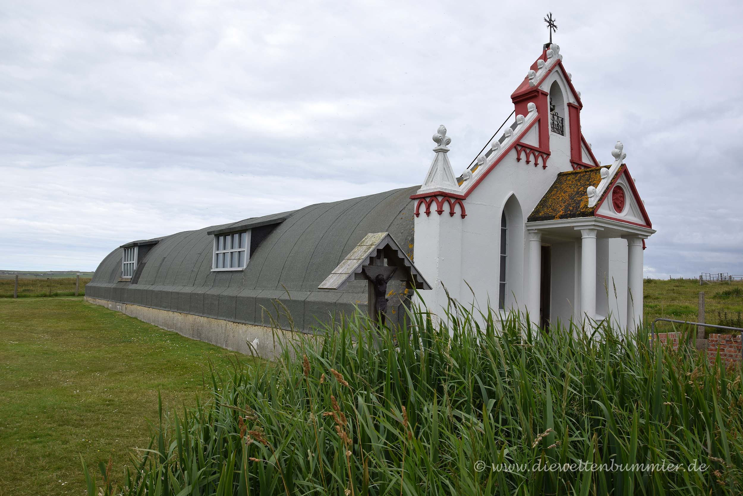 Von dort aus fuhren wir dann einmal quer über die Insel zu dem Ziel, wo wir eigentlich am Vorabend übernachten wollten. Südöstlich von Mainland befinden sich mehrere kleine Inseln, die mit den sogenannten Churchill-Barrieren miteinander verbunden sind. Es handelt sich dabei um Dämme, die auf Geheiß von Winston Churchill gebaut wurde, um die dortige Bucht vor den Angriffen der Deutschen zu schützen. Gebaut wurden sie schließlich unter anderem von italienischen Kriegsgefangene. Und eben diese Kriegsgefangenen errichten in klassischen militärischen Wellblechhütten die sogenannte Italienische Kapelle.