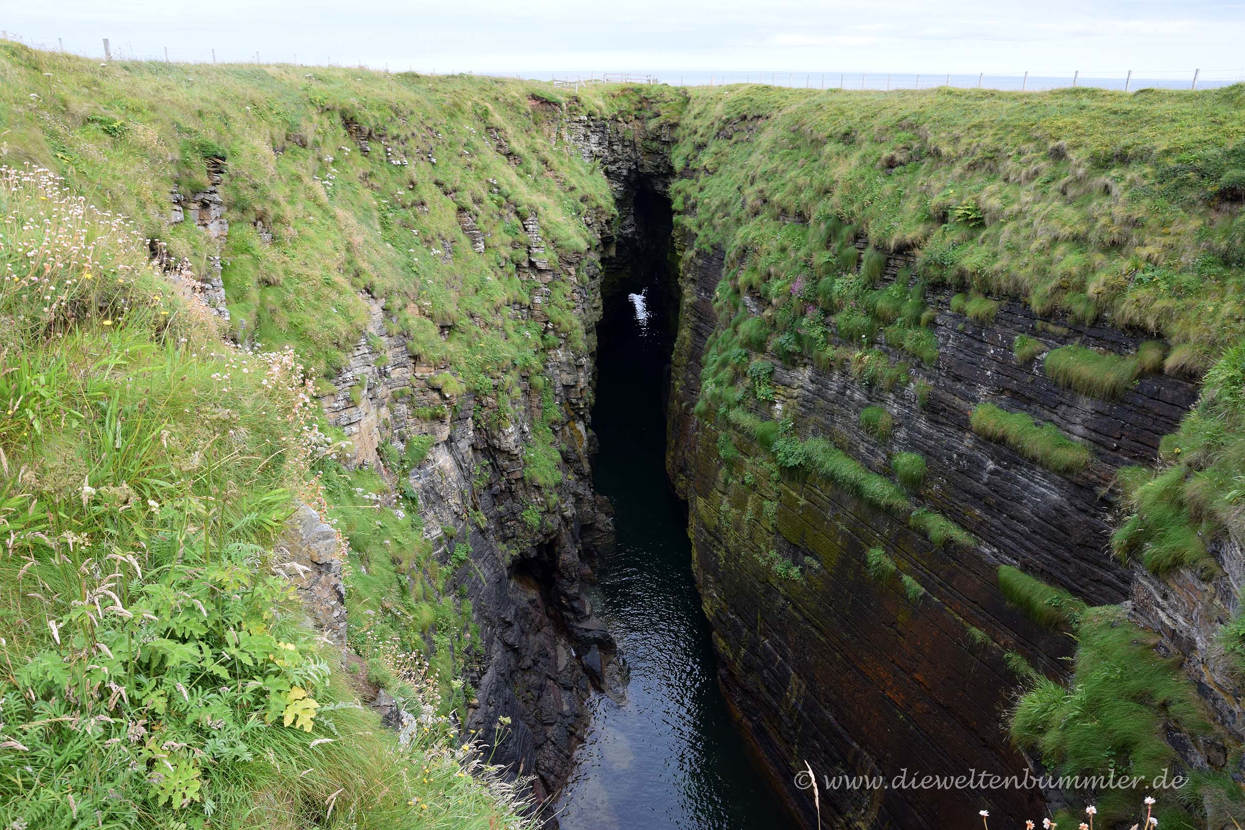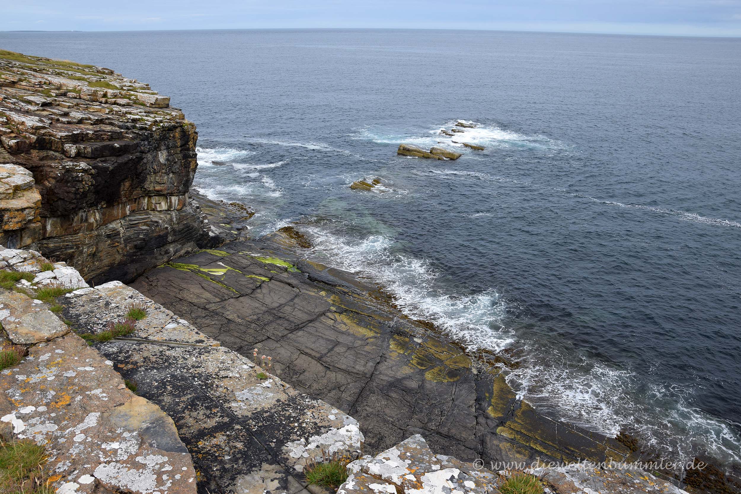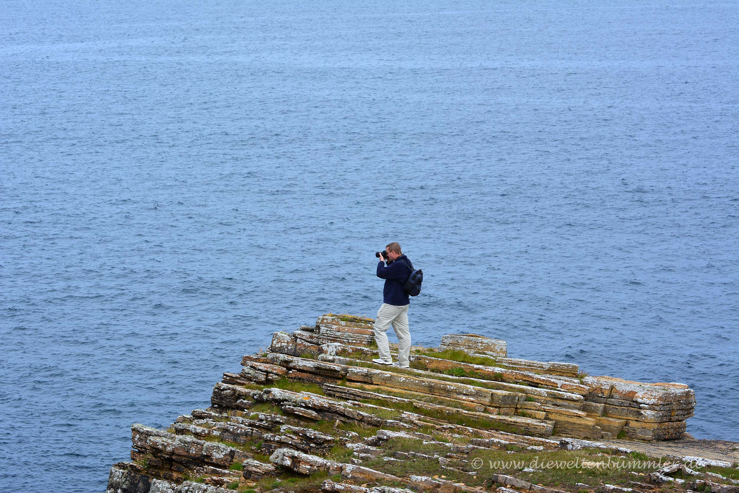 Leider zog sich mittlerweile auch schon wieder der Himmel zu, aber immerhin blieb es trocken. Doch optisch änderte sich das Bild zu einem trüben Grau in Grau. Aber es gab in diesem Moment Schlimmeres auf der Welt, wie wir später erfahren mussten. Wir kehrten zurück auf die Hauptinsel, wo wir der Straße nach Osten bis an ihr Ende folgten. In Mull Head wurden wir auf ein Naturreservat aufmerksam, bei dem wir eine kleine spontane Wanderung entlang der Küste einlegten. An diesen schroffen Gesteinsbildungen in wunderschöner Küstenlandschaft hätten wir noch stundenlang spazieren können, aber wir wollten es heute nicht ganz so spät werden lassen und hatten ja den Campingplatz in Stromness anvisiert.