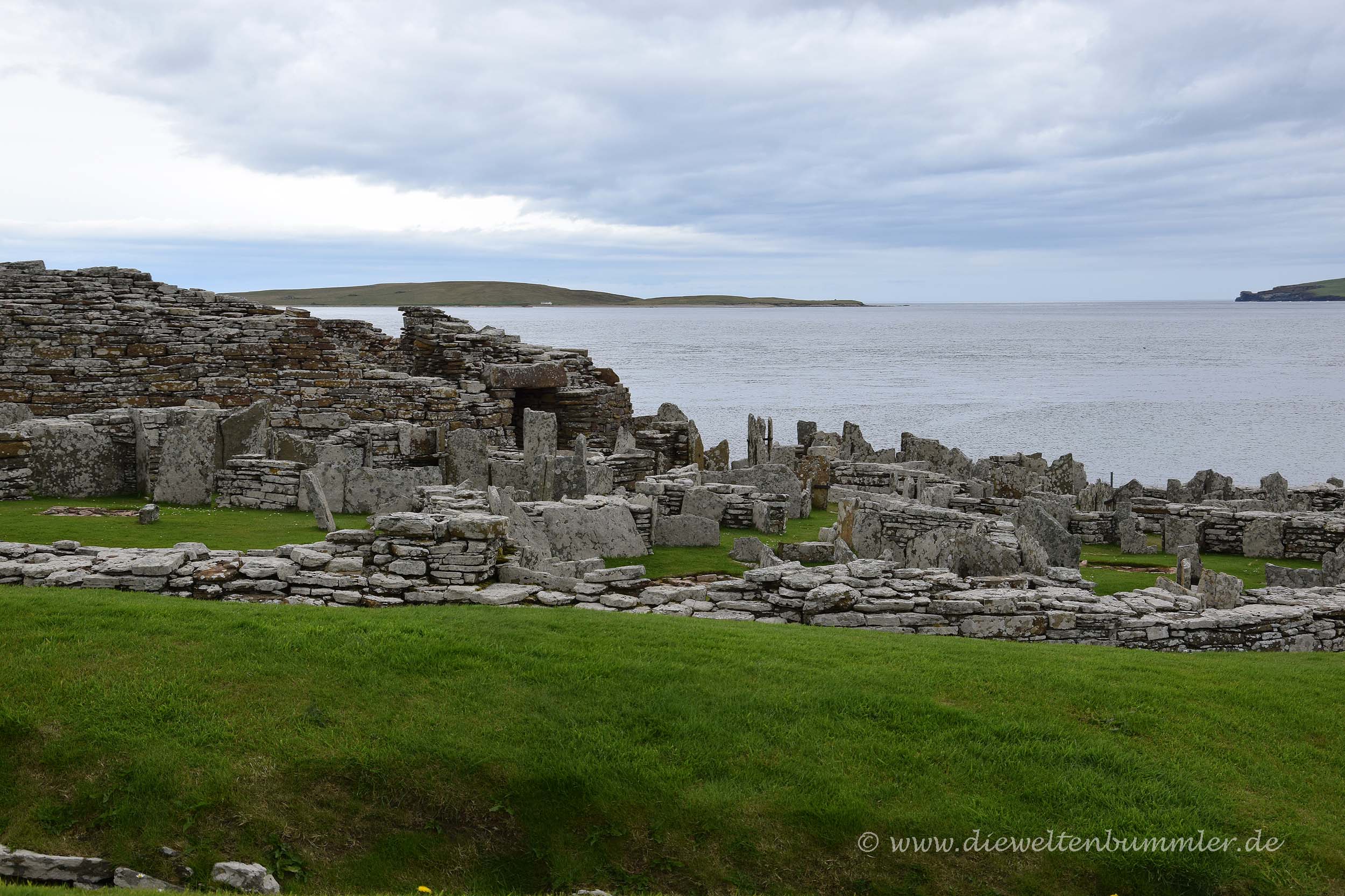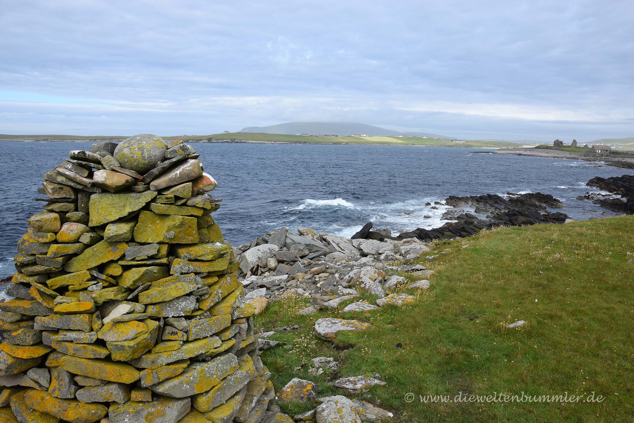 Über die dortige Küstenstraße fuhren wir durch recht einsame Regionen von Mainland. Kaum jemand kam uns entgegen und noch weniger waren Touristen zu sehen. Ohnehin sind die Orkney-Inseln kaum überlaufen, doch es gibt eben Orte wie Skara Brae und die italienische Kapelle, wo man doch noch auf andere Reisende trifft. Gegenüber der Insel Rousay hatten wir das gar nicht. Selbst den Broch of Gurness, einer ebenfalls frühzeitlichen Siedlung, haben wir fast alleine erleben können. Lediglich ein Radtourist hatte sich ebenfalls hierher verirrt. Das tat uns schon irgendwie Leid für den Herrn, der dort an der Kasse saß und nichts zu tun hatte. Kurioserweise war der große Parkplatz für wesentlich mehr Besucher ausgelegt und ich hatte nicht den Eindruck, dass man jemals auf diesem großen Parkplatz Probleme haben würde, sein Fahrzeug abzustellen.