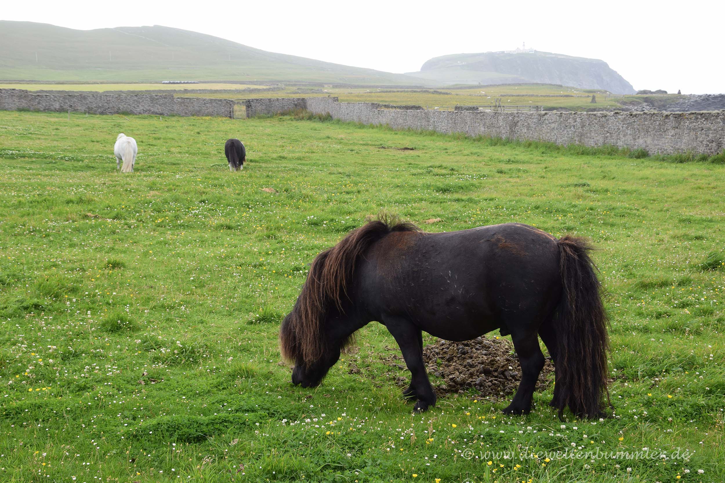 Ohne diese Wanderin hätten wir den Wanderweg wohl übersehen. Doch so folgten wir der jungen Dame und machten uns spontan auf den Weg zum Leichtturm am Sumburgh Head, dem südlichsten Punkt der Shetland-Inseln. An ein paar Shetland-Ponys wanderten wir vorbei, erfreuten uns an dem Anblick auf die felsige Küstenlandschaft und waren auch ganz froh darüber, dass zumindest hier die Wolkendecke aufriss und ein bisschen blauer Himmel zu sehen war. Lediglich in Richtung Norden wirkte alles noch sehr trübe und dicht bewölkt. So gesehen hatten wir also die richtige Entscheidung getroffen, als wir nach Süden fuhren.