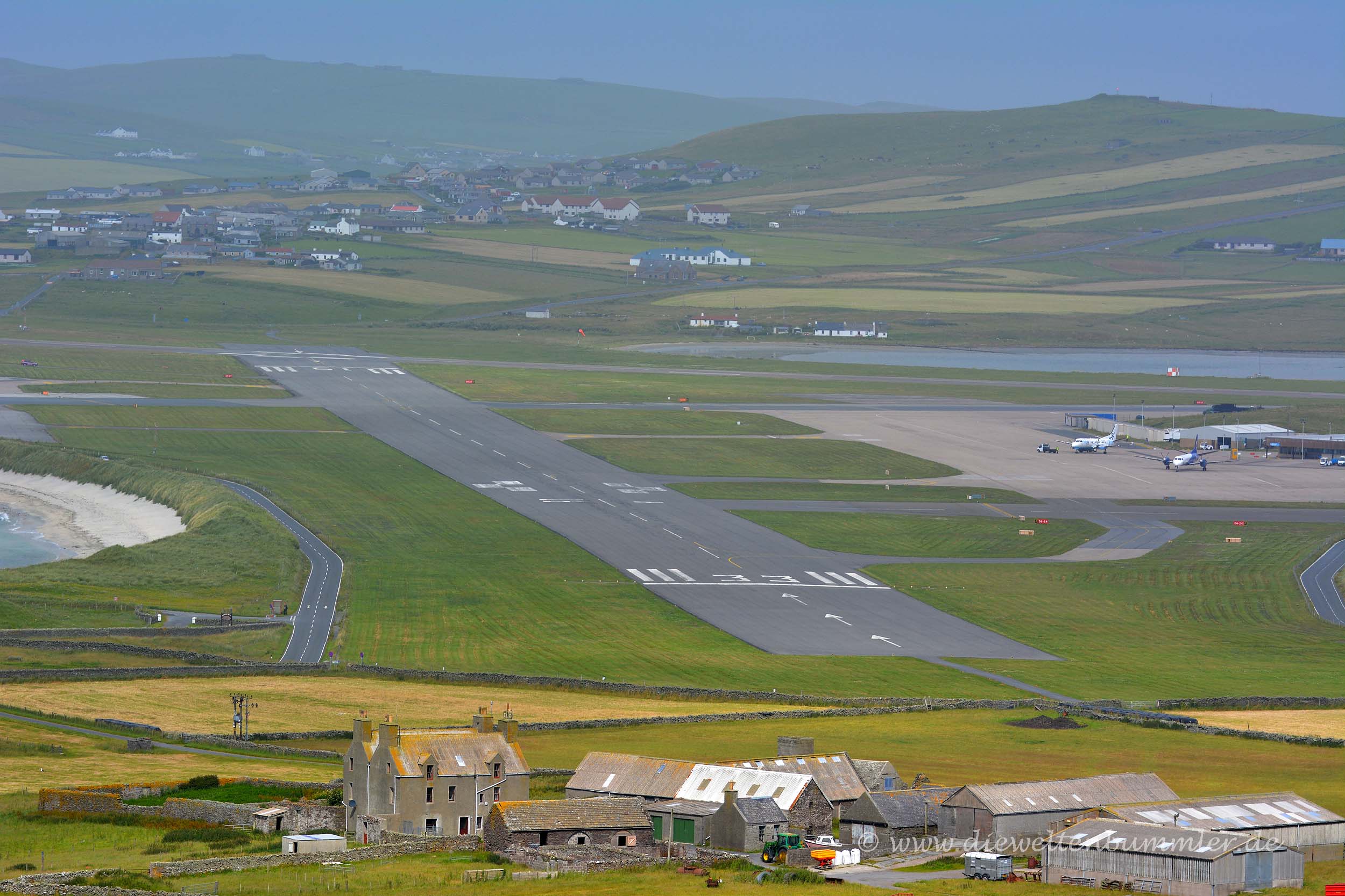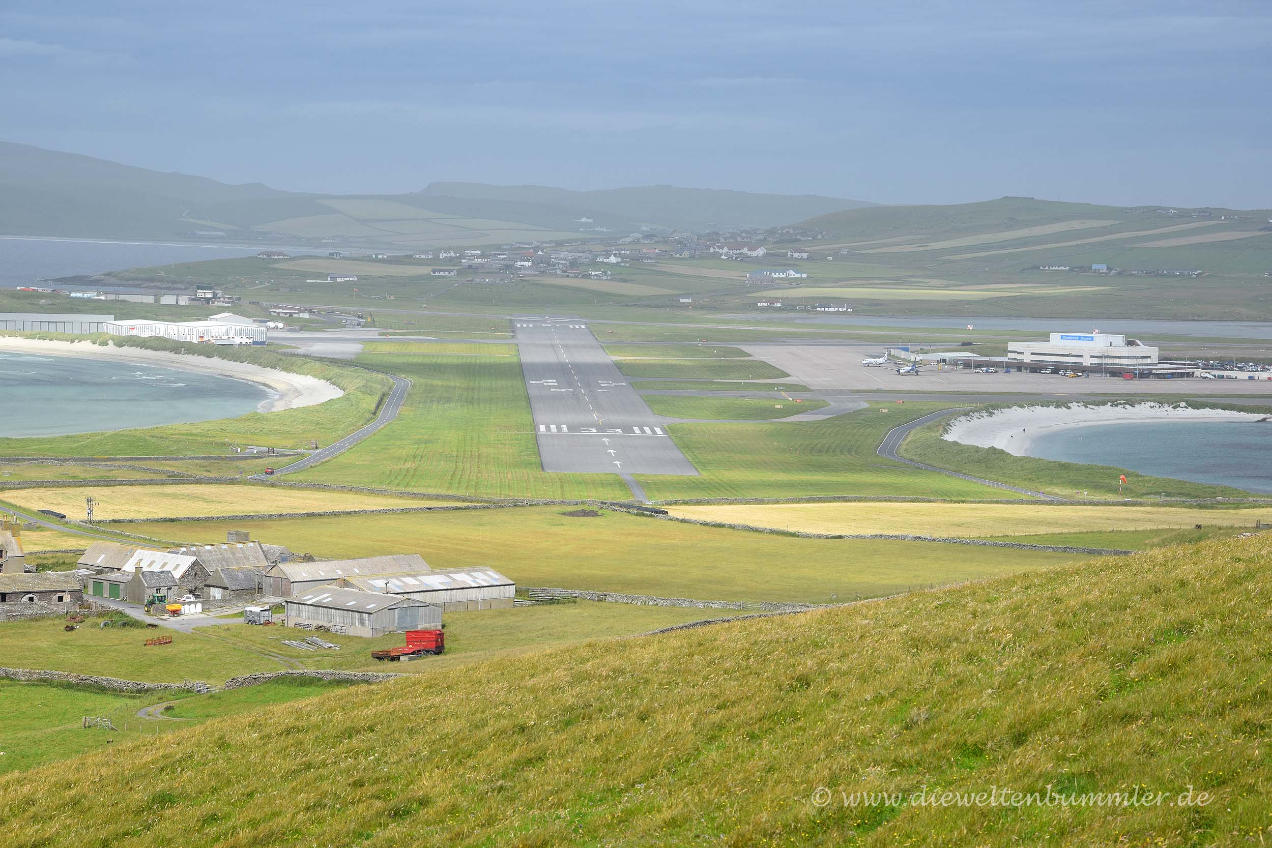 Als wir wieder mit dem Wohnmobil nach Norden fuhren, überquerten wir auf dem Rückweg, wie schon auf dem Hinweg, erneut die Start- und Landebahn des Sumburgh Airports. Würde dort ein Flugzeug starten oder landen, müsste man vor der Landebahn warten. Aber hier war jetzt nun nicht gerade so viel los, daher konnten wir einfach die Startbahn überqueren. Am Spiggie Loch schauten wir uns eine zweite schöne Bucht mit Sandstrand an, doch diese konnte mit dem Tombolo nicht mithalten, zu der wir dann gleich nochmal fuhren. Das Tombolo lag ja beinahe auf dem Weg und da das Wetter mittlerweile etwas besser wurde, wollten wir doch mal schauen, ob sich schon bessere Fotos ergeben könnten.