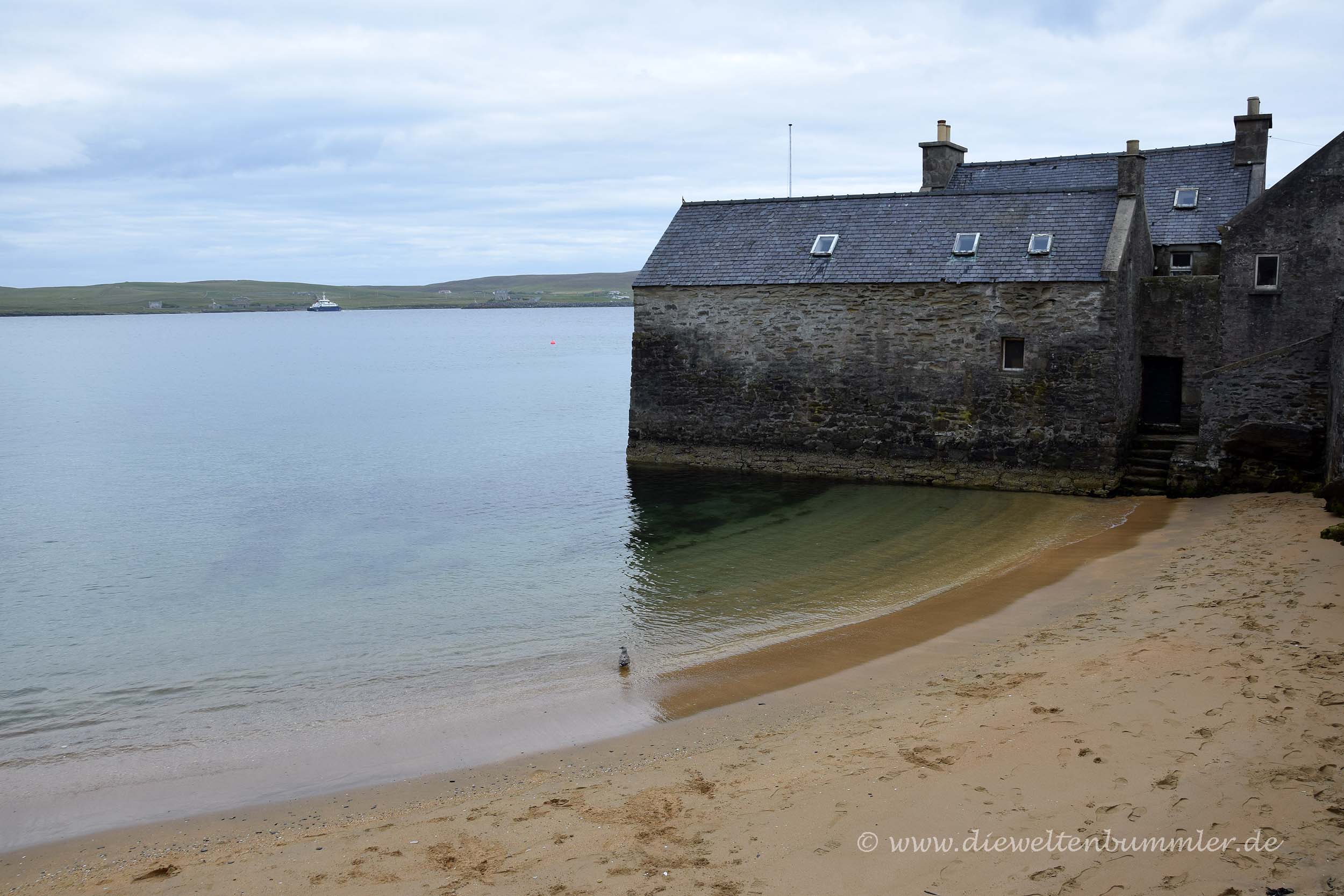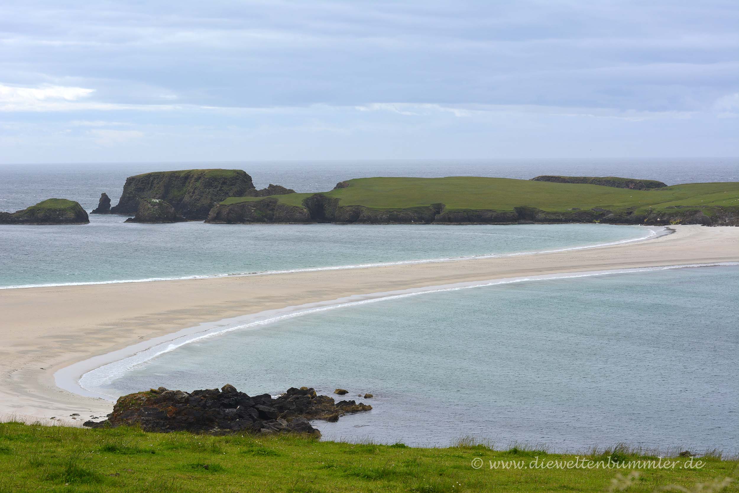 In diesem Fall war das Festland die Hauptinsel der Shetland-Inseln, die übrigens wie die Hauptinsel der Orkney-Insel den Namen Mainland trägt, und die kleinere Nebeninsel hieß St. Ninians Island. Diese beiden Inseln sind nun mit einem rund 50 Meter breiten Sandstrand verbunden, sodass dieser auf beiden Seiten Zugang zum Meer hat. Noch war das Wetter bewölkt und das Tombolo kam nicht so recht zur Geltung, aber uns war sofort klar, dass wir hier auf jeden Fall nochmal hinfahren würden, wenn sich während unseres Aufenthalts das Wetter bessern würde.