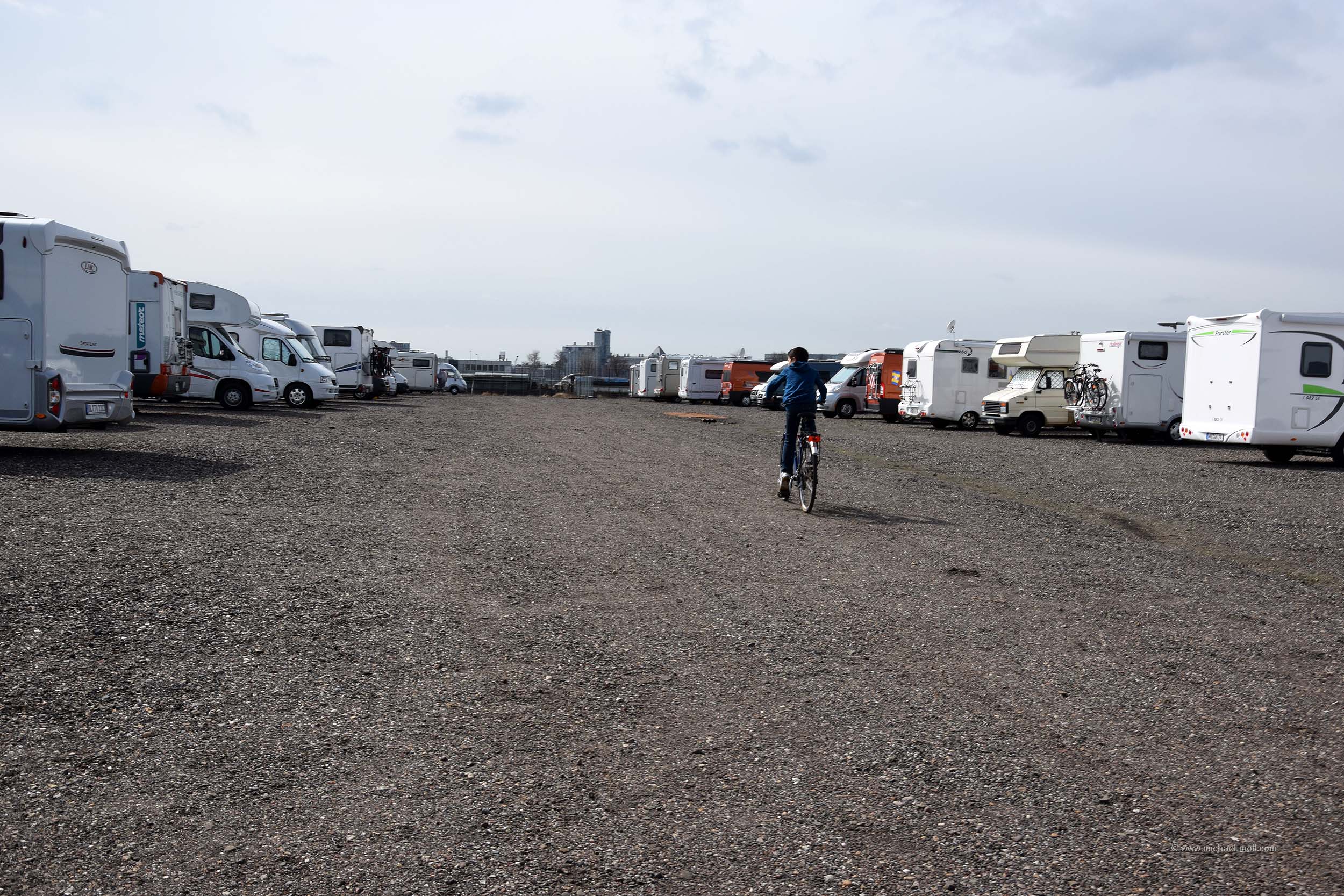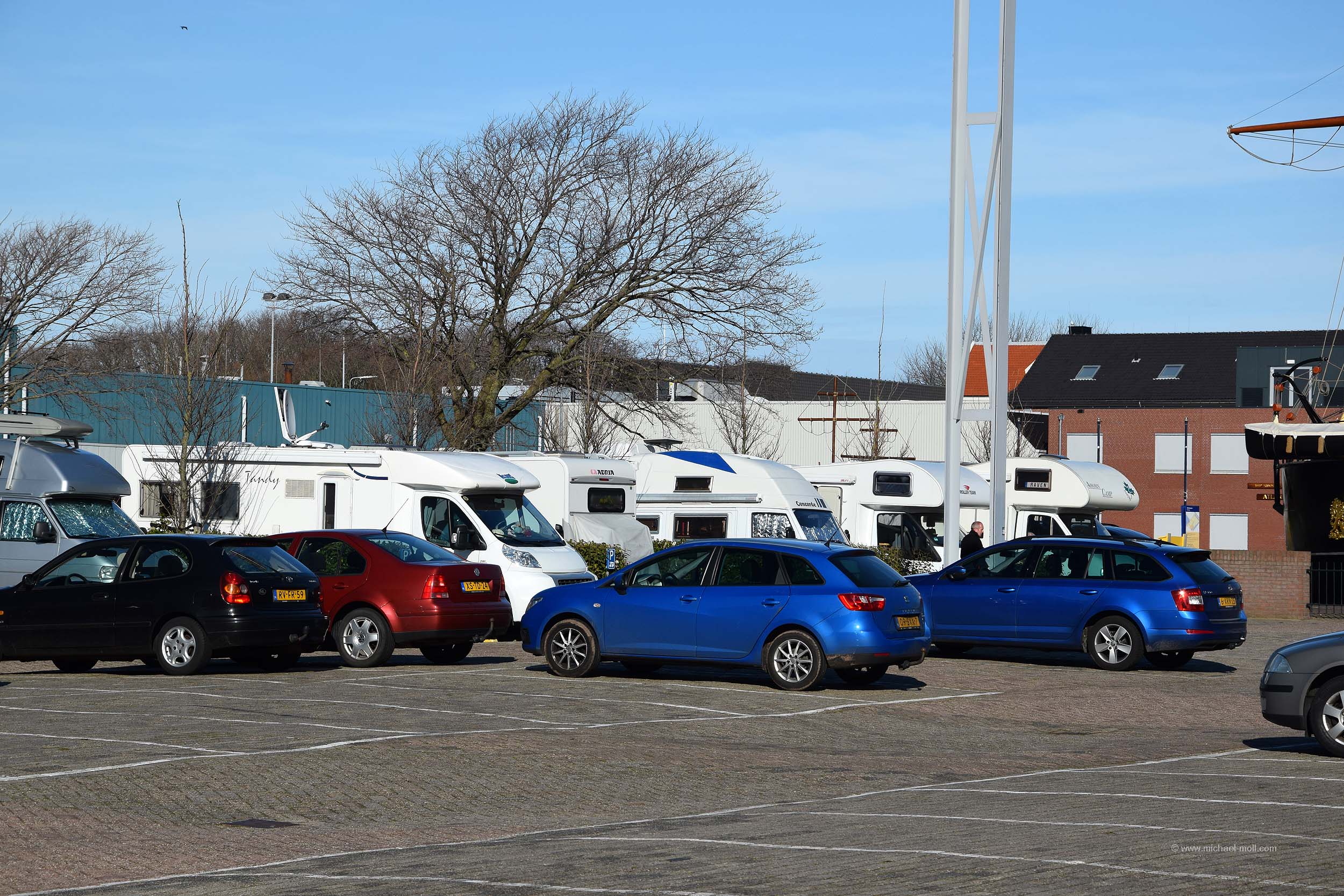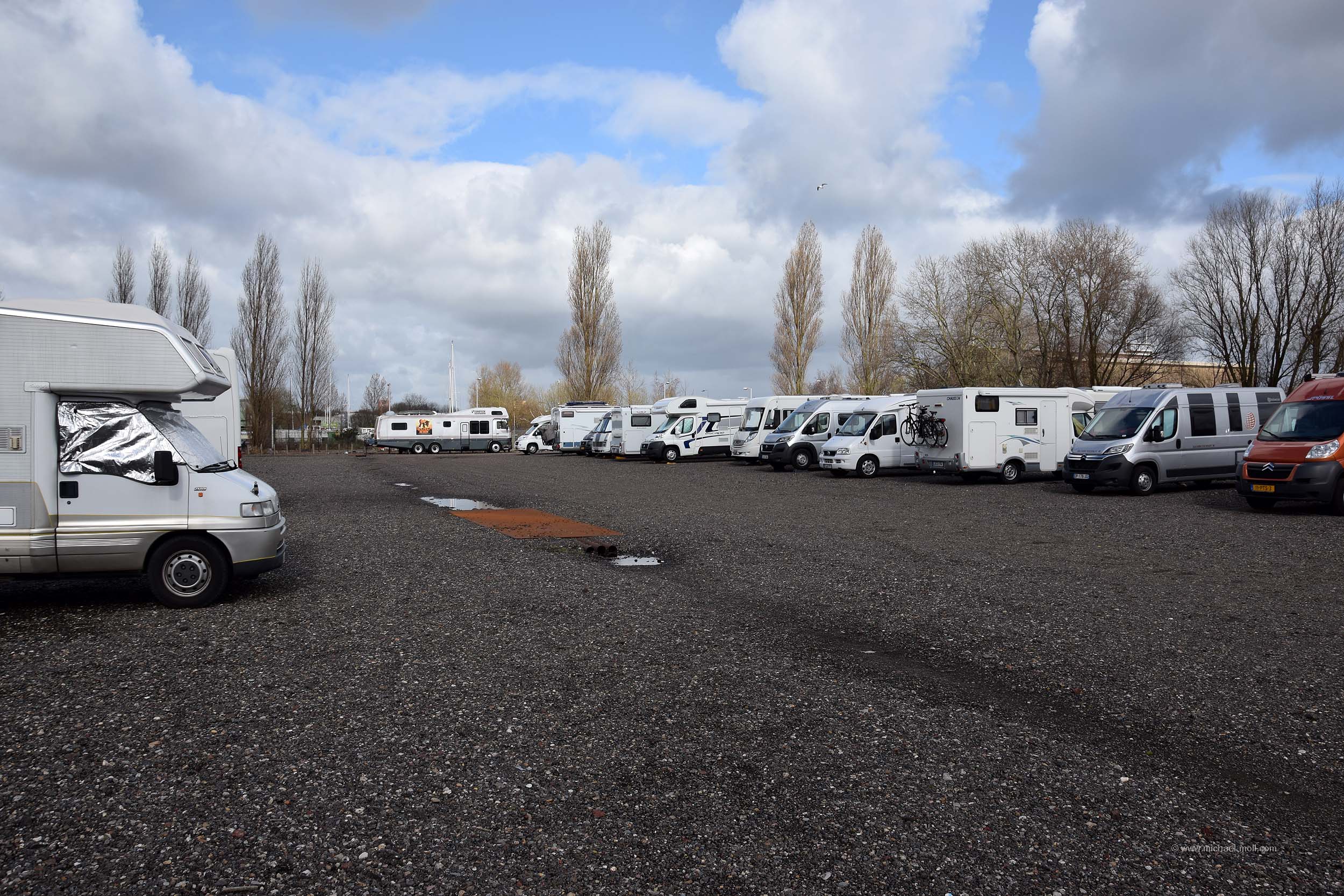 Wir hatten ein wenig Sorge, ob wir am frühen Donnerstagnachmittag vor Ostern überhaupt noch einen freien Platz bekommen würden. Aber die Sorge wurde uns von dem Betreiber schnell genommen, der zu uns kam und sämtliche Daten in eine Art Parkscheinautomaten eingab. Nachdem wir bezahlten, öffnete sich das Tor und wir konnten die Stellfläche 81 ansteuern. Es handelt sich um einen ziemlich einfachen Wohnmobilstellplatz auf einer Schotterfläche im Hafengebiet. Aber er ist umzäunt und dient ohnehin nur der Übernachtung, da wir ja bei Tageslicht in Amsterdam unterwegs sein würden.