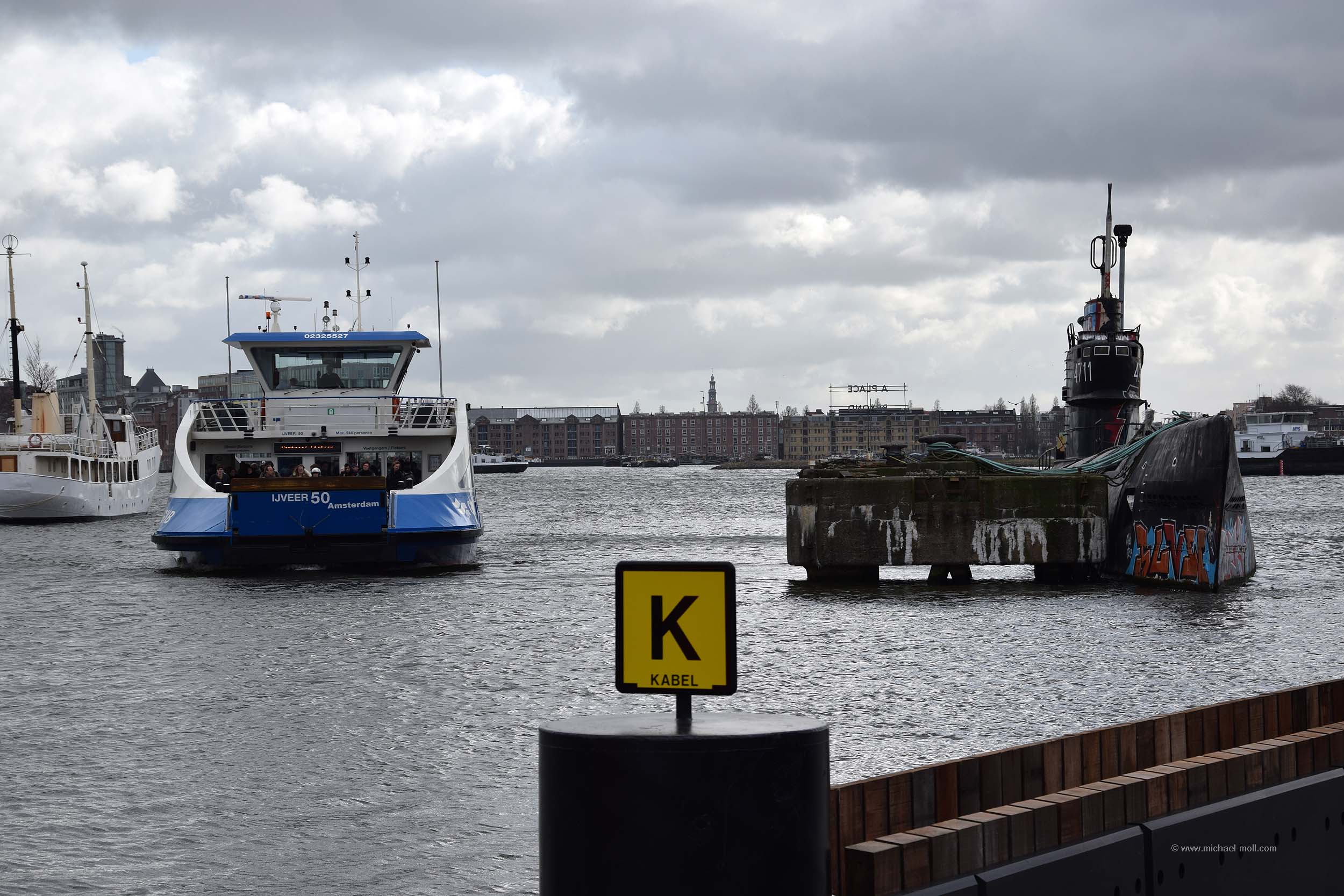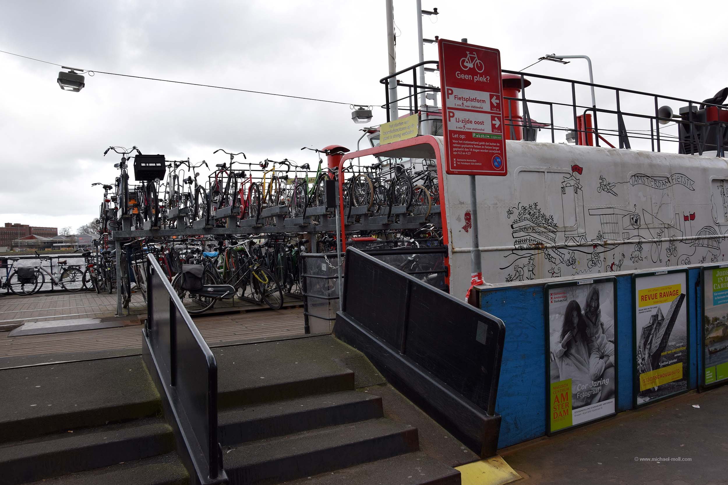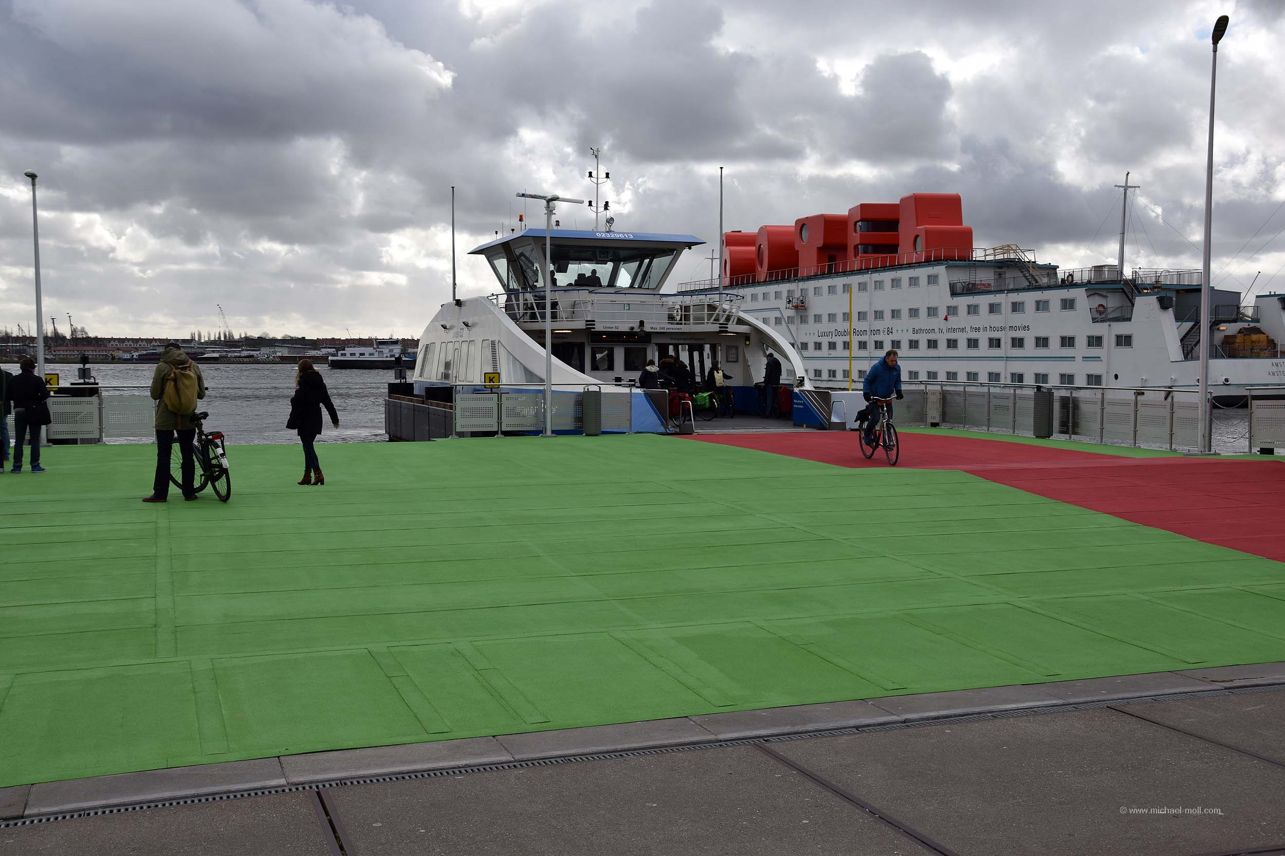 Vom Stellplatz aus ist man zu Fuß in rund zehn Minuten an einem Fähranleger. Dort kann man mit der kostenlosen Fähre über den ehemaligen Meeresarm namens IJ übersetzen. So gelangen wir von Amsterdam-Nord nach einer guten Viertelstunde Schifffahrt direkt bis zum Amsterdamer Hauptbahnhof. Noch bequemer kann man das Zentrum einer Metropole mit dem Wohnmobil kaum erreichen.