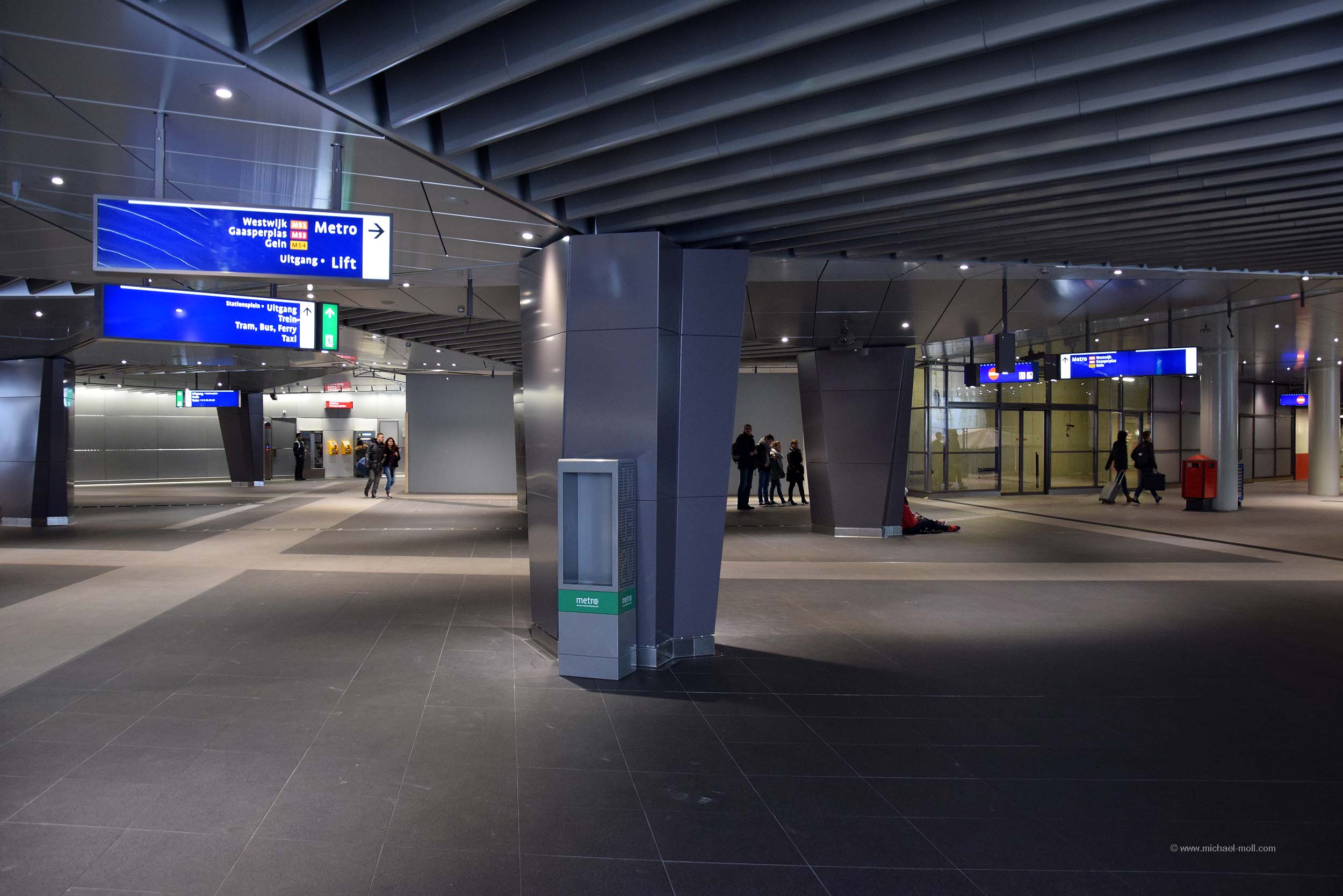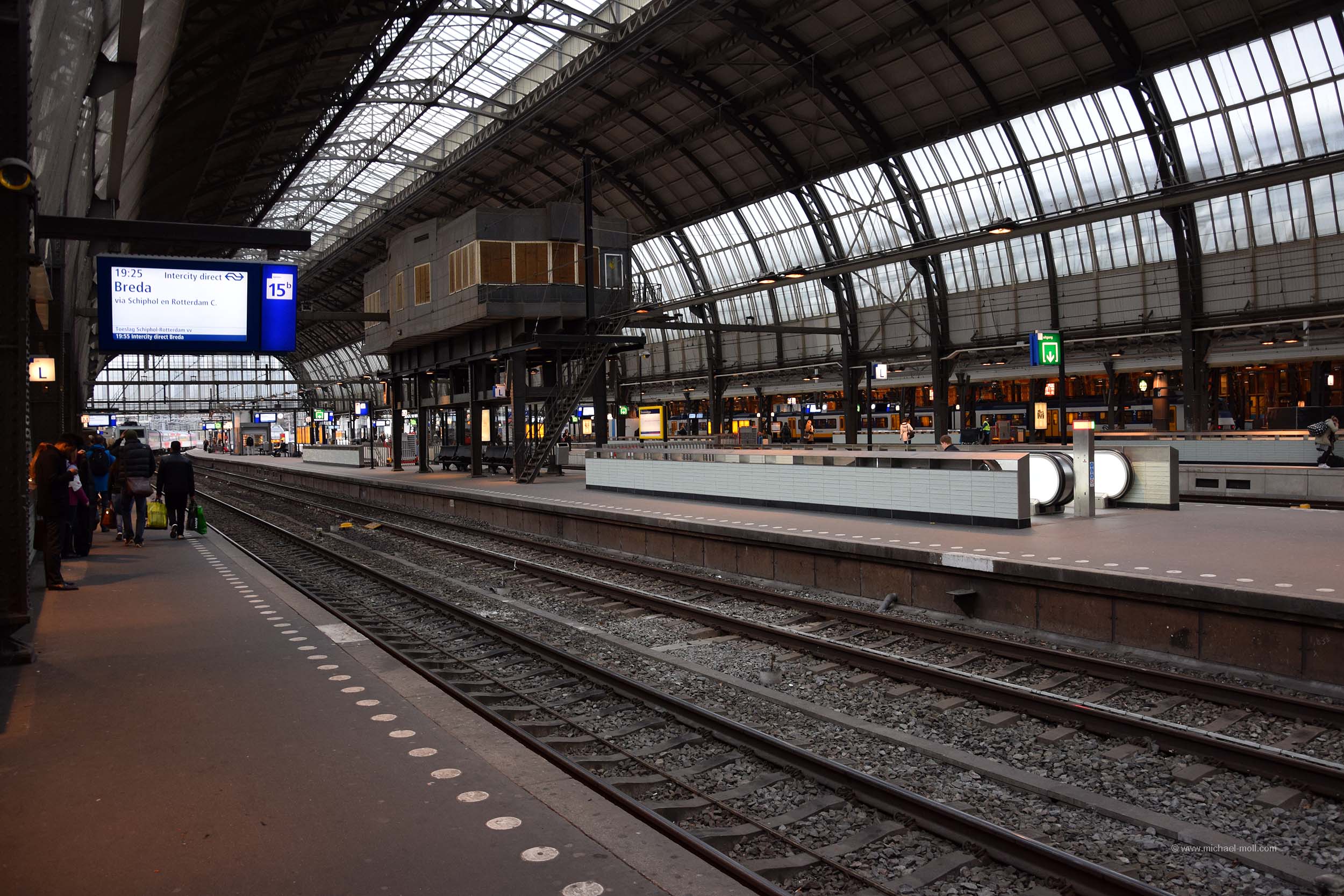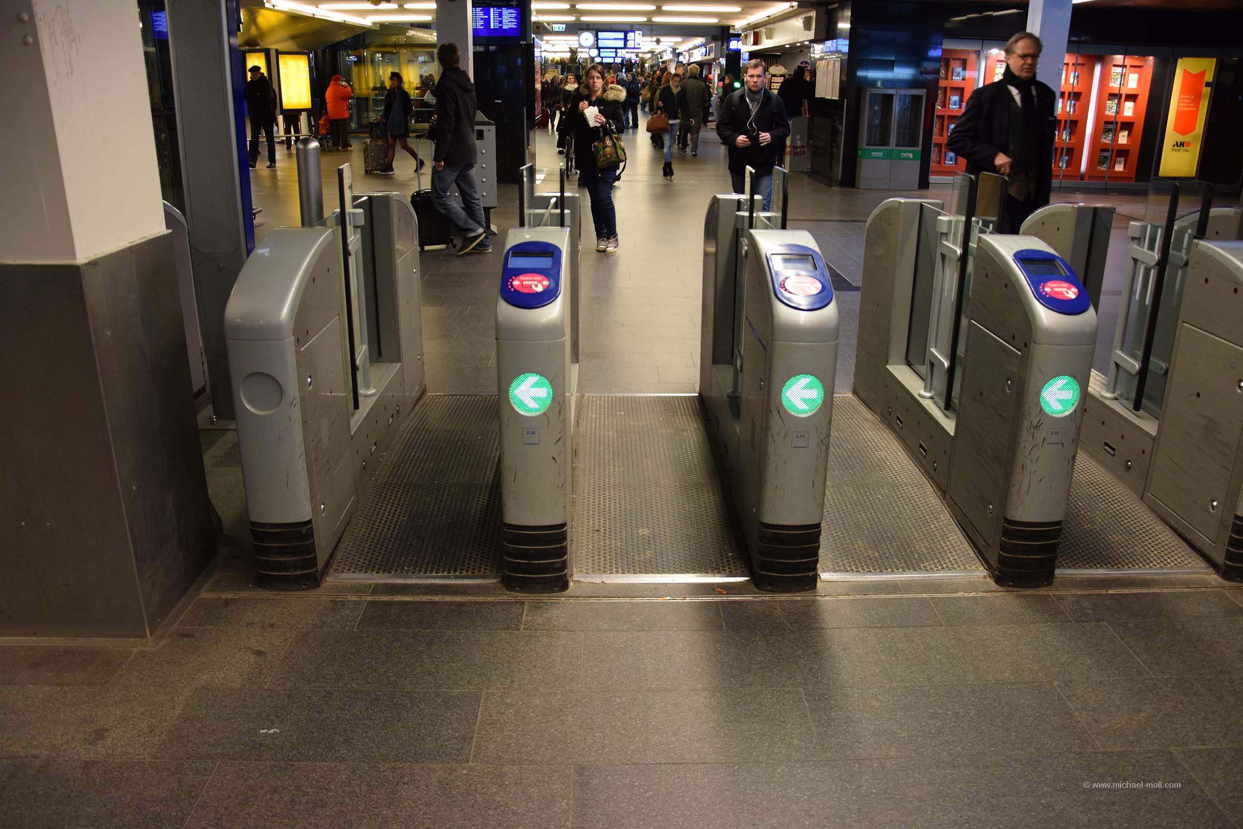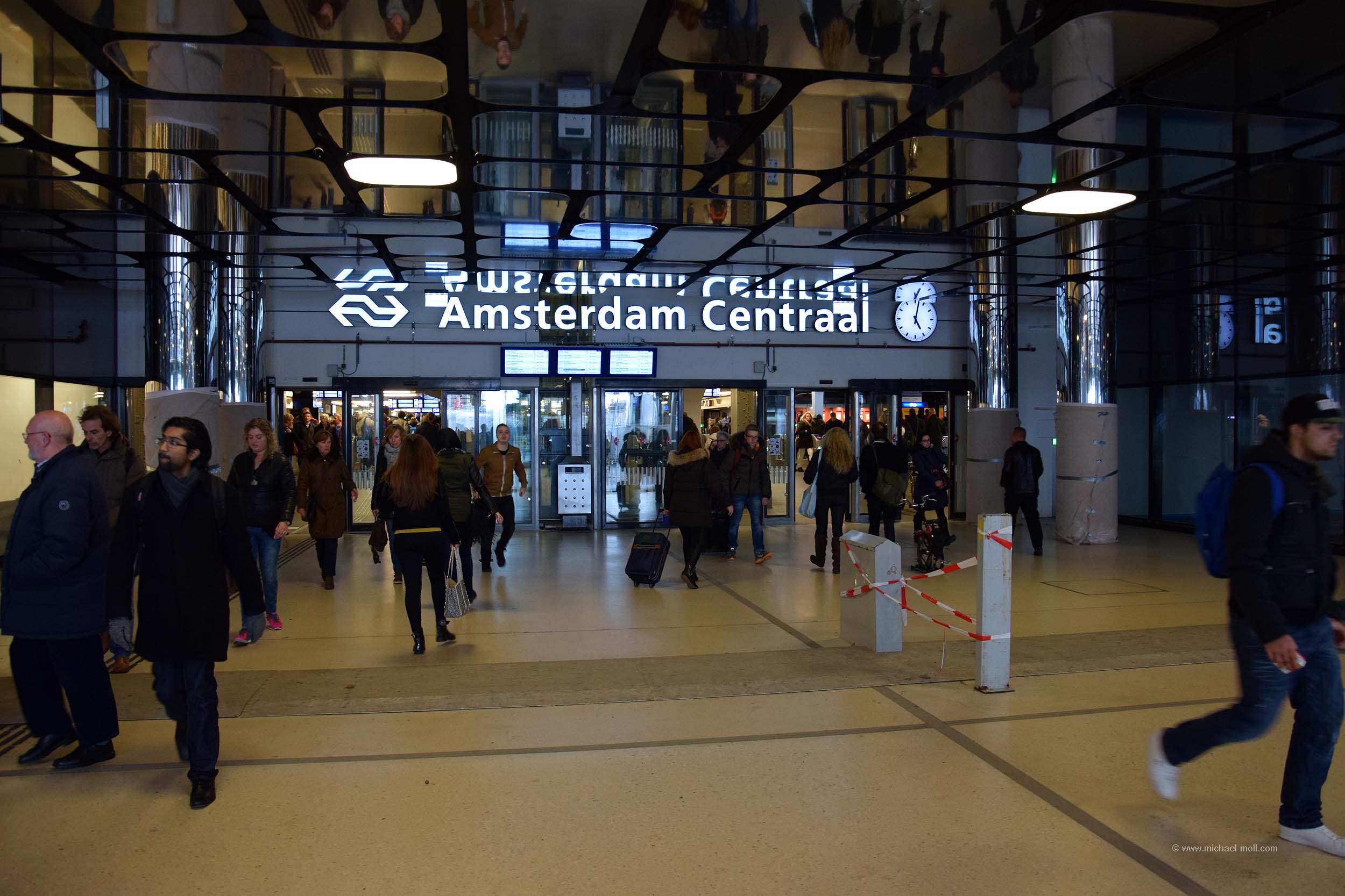 Doch nun war ich hier und ging durch die Bahnhofshalle in die Amsterdamer Innenstadt. Wobei ich schon beim Betreten des Bahnhofs direkt aufgehalten wurde. Denn dort gibt es Durchgänge, wie man sie von den Zugängen zu einer Metro kennt und wo man ein Ticket vorhalten muss, um hindurch zu gelangen. Nur mit dem Unterschied, dass wir an dieser Stelle zunächst nur in die Bahnhofshalle hinein wollten. Das verunsicherte uns auf den ersten Blick, aber es gab ja keine Sperre, die uns aufgehalten hätte, wenn wir kein Ticket vorzeigen würden. So gingen wir also hindurch, durchquerten die Halle und verließen auf der anderen Seite den Bahnhof ebenfalls wieder durch diese Ticketkontrollen. Ich habe es nun nicht geprüft, aber ich vermute mal, dass man hier bereits sein Ticket „entwertet“, wenn man zu den Bahnsteigen hinauf geht und einen Zug besteigt.