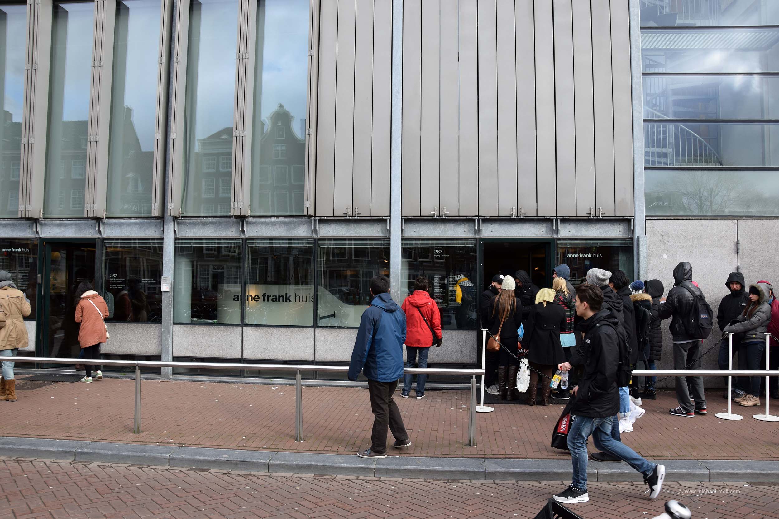 Wir schlenderten einfach ein wenig durch die Stadt und ließen alles auf uns zukommen. In einem sogenannten Käse-Museum durften wir ein wenig Käse probieren und am Dam, dem Herzen der Stadt bogen wir ab, um in Richung Prinsengracht zu gelangen. Die Grachten sind natürlich das Wahrzeichen von Amsterdam und zudem auf der Welterbeliste der Unesco eingetragen. Außerdem befindet sich in der Prinsengracht das Anne-Frank-Haus. Da wir mit dem Thema Anne Frank ohnehin schon sehr vertraut sind, hatten wir zwar ohnehin nicht unbedingt die Absicht, die Ausstellung zu besichtigen. Aber als wir die Menschenschlange vor dem Eingang sahen, hätte sich das für uns sowieso komplett erledigt. Ich habe keine Ahnung, wie lang die Wartezeit gewesen wäre, aber ich empfand Respekt dafür, dass die Menschen sich in der Kälte anstellten und eine nicht unerhebliche Wartezeit über sich ergehen ließen.