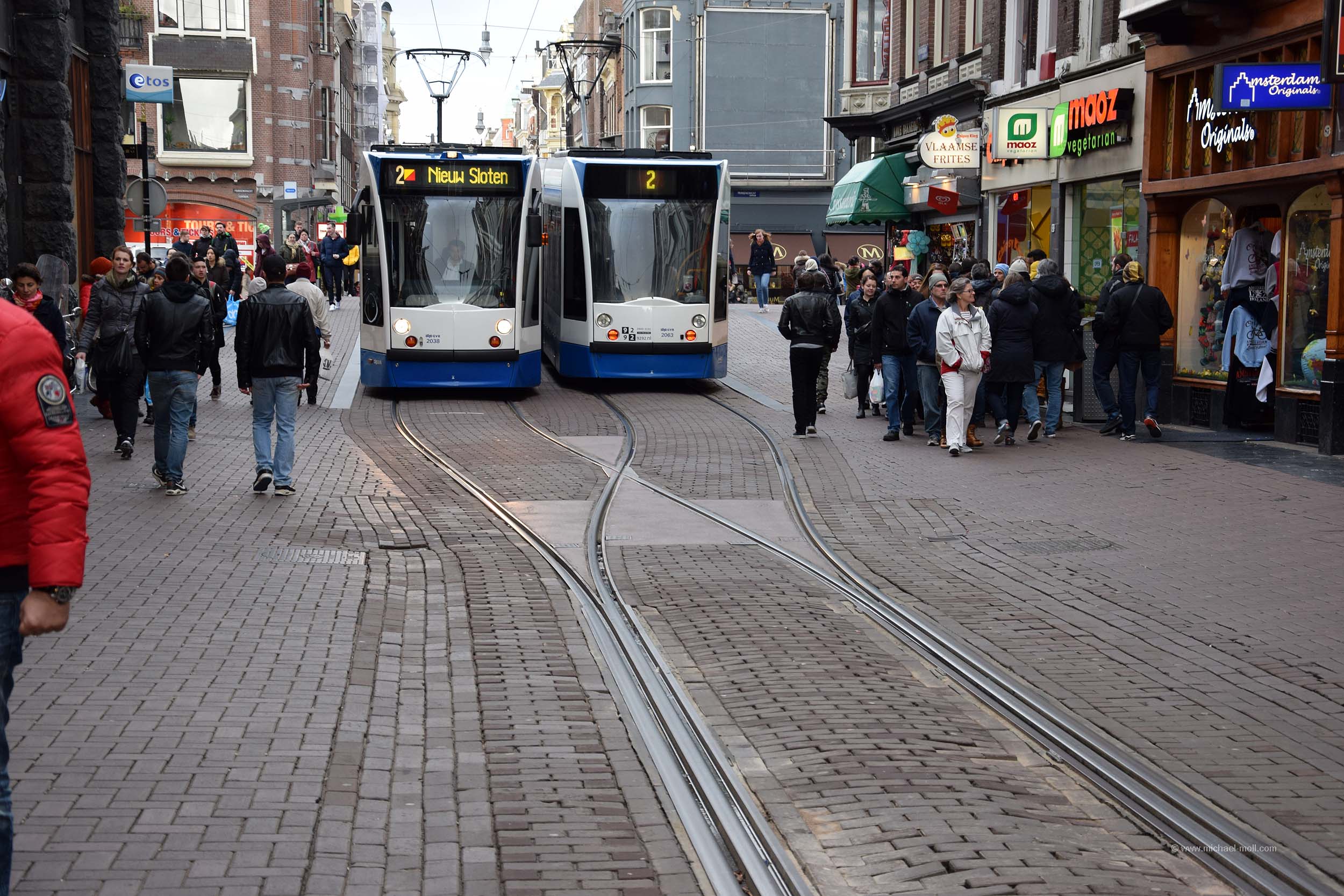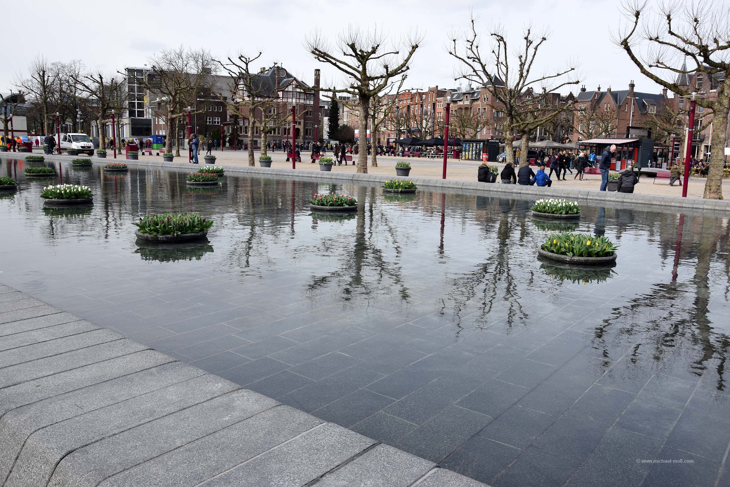 Außerdem spazierten wir über die Leidsestraat, die zwar eine Fußgängerzone ist, jedoch ebenfalls recht hektisch wirkt. Dieses Mal waren es aber nicht die Radfahrer, die mich ein wenig verwirrten – oder ich hatte mich nun schon an sie gewöhnt – sondern die Straßenbahnen. Denn es fährt auf der engen Straße laufend eine Straßenbahn nach der nächsten und das Besondere daran ist, dass sie in den kurzen Abständen zwischen zwei Haltestellen in der Mitte der Straße verkehren. In jede Richtung gibt es zwar ein Gleis, doch diese sind so konstruiert, dass sie nur wenige Zentimeter auseinander liegen und es so wirkt, als würden die Bahnen das gleiche Gleis nutzen, wenn sie in gegensätzliche Richtung fahren. Und da die Bahnen alle paar Sekunden durch die Straße rasen und man nie so recht weiß, aus welcher Richtung nun die nächste Bahn kommt, habe ich mich von der Straßenmitte deutlich ferngehalten.