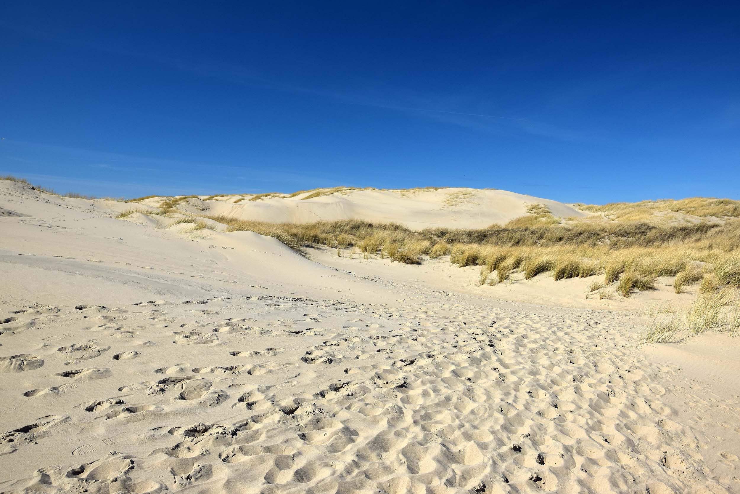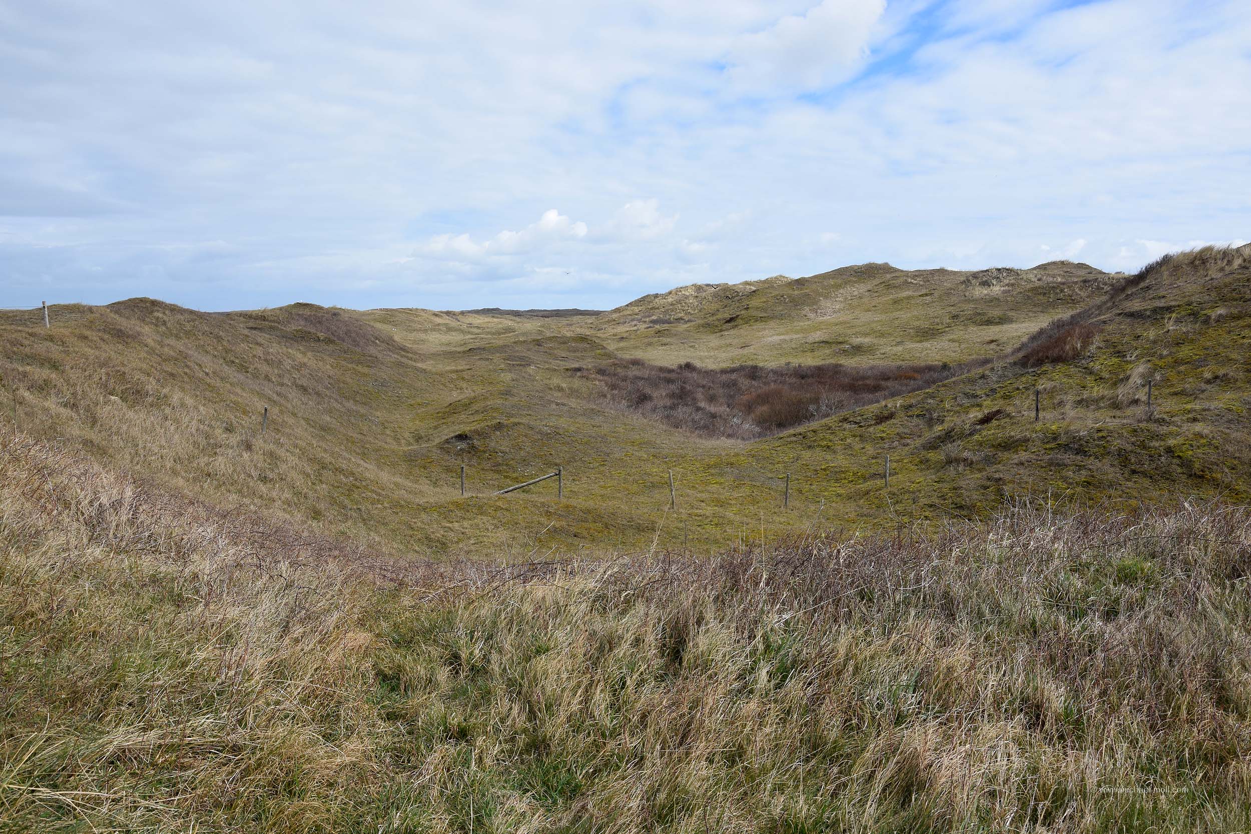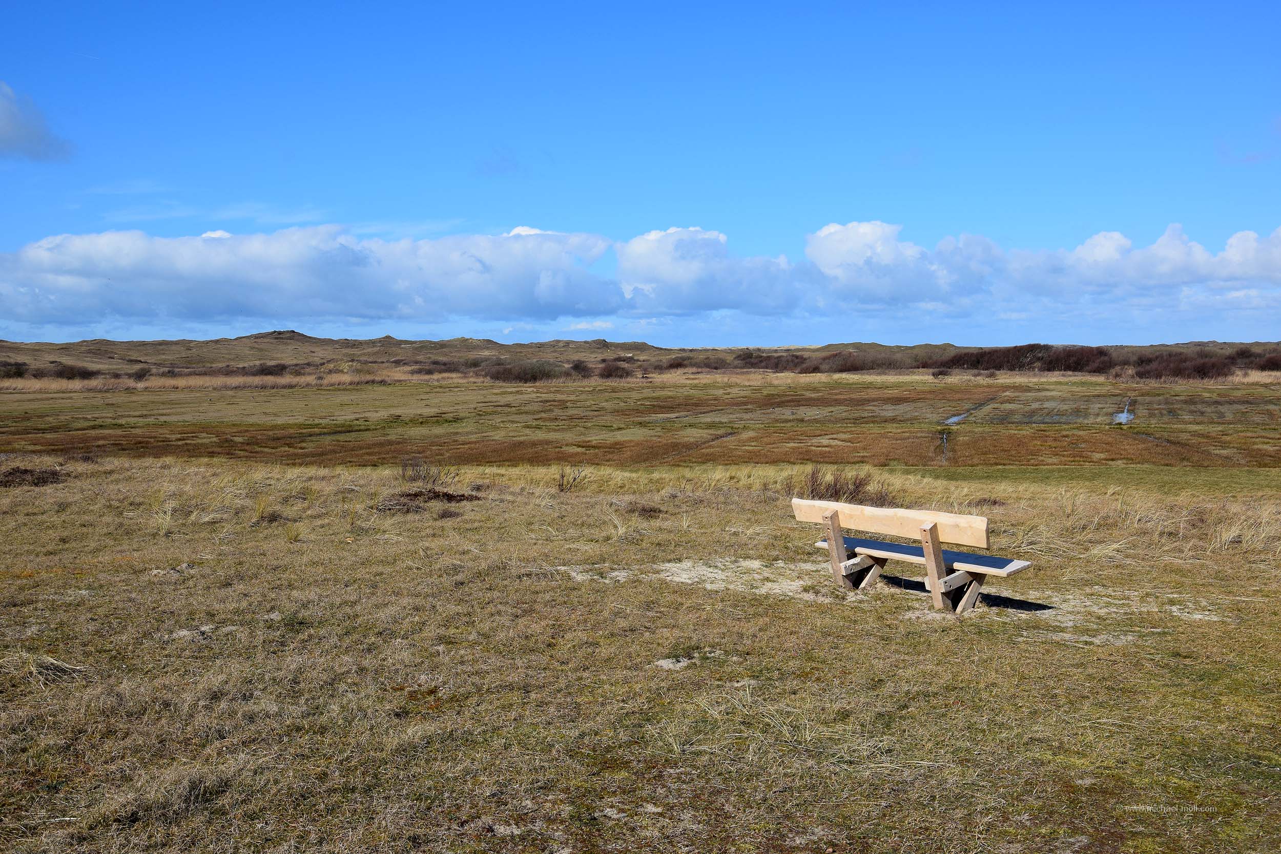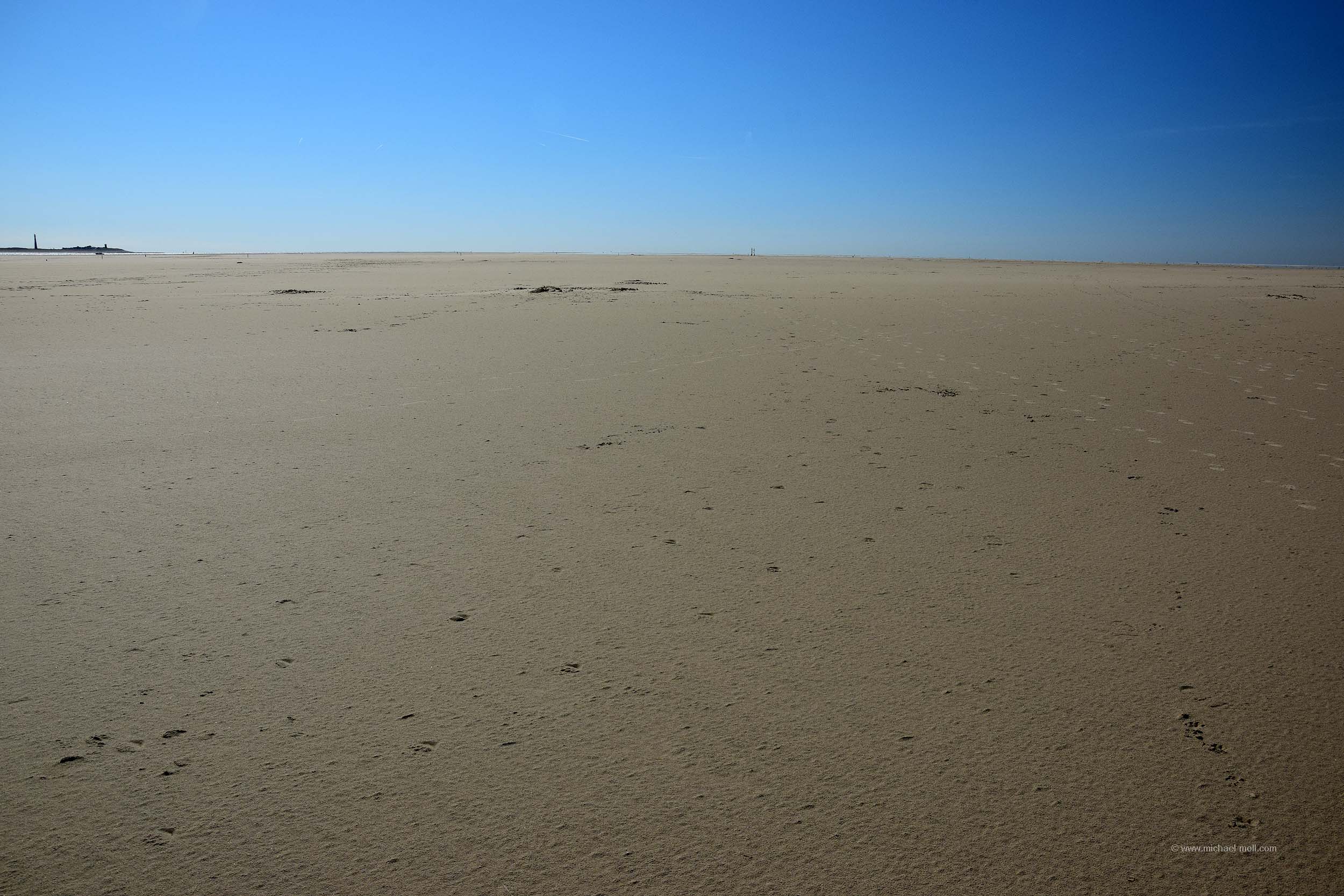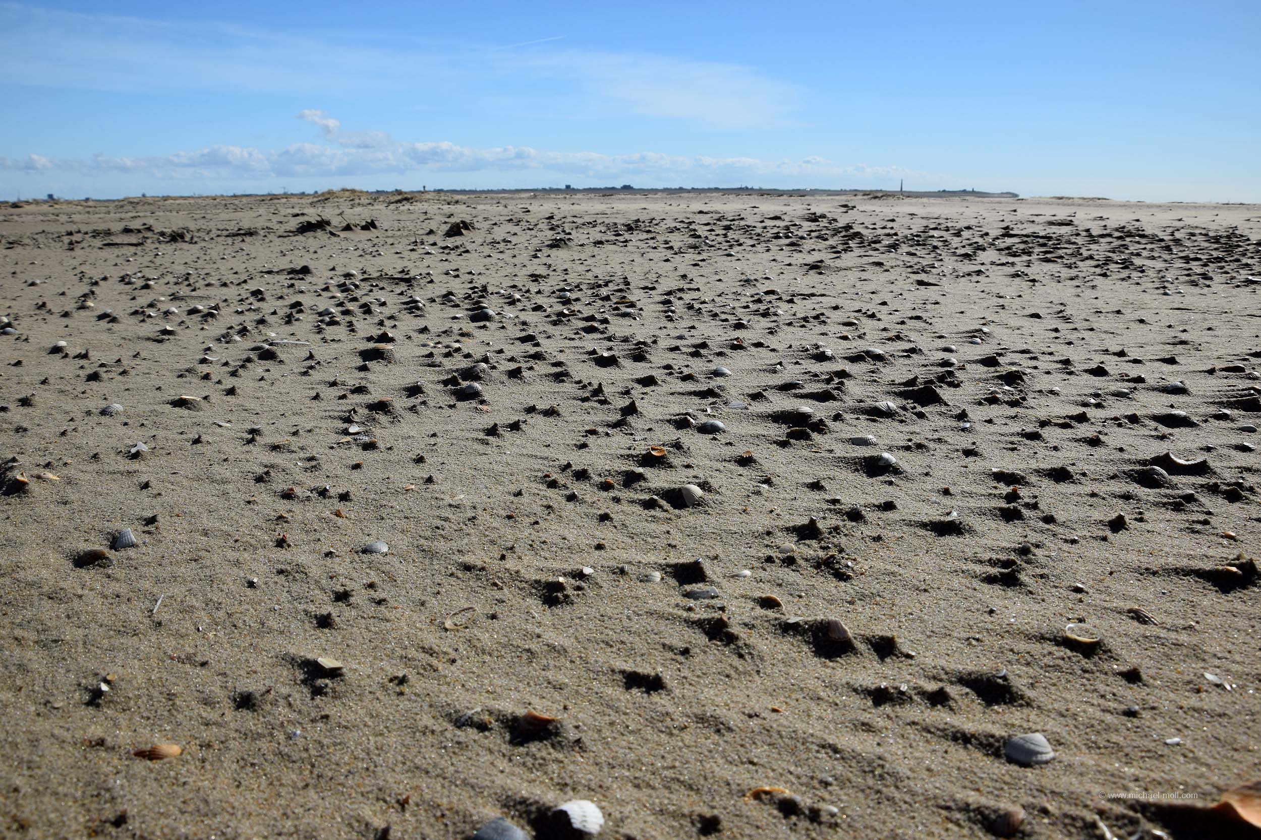 Auf direktem Weg nach Süden wollten wir dann auch nicht fahren, daher fuhren wir an der Ostküste entlang, wo es weder Dünen noch Sandstrand zu sehen gibt. Ein Deich auf der einen und Felder auf der anderen Seite dominierten das Bild. Lediglich an einer Stelle wurde dieses Idyll von einer hübschen Windmühle unterbrochen, an der wir für einen Fotostopp anhielten. Den Hauptort Den Burg lernten wir eigentlich nur ganz kurz kennen. Dort war es uns mit den vielen gastronomischen Angeboten einfach zu rummelig. Wir beließen es bei einem kurzen Andenkenkauf und besichtigten vielmehr die dortige Kriegsgräberstätte, an der wir erfuhren, dass eine ganze Menge Flugzeuge im Zweiten Weltkrieg auf die Insel abstürzten. Zu guter Letzt wollten wir noch die Dünen im Süden der Insel erkunden. Denn immerhin sind die Dünen von Texel ja ein Nationalpark und sie machten schon auf der Karte einen interessanten Eindruck. Die vom Wind geformten Sandhügel erheben sich oftmals aus einer ansonsten völlig flachen Landschaft, sodass man auch schon mal um die eine oder andere unberührte Düne herumgehen kann. Das wirkt ganz anders als wenn man sich in einer hügeligen Sandlandschaft befindet. Es war einfach nur schön. Und zum Schluss verlässt man die Dünen und steht auf einem einsamen und leeren Strand, auf dem man das Wasser nur in der Ferne erahnen kann. So kam es, dass wir auf diesen eigentlich als kurzen Zwischenstopp geplanten Halt wieder mal eben 8,5 Kilometer wanderten. Aber kein Wunder, denn das Wetter spielte an diesem Tag wirklich toll mit und bescherte uns einen tollen, blauen Himmel.