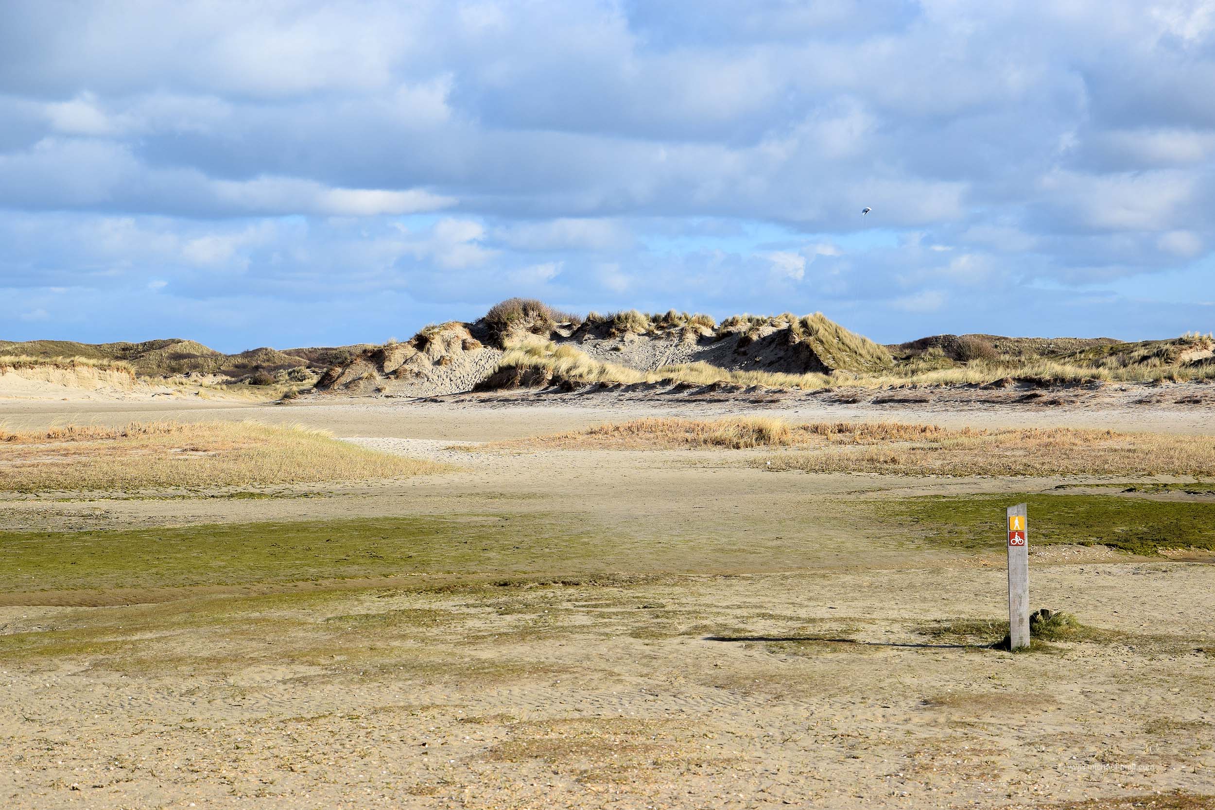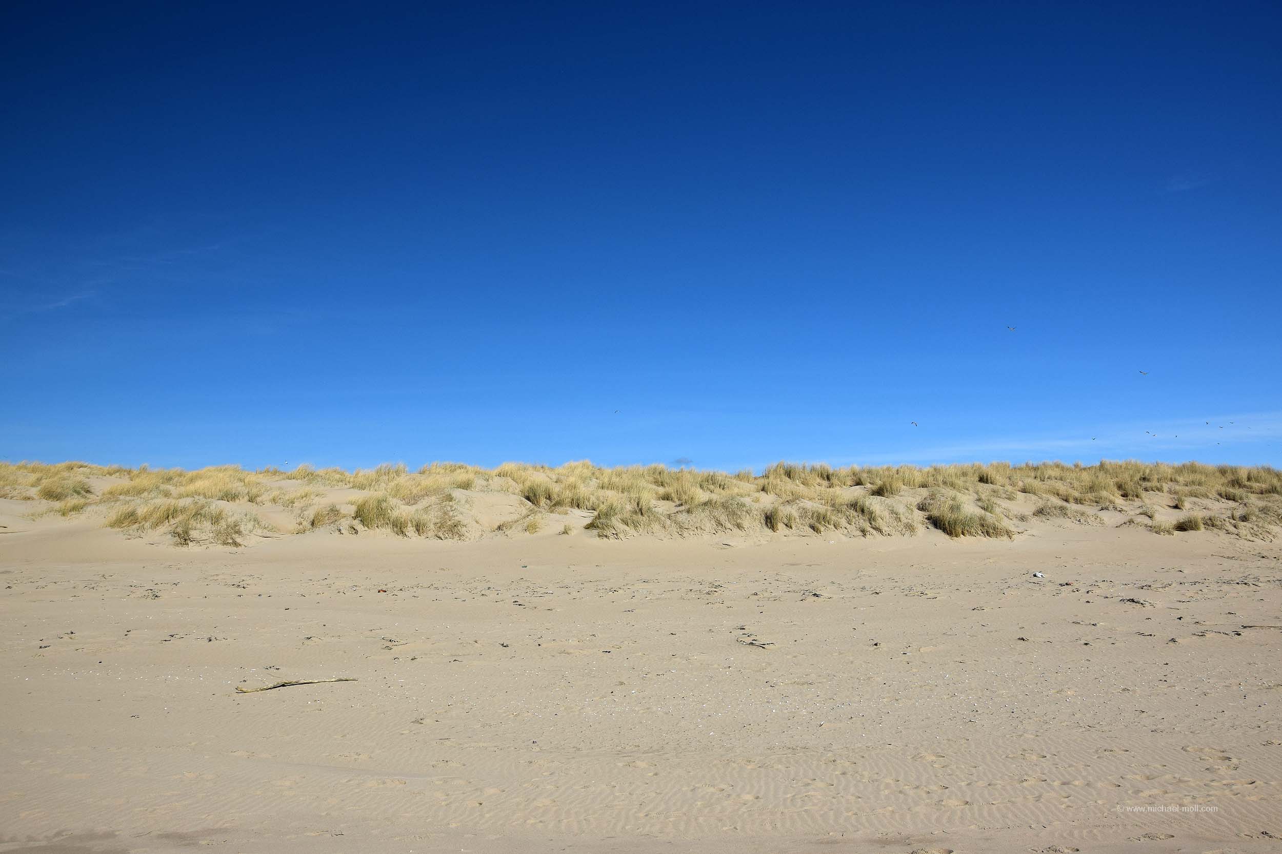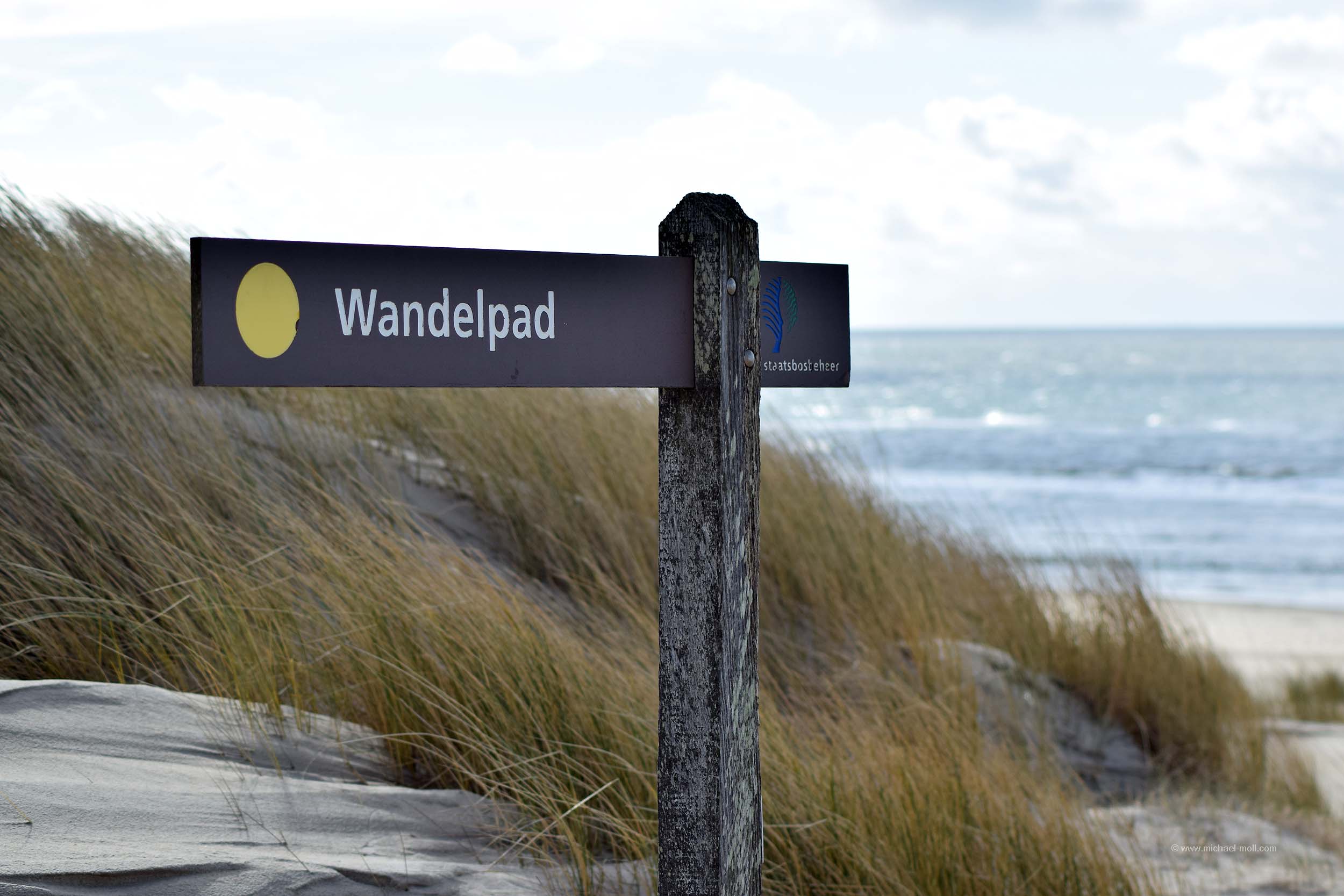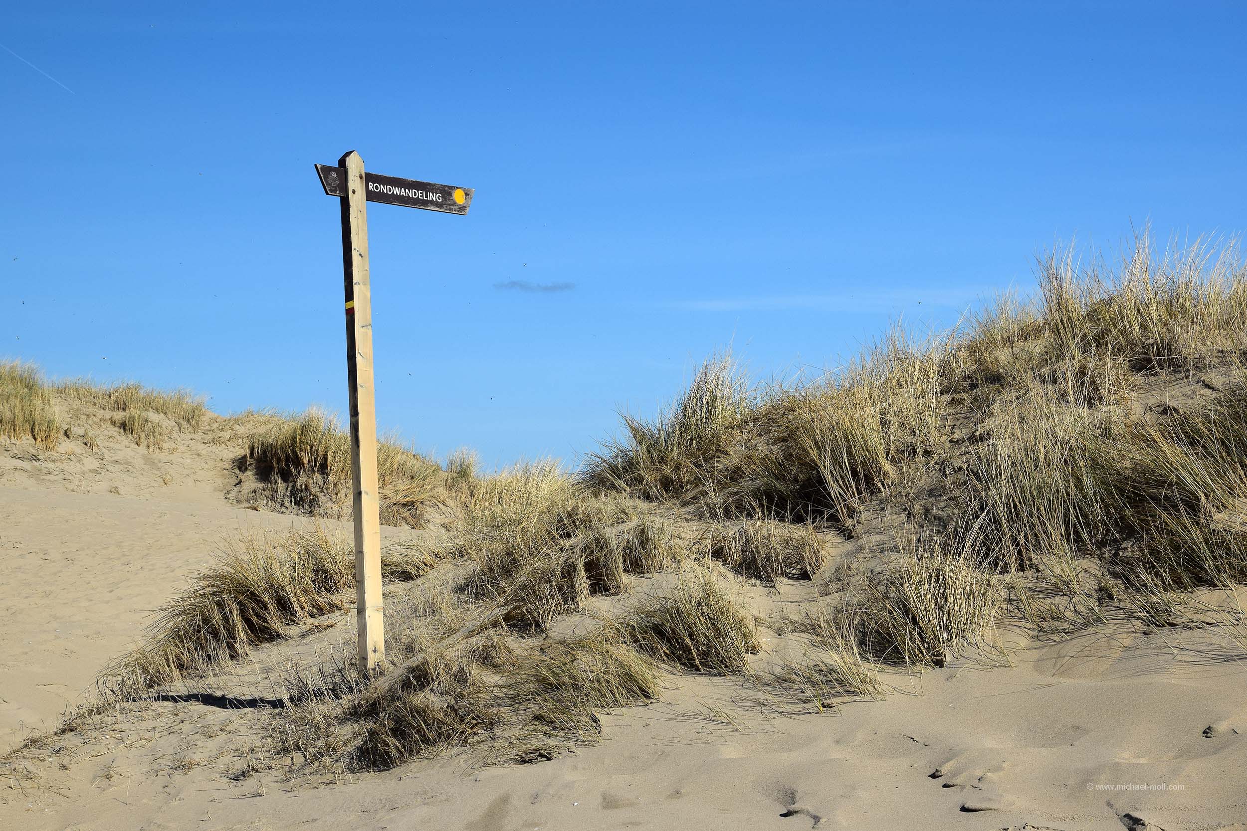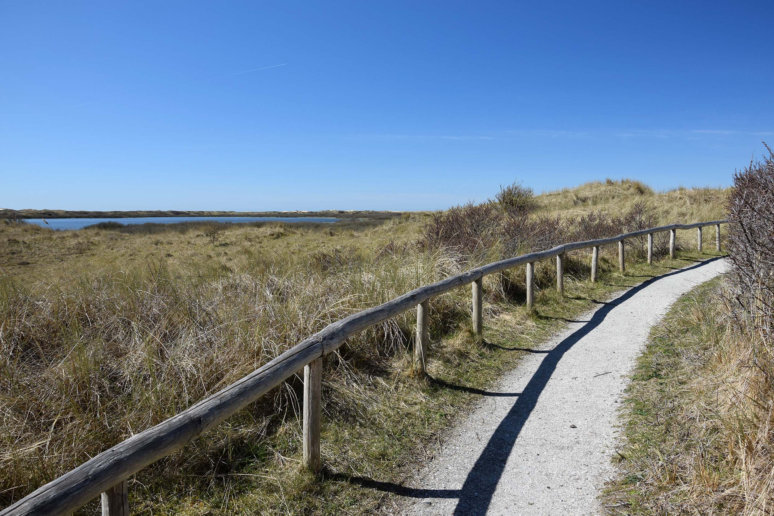 Auf direktem Weg nach Süden wollten wir dann auch nicht fahren, daher fuhren wir an der Ostküste entlang, wo es weder Dünen noch Sandstrand zu sehen gibt. Ein Deich auf der einen und Felder auf der anderen Seite dominierten das Bild. Lediglich an einer Stelle wurde dieses Idyll von einer hübschen Windmühle unterbrochen, an der wir für einen Fotostopp anhielten. Den Hauptort Den Burg lernten wir eigentlich nur ganz kurz kennen. Dort war es uns mit den vielen gastronomischen Angeboten einfach zu rummelig. Wir beließen es bei einem kurzen Andenkenkauf und besichtigten vielmehr die dortige Kriegsgräberstätte, an der wir erfuhren, dass eine ganze Menge Flugzeuge im Zweiten Weltkrieg auf die Insel abstürzten. Zu guter Letzt wollten wir noch die Dünen im Süden der Insel erkunden. Denn immerhin sind die Dünen von Texel ja ein Nationalpark und sie machten schon auf der Karte einen interessanten Eindruck. Die vom Wind geformten Sandhügel erheben sich oftmals aus einer ansonsten völlig flachen Landschaft, sodass man auch schon mal um die eine oder andere unberührte Düne herumgehen kann. Das wirkt ganz anders als wenn man sich in einer hügeligen Sandlandschaft befindet. Es war einfach nur schön. Und zum Schluss verlässt man die Dünen und steht auf einem einsamen und leeren Strand, auf dem man das Wasser nur in der Ferne erahnen kann. So kam es, dass wir auf diesen eigentlich als kurzen Zwischenstopp geplanten Halt wieder mal eben 8,5 Kilometer wanderten. Aber kein Wunder, denn das Wetter spielte an diesem Tag wirklich toll mit und bescherte uns einen tollen, blauen Himmel.