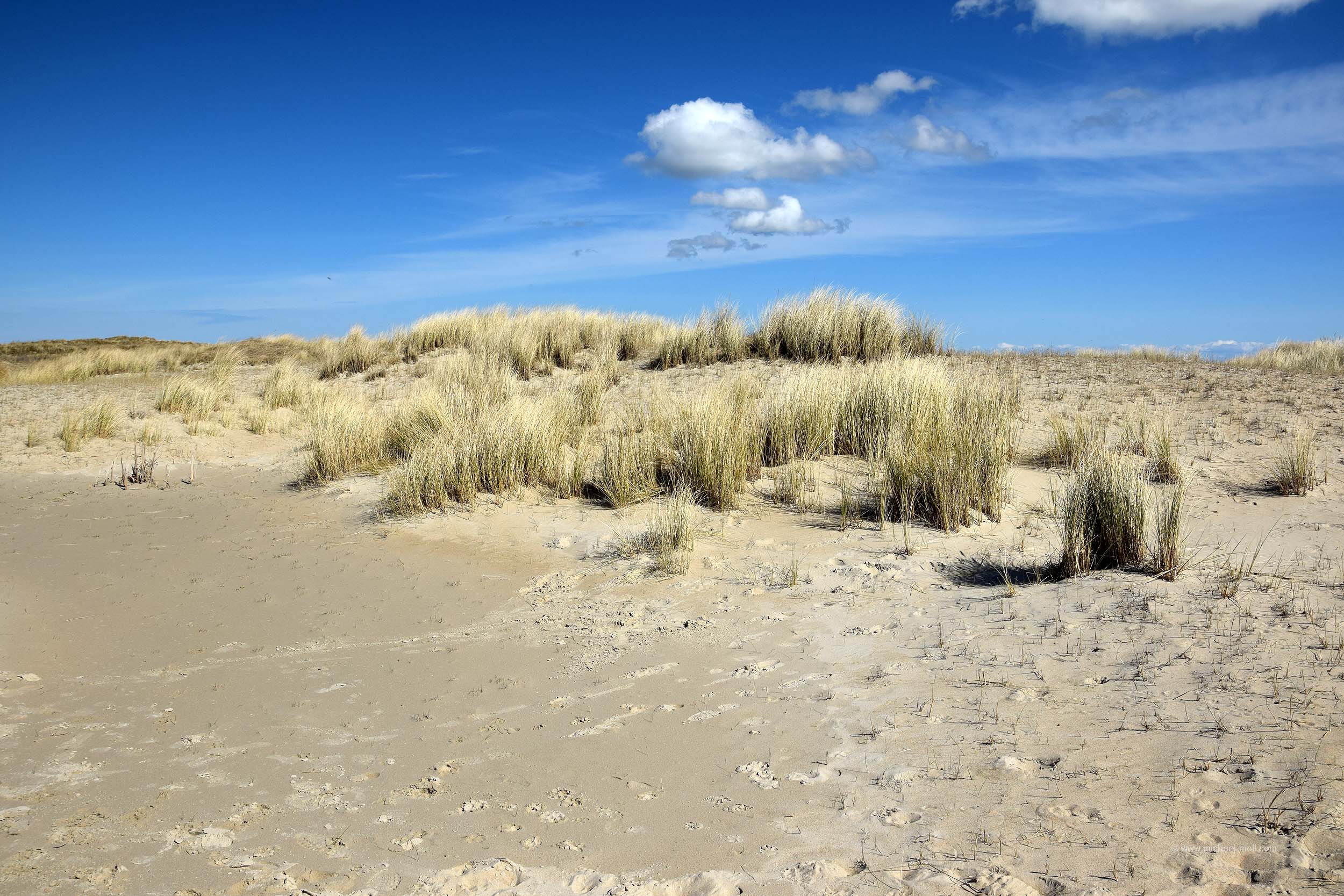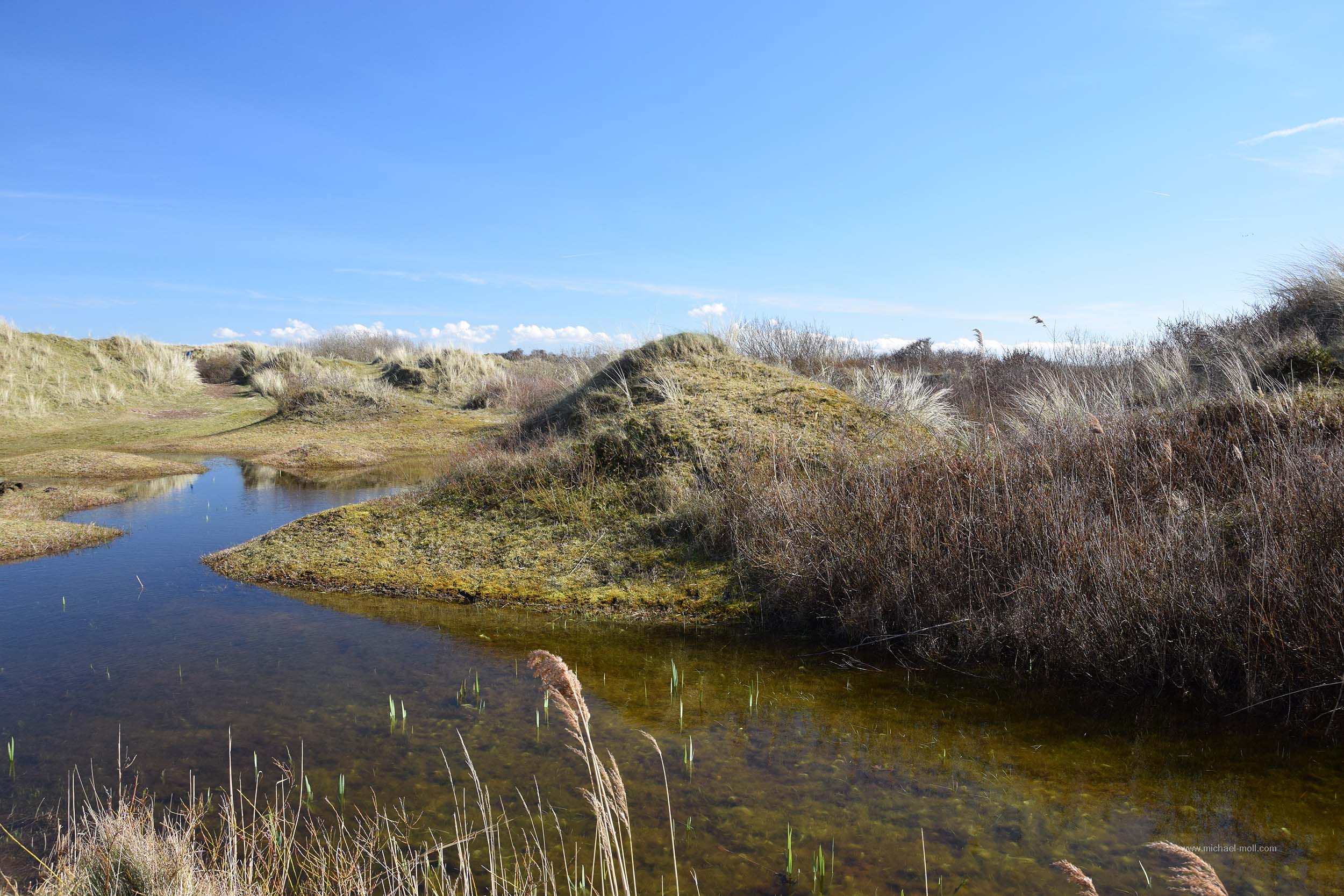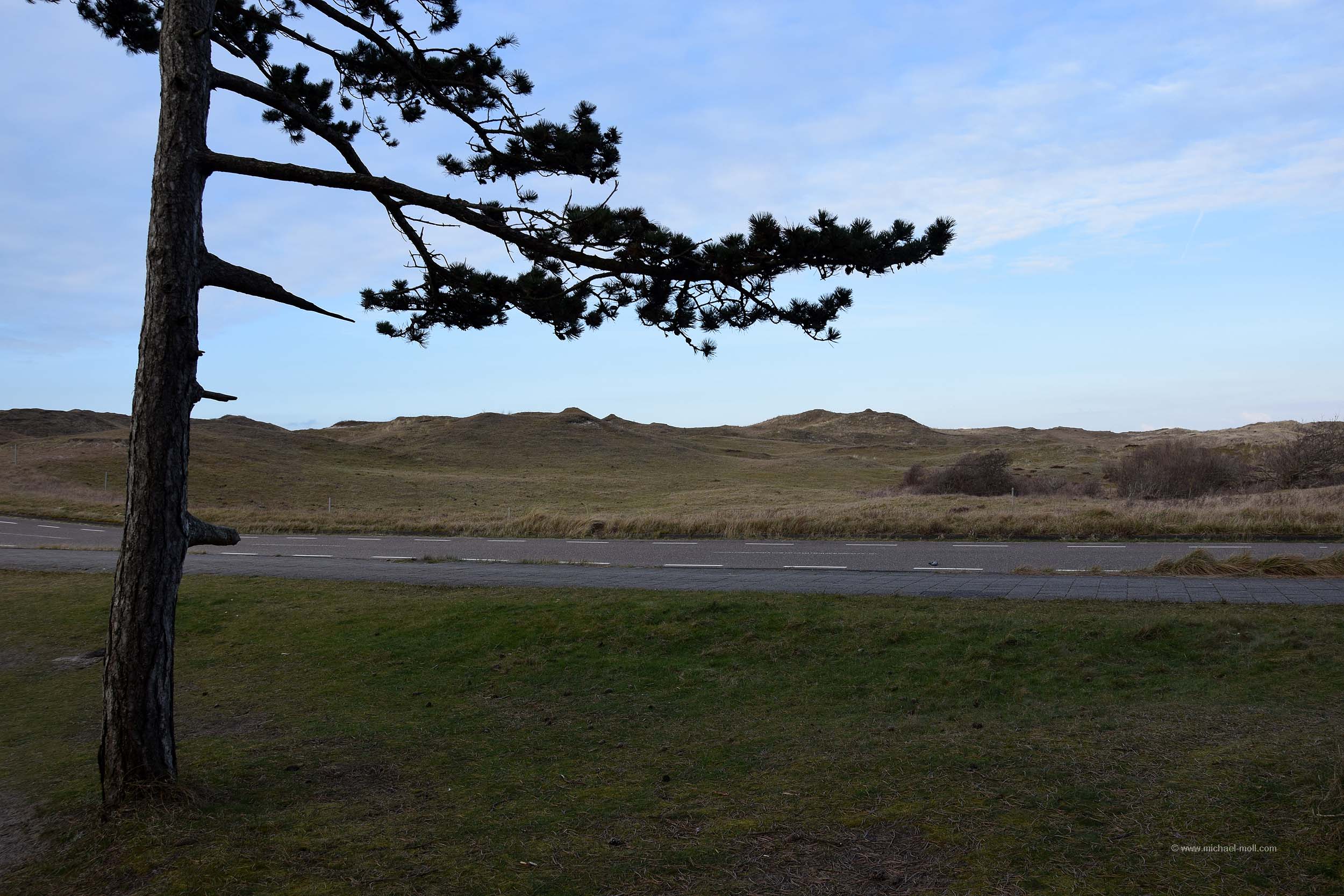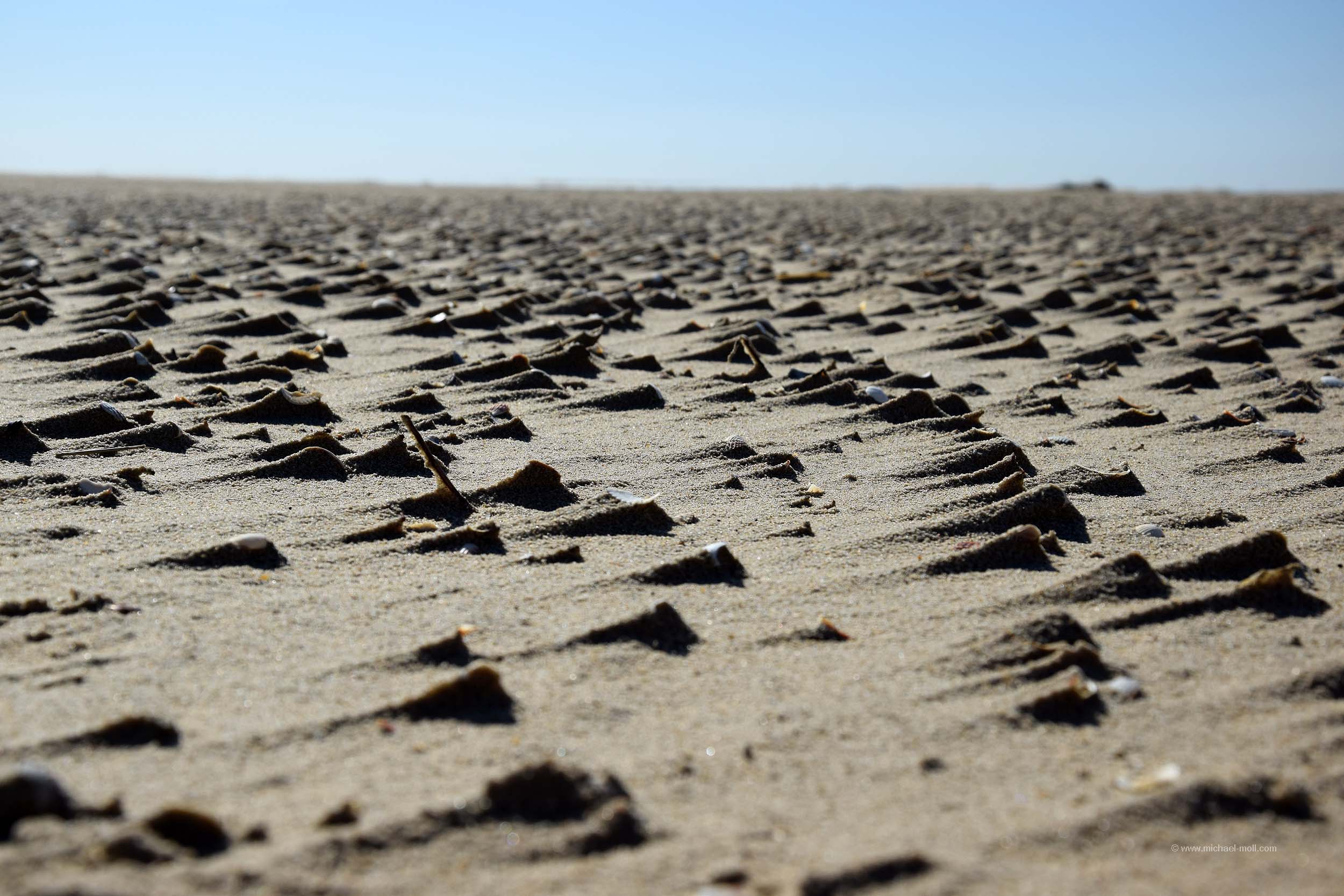Auf direktem Weg nach Süden wollten wir dann auch nicht fahren, daher fuhren wir an der Ostküste entlang, wo es weder Dünen noch Sandstrand zu sehen gibt. Ein Deich auf der einen und Felder auf der anderen Seite dominierten das Bild. Lediglich an einer Stelle wurde dieses Idyll von einer hübschen Windmühle unterbrochen, an der wir für einen Fotostopp anhielten. Den Hauptort Den Burg lernten wir eigentlich nur ganz kurz kennen. Dort war es uns mit den vielen gastronomischen Angeboten einfach zu rummelig. Wir beließen es bei einem kurzen Andenkenkauf und besichtigten vielmehr die dortige Kriegsgräberstätte, an der wir erfuhren, dass eine ganze Menge Flugzeuge im Zweiten Weltkrieg auf die Insel abstürzten. Zu guter Letzt wollten wir noch die Dünen im Süden der Insel erkunden. Denn immerhin sind die Dünen von Texel ja ein Nationalpark und sie machten schon auf der Karte einen interessanten Eindruck. Die vom Wind geformten Sandhügel erheben sich oftmals aus einer ansonsten völlig flachen Landschaft, sodass man auch schon mal um die eine oder andere unberührte Düne herumgehen kann. Das wirkt ganz anders als wenn man sich in einer hügeligen Sandlandschaft befindet. Es war einfach nur schön. Und zum Schluss verlässt man die Dünen und steht auf einem einsamen und leeren Strand, auf dem man das Wasser nur in der Ferne erahnen kann. So kam es, dass wir auf diesen eigentlich als kurzen Zwischenstopp geplanten Halt wieder mal eben 8,5 Kilometer wanderten. Aber kein Wunder, denn das Wetter spielte an diesem Tag wirklich toll mit und bescherte uns einen tollen, blauen Himmel.