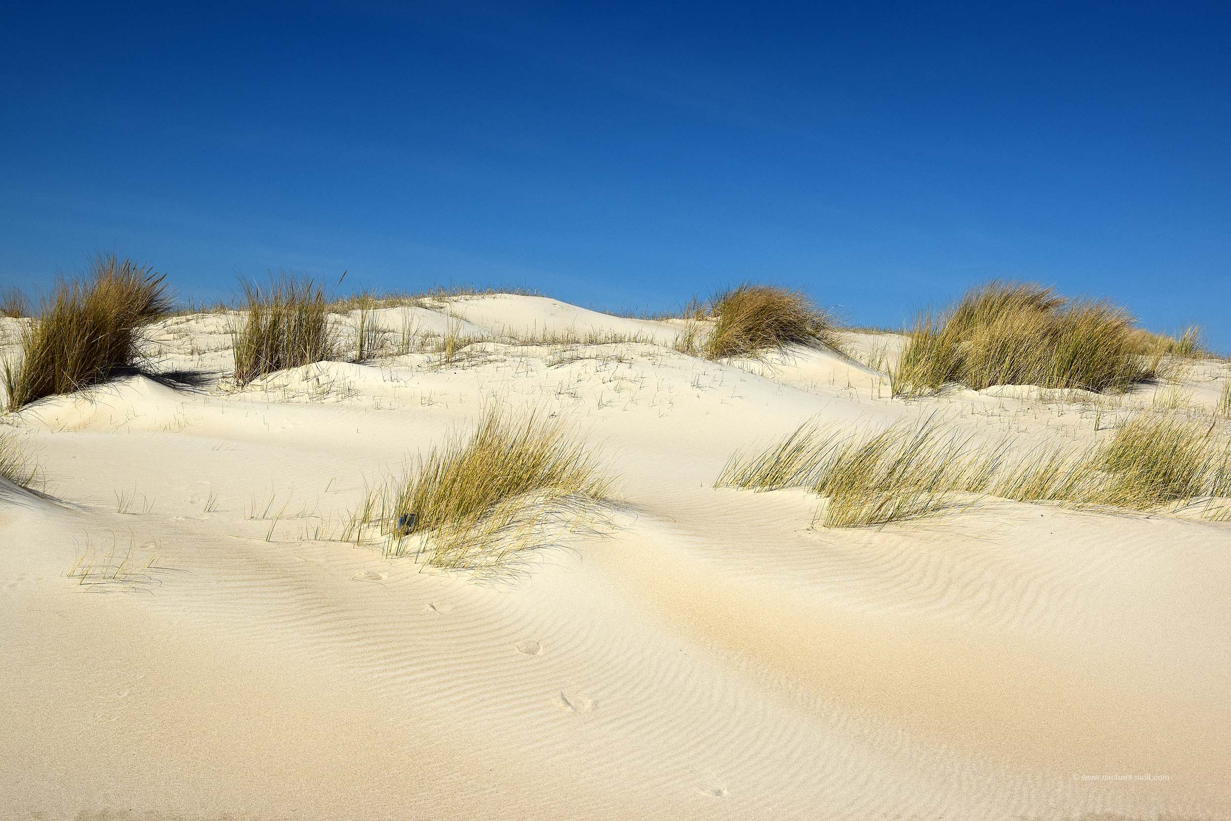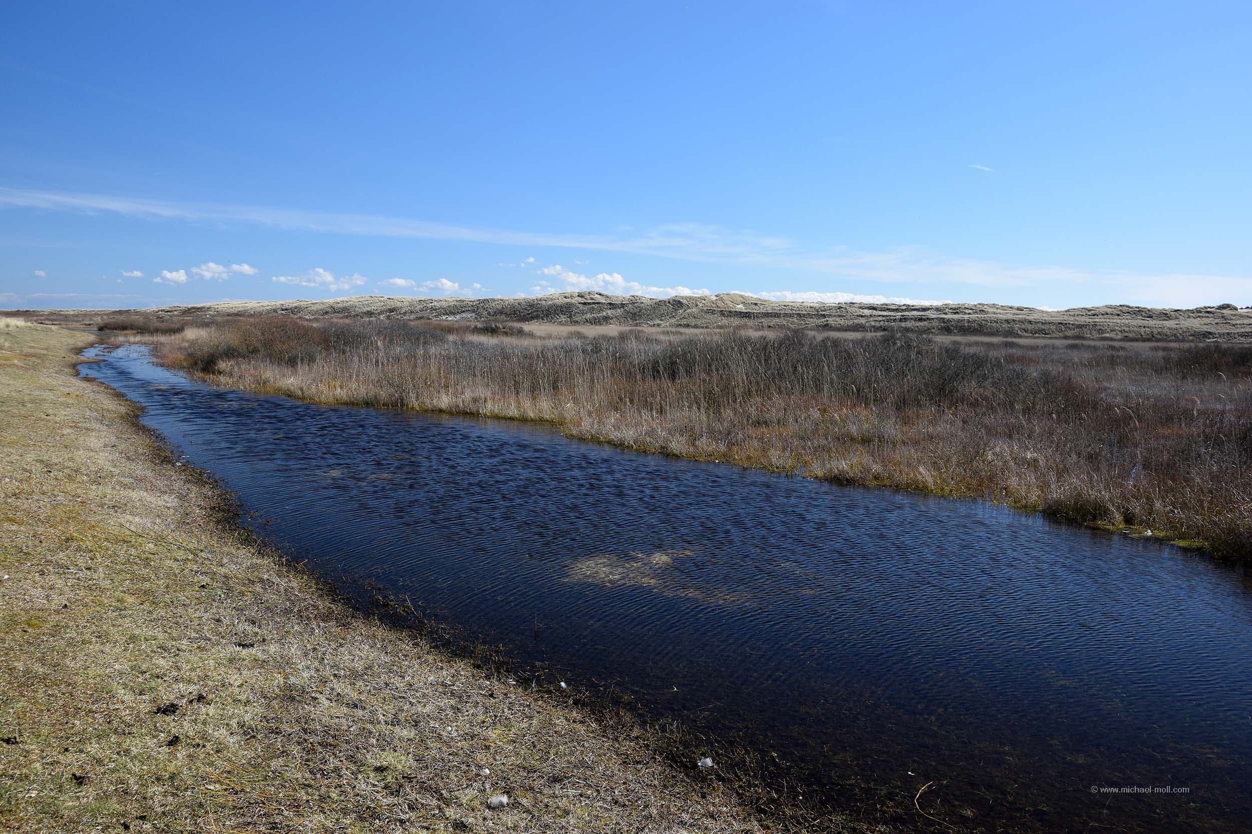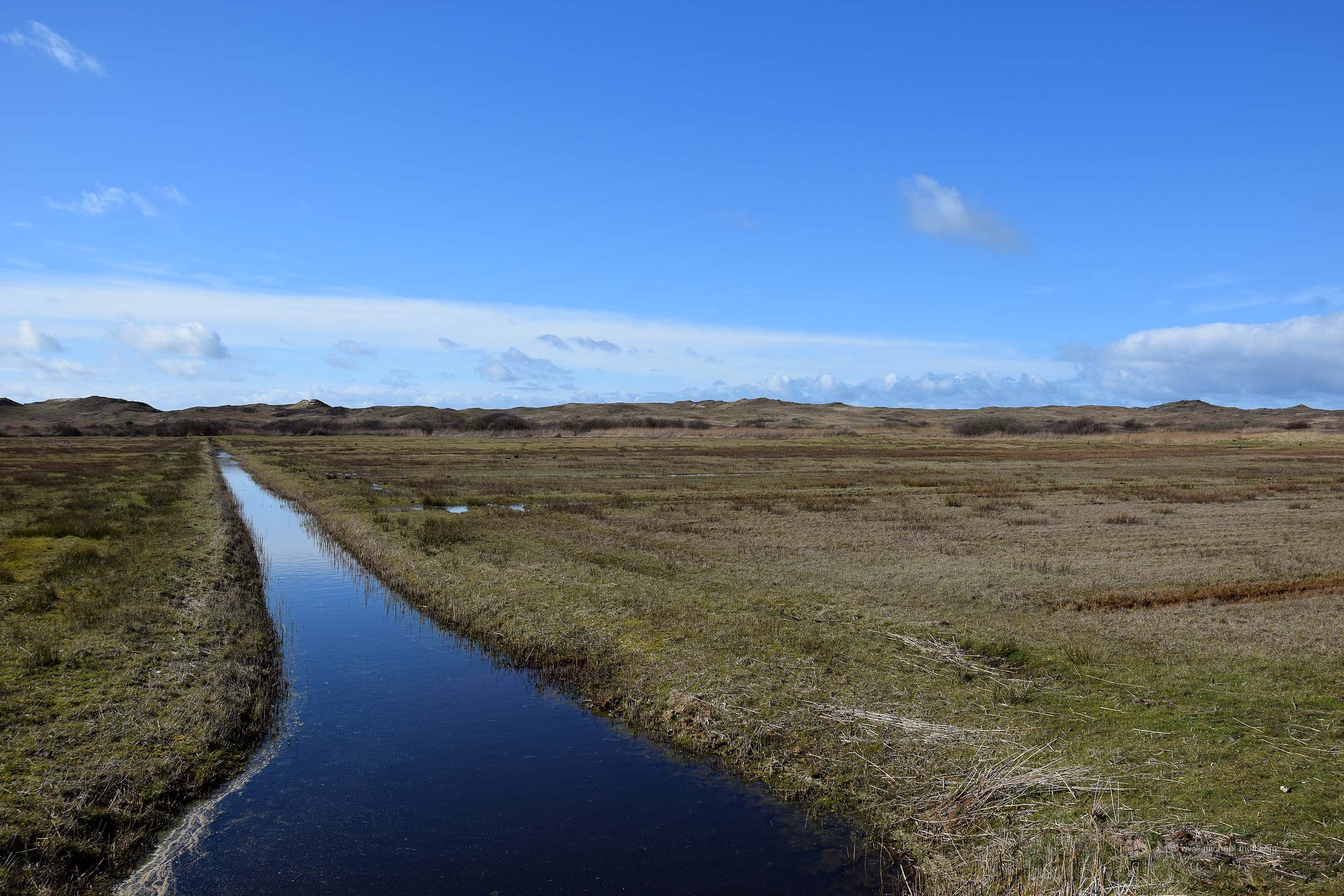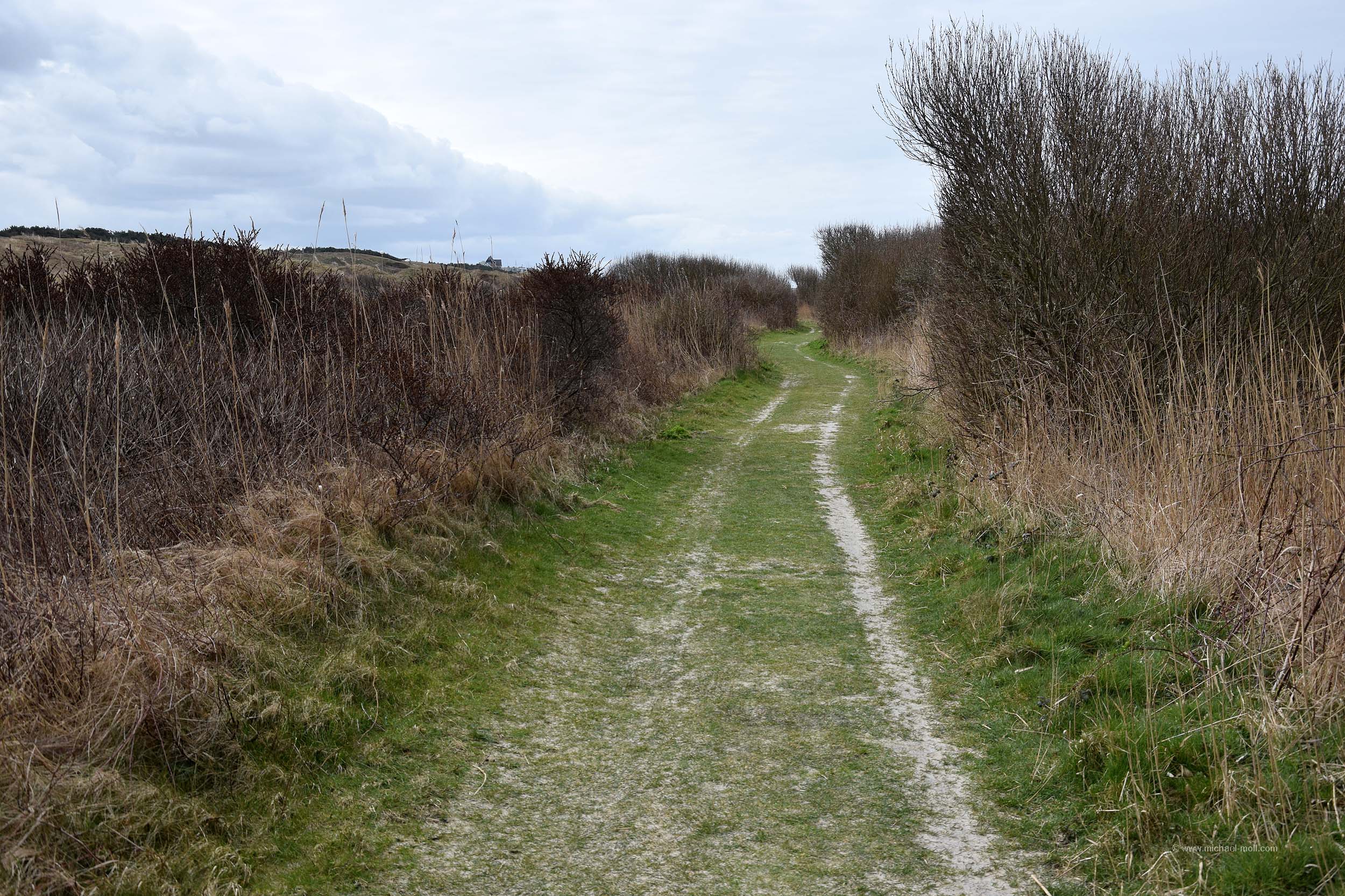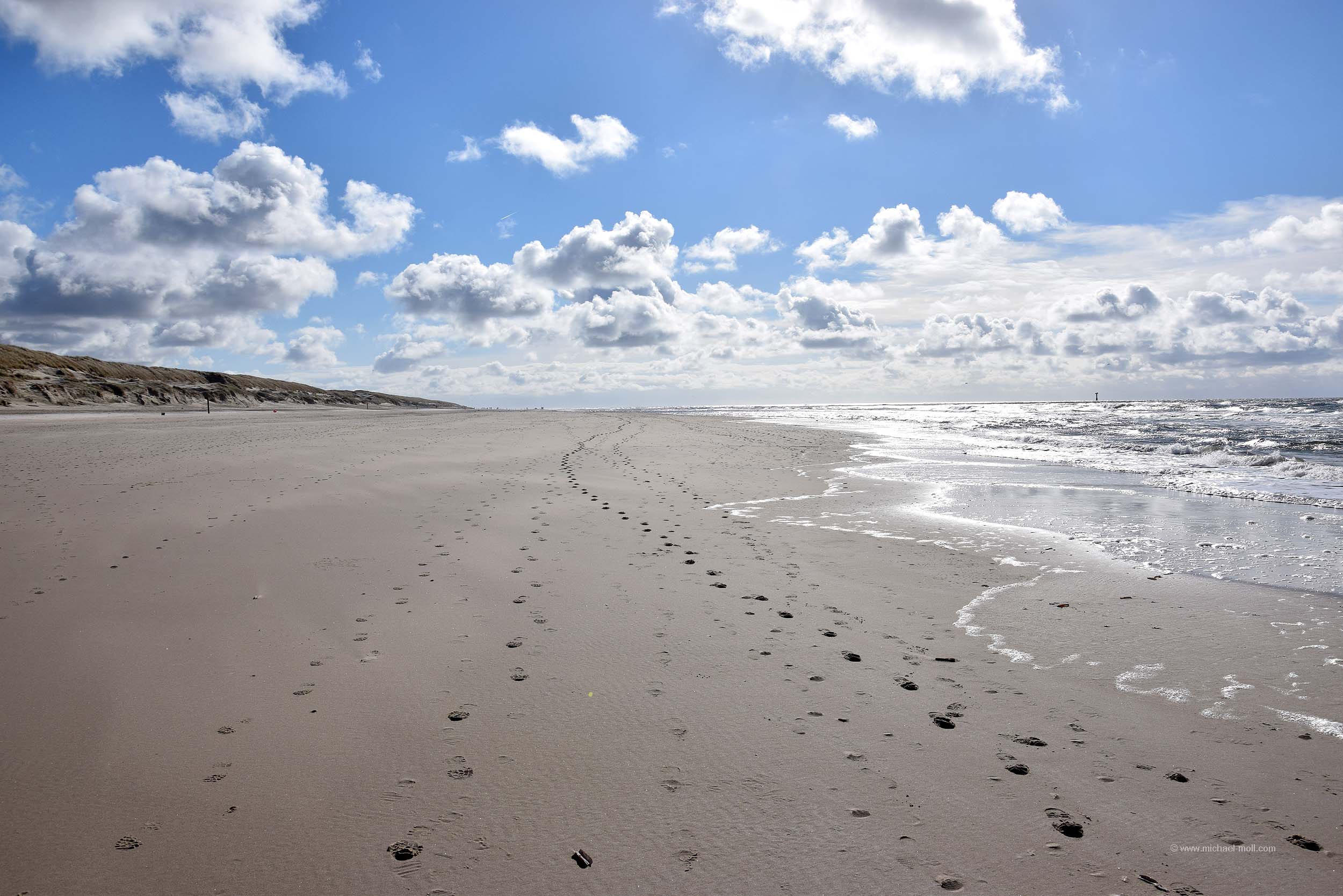Auf direktem Weg nach Süden wollten wir dann auch nicht fahren, daher fuhren wir an der Ostküste entlang, wo es weder Dünen noch Sandstrand zu sehen gibt. Ein Deich auf der einen und Felder auf der anderen Seite dominierten das Bild. Lediglich an einer Stelle wurde dieses Idyll von einer hübschen Windmühle unterbrochen, an der wir für einen Fotostopp anhielten. Den Hauptort Den Burg lernten wir eigentlich nur ganz kurz kennen. Dort war es uns mit den vielen gastronomischen Angeboten einfach zu rummelig. Wir beließen es bei einem kurzen Andenkenkauf und besichtigten vielmehr die dortige Kriegsgräberstätte, an der wir erfuhren, dass eine ganze Menge Flugzeuge im Zweiten Weltkrieg auf die Insel abstürzten. Zu guter Letzt wollten wir noch die Dünen im Süden der Insel erkunden. Denn immerhin sind die Dünen von Texel ja ein Nationalpark und sie machten schon auf der Karte einen interessanten Eindruck. Die vom Wind geformten Sandhügel erheben sich oftmals aus einer ansonsten völlig flachen Landschaft, sodass man auch schon mal um die eine oder andere unberührte Düne herumgehen kann. Das wirkt ganz anders als wenn man sich in einer hügeligen Sandlandschaft befindet. Es war einfach nur schön. Und zum Schluss verlässt man die Dünen und steht auf einem einsamen und leeren Strand, auf dem man das Wasser nur in der Ferne erahnen kann. So kam es, dass wir auf diesen eigentlich als kurzen Zwischenstopp geplanten Halt wieder mal eben 8,5 Kilometer wanderten. Aber kein Wunder, denn das Wetter spielte an diesem Tag wirklich toll mit und bescherte uns einen tollen, blauen Himmel.