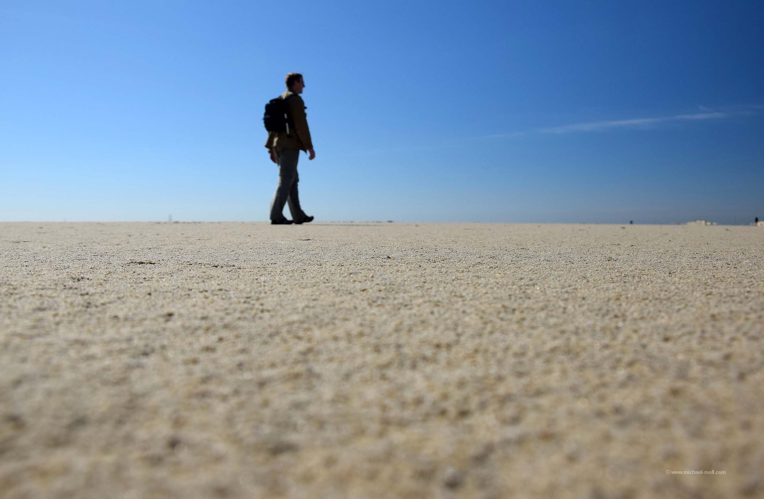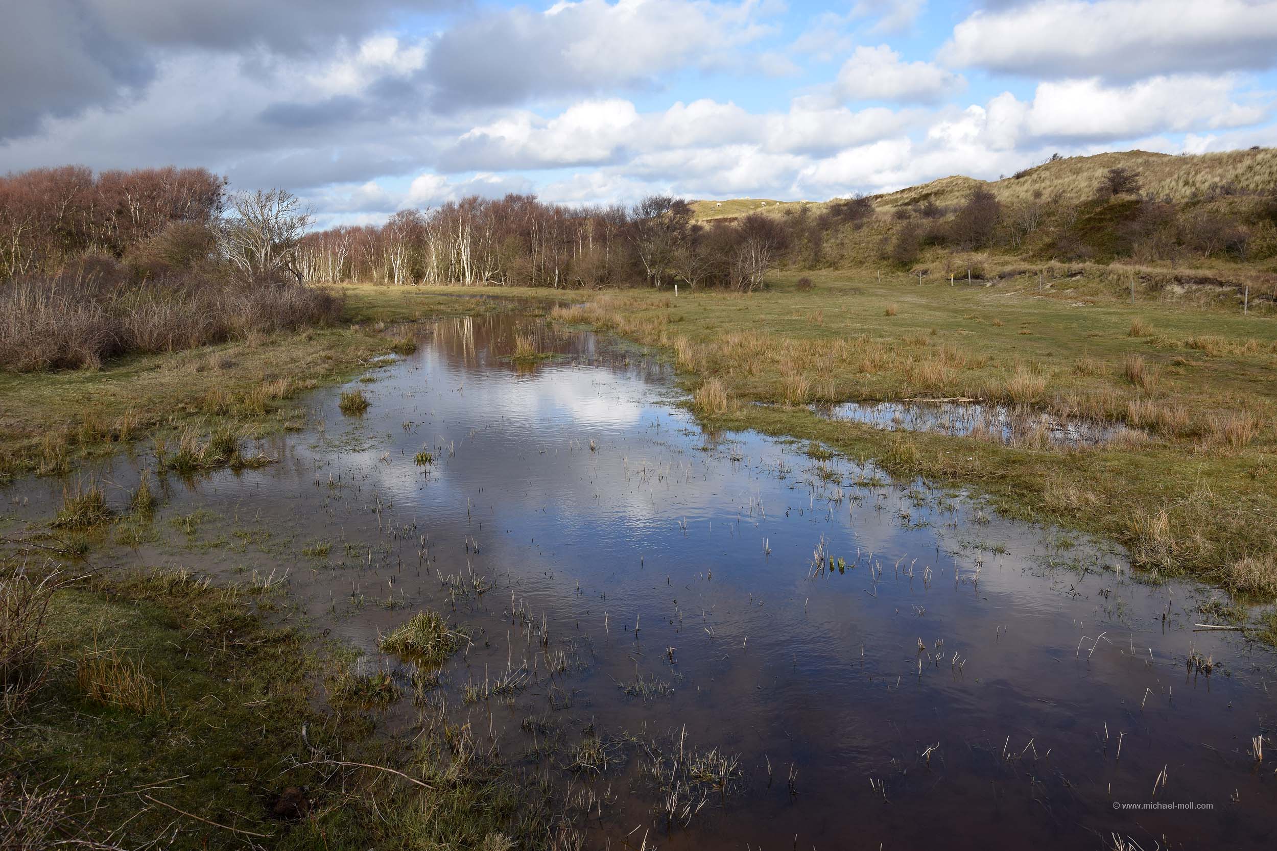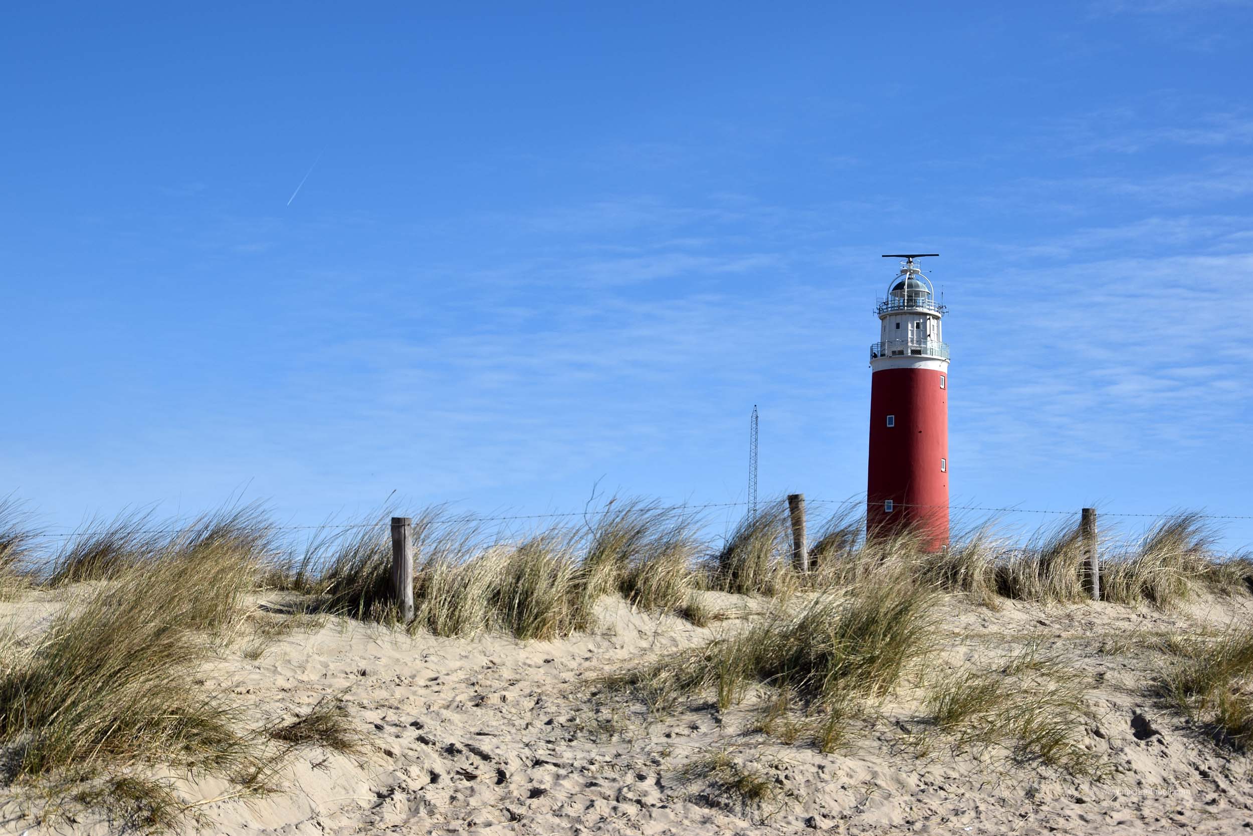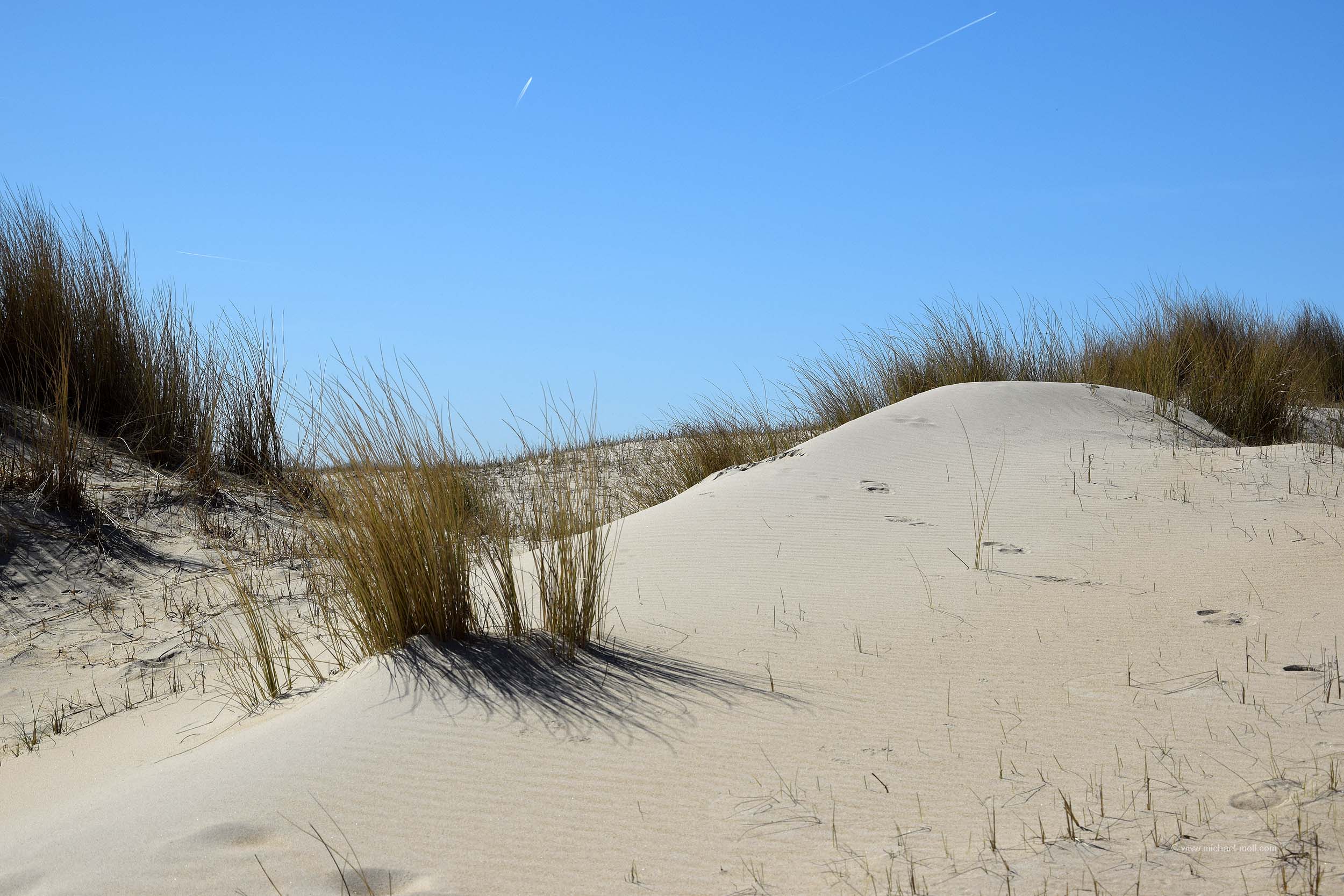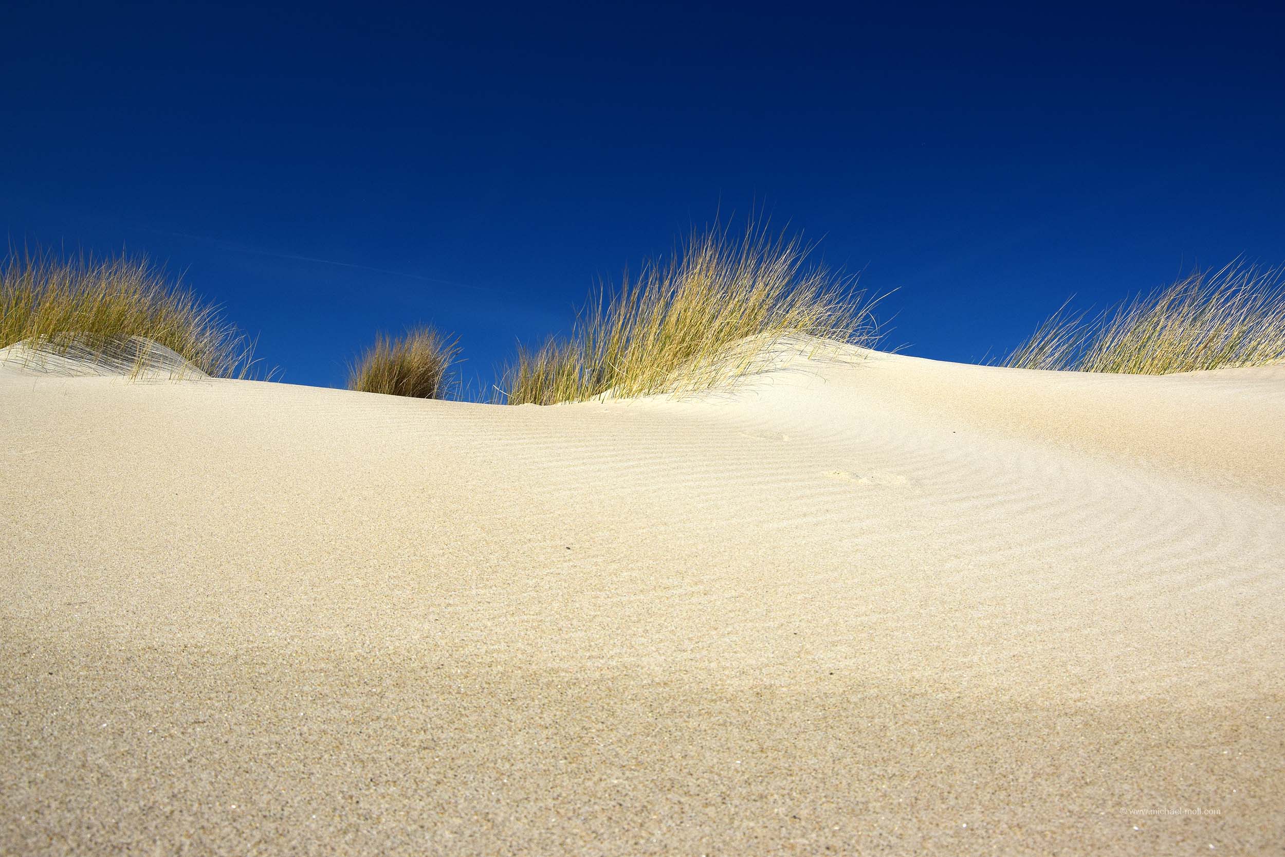 Auf direktem Weg nach Süden wollten wir dann auch nicht fahren, daher fuhren wir an der Ostküste entlang, wo es weder Dünen noch Sandstrand zu sehen gibt. Ein Deich auf der einen und Felder auf der anderen Seite dominierten das Bild. Lediglich an einer Stelle wurde dieses Idyll von einer hübschen Windmühle unterbrochen, an der wir für einen Fotostopp anhielten. Den Hauptort Den Burg lernten wir eigentlich nur ganz kurz kennen. Dort war es uns mit den vielen gastronomischen Angeboten einfach zu rummelig. Wir beließen es bei einem kurzen Andenkenkauf und besichtigten vielmehr die dortige Kriegsgräberstätte, an der wir erfuhren, dass eine ganze Menge Flugzeuge im Zweiten Weltkrieg auf die Insel abstürzten. Zu guter Letzt wollten wir noch die Dünen im Süden der Insel erkunden. Denn immerhin sind die Dünen von Texel ja ein Nationalpark und sie machten schon auf der Karte einen interessanten Eindruck. Die vom Wind geformten Sandhügel erheben sich oftmals aus einer ansonsten völlig flachen Landschaft, sodass man auch schon mal um die eine oder andere unberührte Düne herumgehen kann. Das wirkt ganz anders als wenn man sich in einer hügeligen Sandlandschaft befindet. Es war einfach nur schön. Und zum Schluss verlässt man die Dünen und steht auf einem einsamen und leeren Strand, auf dem man das Wasser nur in der Ferne erahnen kann. So kam es, dass wir auf diesen eigentlich als kurzen Zwischenstopp geplanten Halt wieder mal eben 8,5 Kilometer wanderten. Aber kein Wunder, denn das Wetter spielte an diesem Tag wirklich toll mit und bescherte uns einen tollen, blauen Himmel.