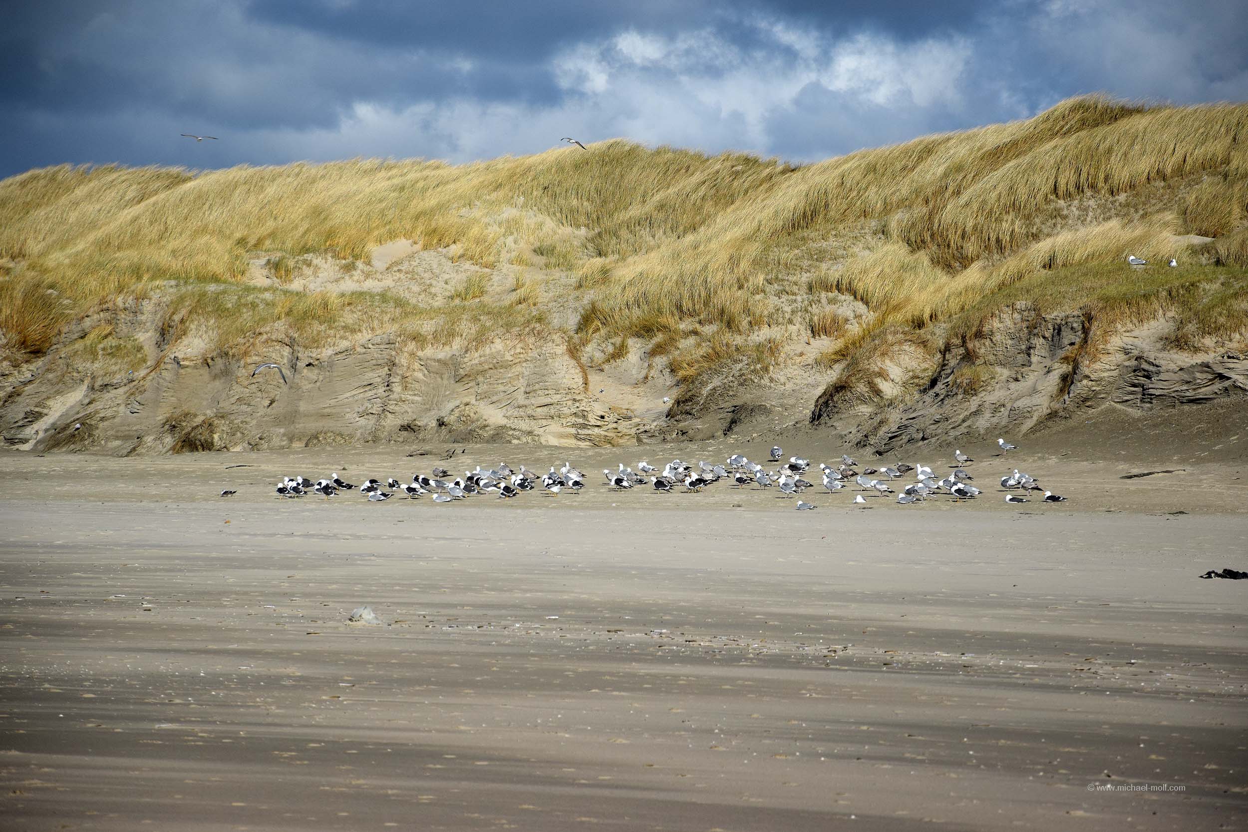 Den folgenden Ostersamstag verbrachten wir ganz in Ruhe und ohne Fahrt. Morgens gingen wir ein wenig durch den Ort De Koog, der uns allerdings nicht besonders zusagte. Er bestand im Wesentlichen aus gastronomischen Einrichtungen und so bogen wir nach seiner Durchquerung schnell ab, um wieder an den Strand zu gelangen. Bei starkem und kaltem Gegenwind stapften wir langsam nordwärts, beobachteten zahlreiche Vögel und ließen es uns gut gehen. Wir gingen wieder zu den Dünen, erklommen einen kleinen Aussichtspunkt und waren erst nach einigen Stunden wieder am Wohnmobil angekommen. Dort wärmten wir uns kurz auf und hatten dabei sogar noch das Glück, dass es gerade anfing zu regnen, als wir im Auto ankamen. Zwei Stunden später zogen wir wieder los, um eine größere Runde zurückzulegen. Auf der Satellitenansicht sahen wir eine Art Flussmündung weiter im Norden, zu der wir spazieren wollten. Eigentlich wollten wir zwar durch die Dünenlandschaft, aber die war teilweise wegen brütender Vögel gesperrt, sodass uns zunächst nur der Spaziergang am Strand blieb. So legten wir vormittags eine Strecke von 7,5 Kilometern zurück und am Nachmittag nochmals 11,5 Kilometer. Zur Belohnung gab es am Abend wieder Kibbeling im Restaurant Paal 21. Ich muss sagen, dass es dort wirklich sehr gut geschmeckt hat. Nur entschlossen wir uns am zweiten Abend, drinnen zu essen.