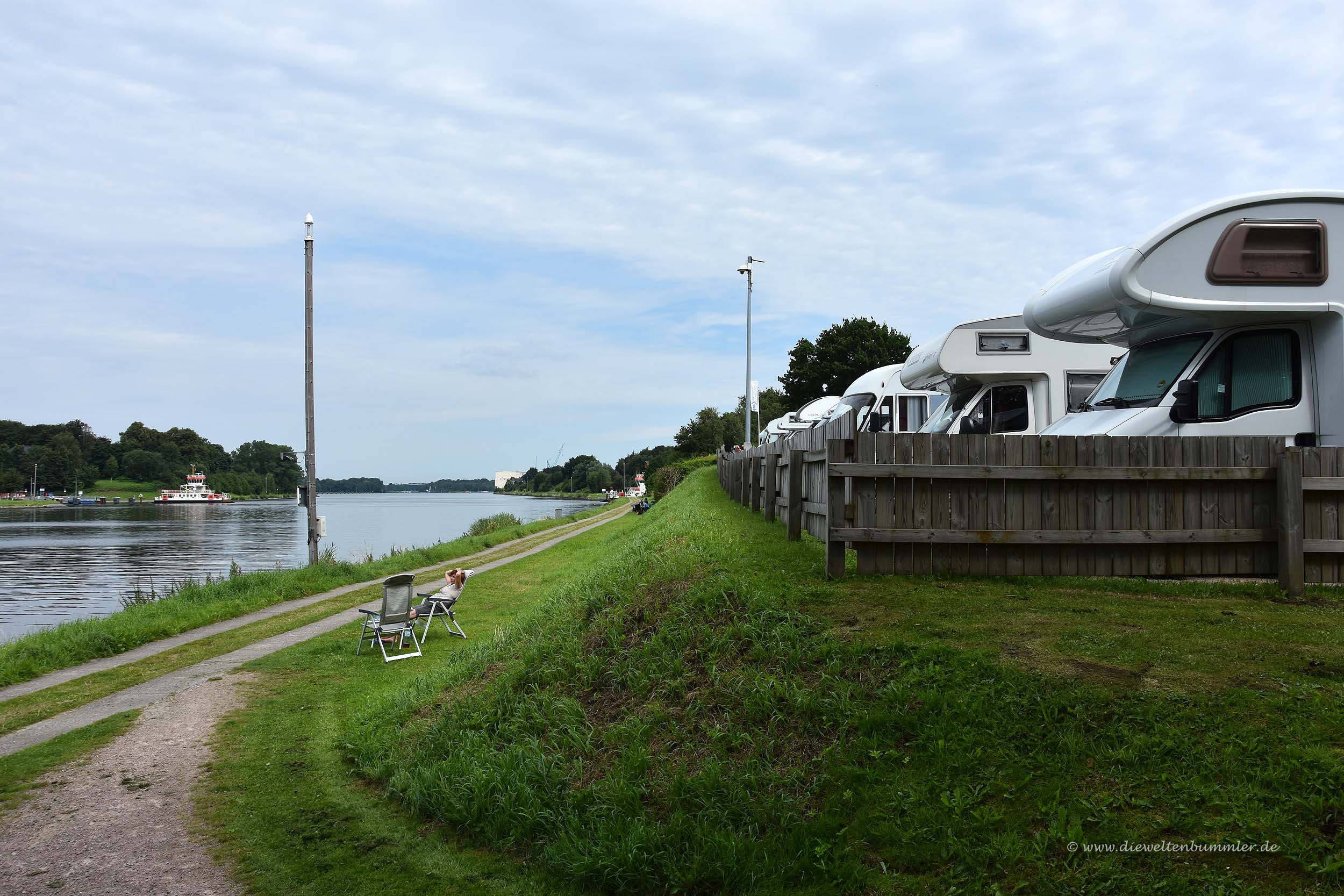 Gut, die Wohnmobilstellplätze besichtigten wir als Erstes. Sie waren nett, zweifellos. Und wer in der ersten Reihe steht, hat auch einen schönen Blick auf die vorüberziehenden Schiffe. Aber da wir Wohnmobilstellplätze in der Regel nur zum Übernachten nutzen und nicht, um Ausblicke zu genießen, ist das für uns irrelevant. Abgesehen davon hätten wir jetzt gar keinen Platz in der ersten Reihe bekommen, zumindest nicht in Schacht-Audorf. Auf dem anderen Stellplatz etwas außerhalb von Rendsburg war dahingegen viel Platz.
