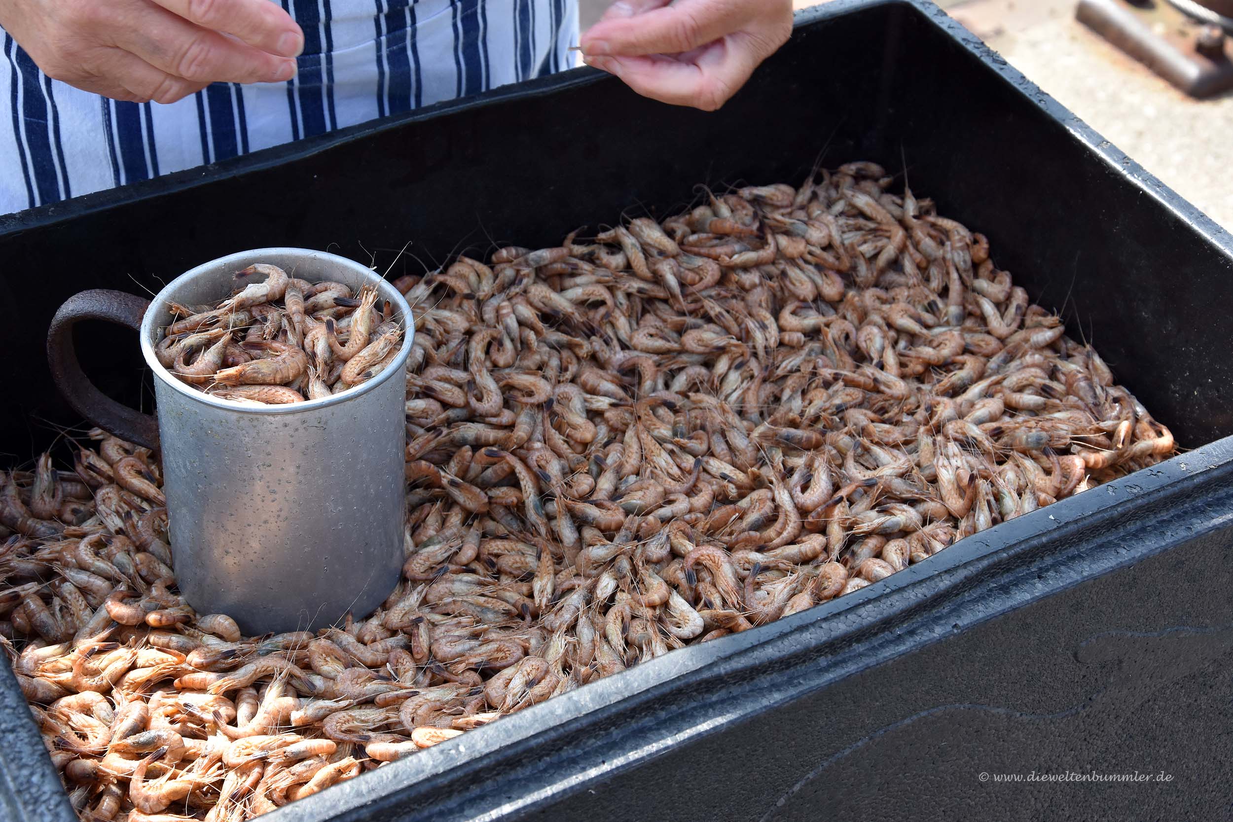 Am Hafen angekommen steht da eine ältere Dame und verkauft frische Nordseekrabben. Sieht interessant aus, aber geht das jetzt schon wieder los? Ich finde Krabben ekelig und habe ein weiteres Kindheitstrauma zu verarbeiten. Damals war ich neugierig und wollte ein Krabbenbrötchen essen. Ich weiß noch heute, wo dieses Krabbenbrötchen nach nur einem Bissen gelandet ist. Nein, danke. Ich will das nicht. Aber Moni war neugierig. Sie hat probiert, immerhin.