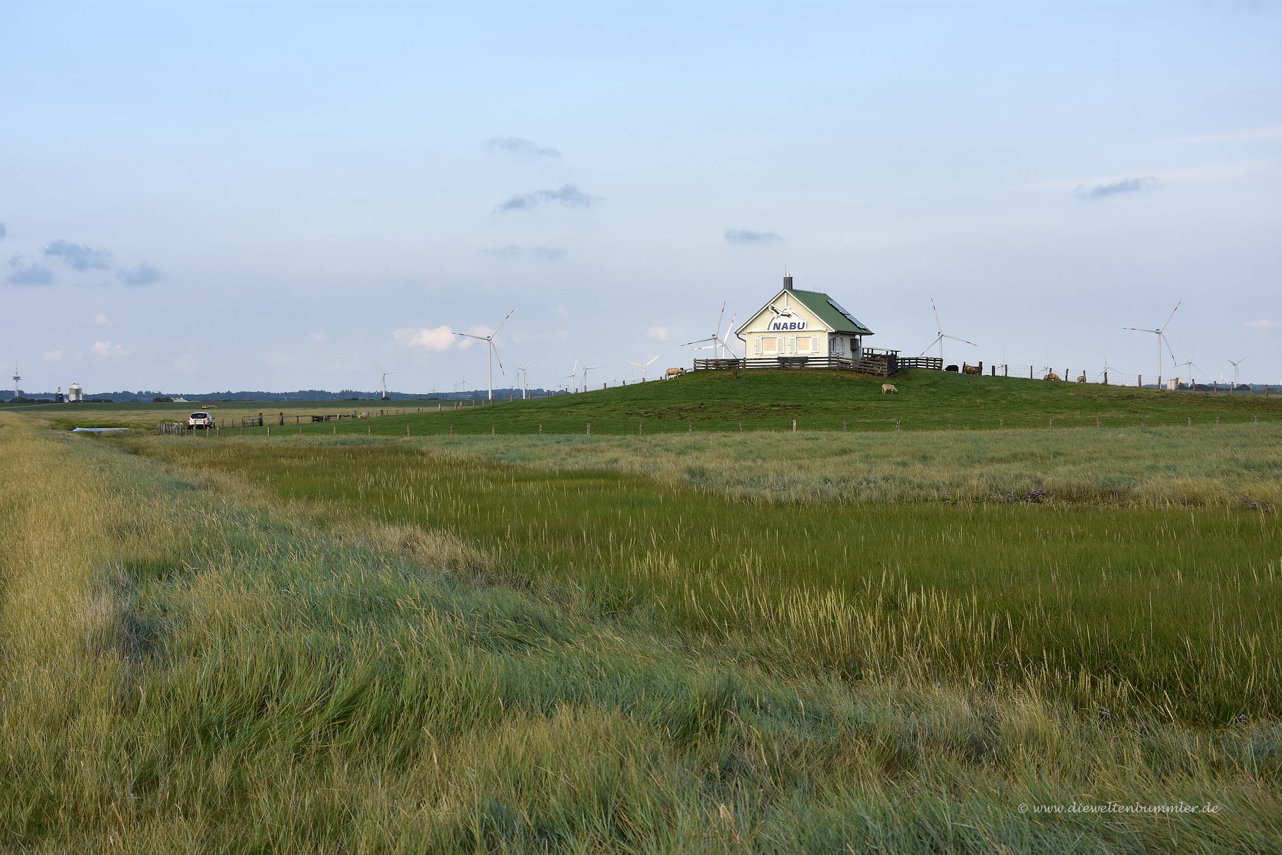 Wir hatten Lust auf einen Spaziergang und gingen am Nabu-Haus vorbei, das auf einer Warft steht. Warften sind die aufgeschütteten Erdhügel, die bei einer Sturmflut trotzdem noch aus dem Wasser ragen, selbst wenn die Hallig ansonsten komplett unter Wasser steht.