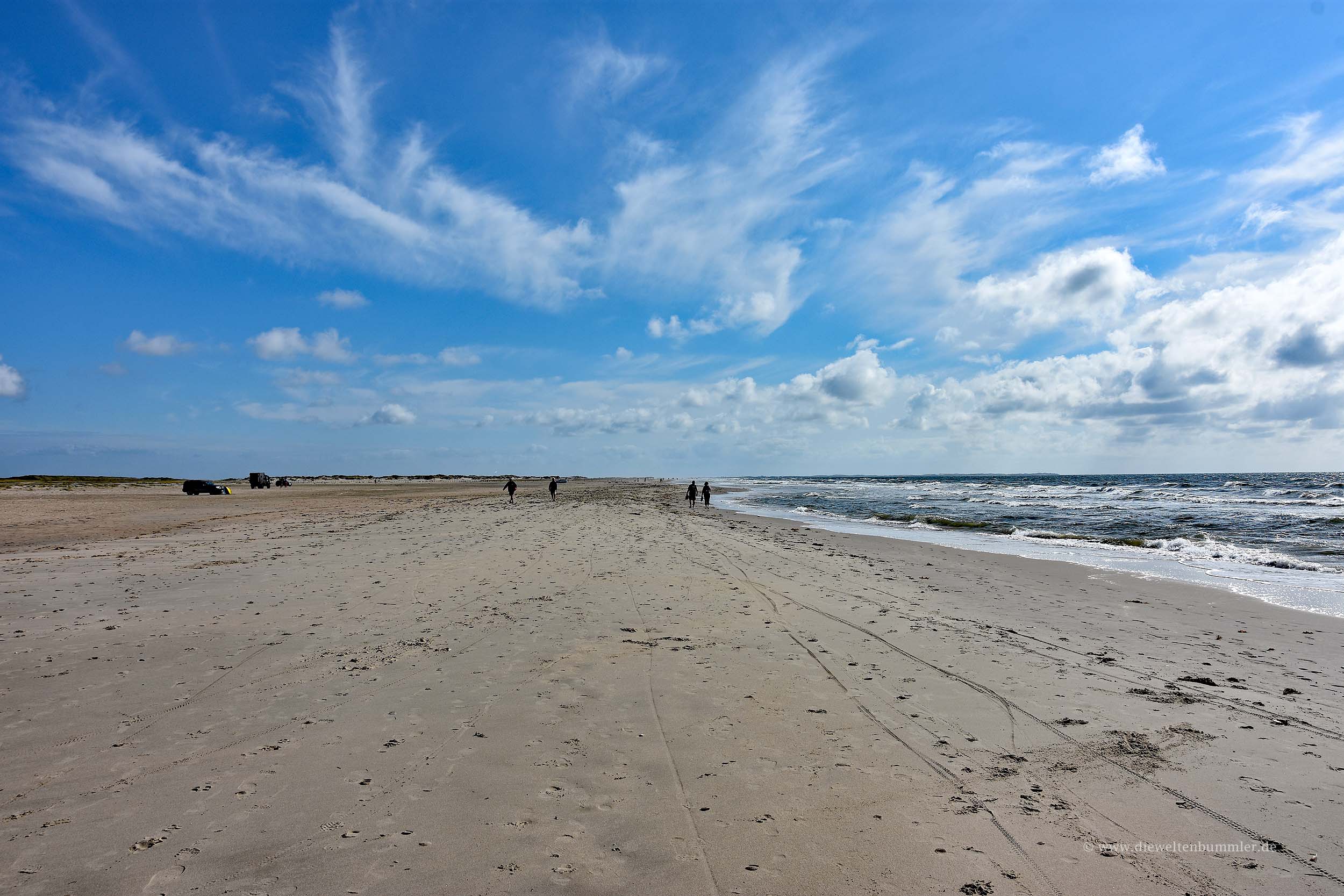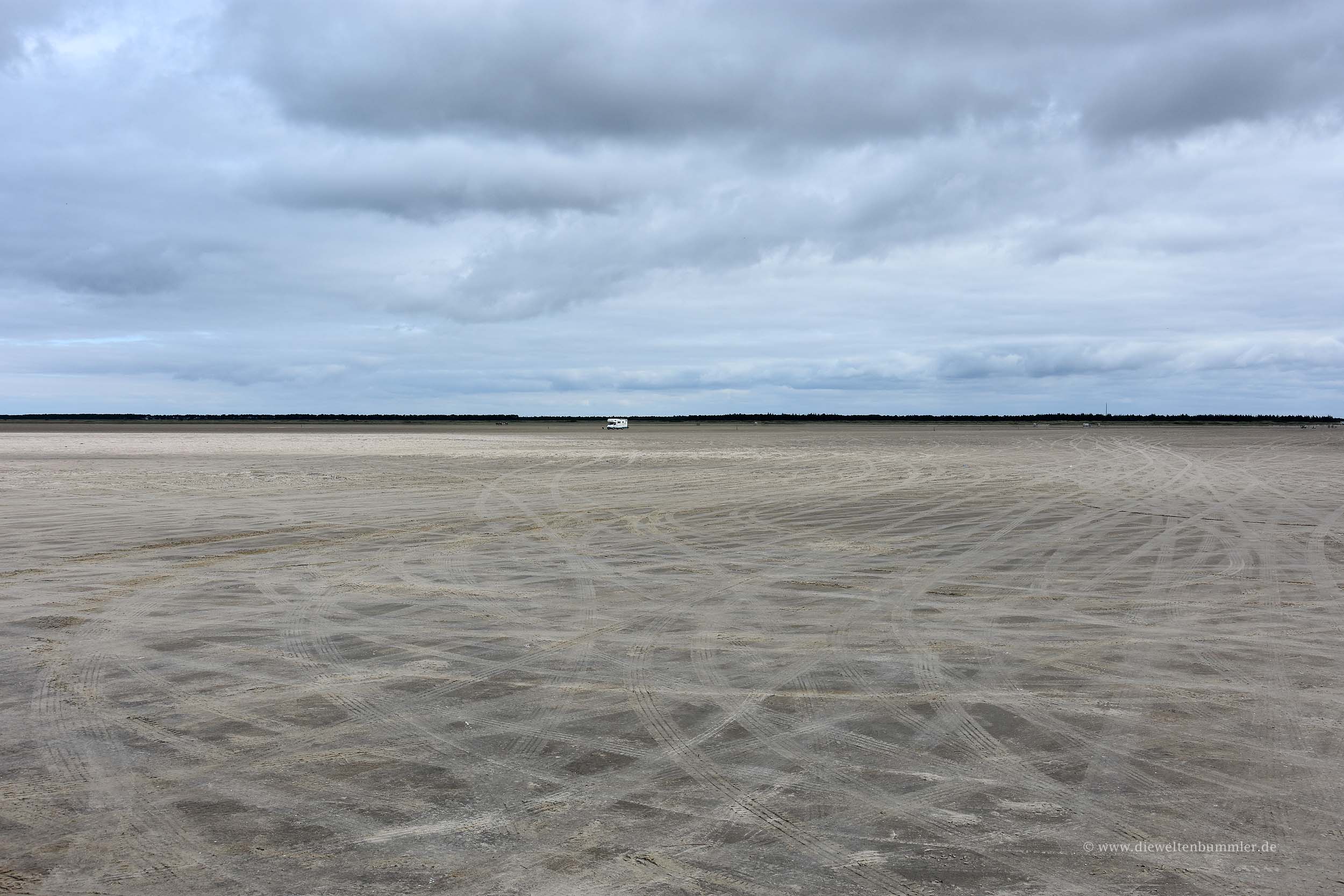 Nach dem Aufstehen und Bezahlen am Automaten des Wohmobilstellplatzes fuhren wir jedoch als Erstes in Richtung Süden. Ich wollte noch einmal gerne für ein paar Bilder zum Fährhafen, von wo aus man nach Sylt gelangt. Außerdem hatten wir am Vortag noch auf der Karte einen weiteren Strand gefunden, den man mit dem Auto befahren kann. Der Zugang dürfte im Süden liegen, unweit des Stellplatzes. Und so war es auch. Wir verließen die befestigte Straße, steuerten unseren Kastenwagen auf den weiten Sandstrand und fuhren noch sehr lange, bis wir vor den Dünen zum Stehen kamen. Hier stiegen wir aus und gingen ein letztes Mal in Richtung Deutschland.