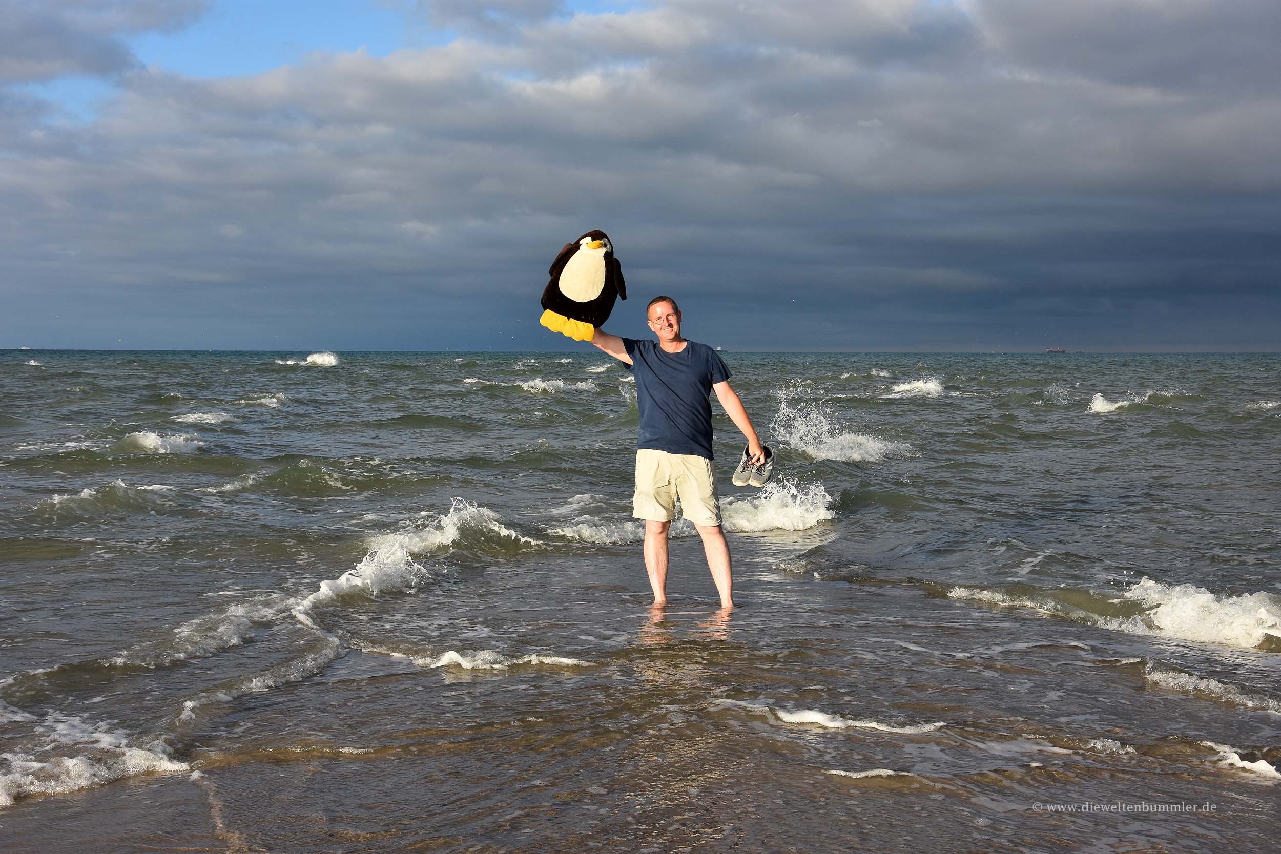 Und zwar bis zu der Stelle, wo alle Touristen hier im Norden hin wollen. Nämlich dort hin, wo die Ostsee und die Nordsee aufeinander treffen – auf die Landzunge Grenen. Wir waren dort zwar schon vor vielen Jahren, doch so wirklich daran erinnern konnten wir uns nicht mehr. Später sahen wir auf unseren alten Bildern, dass wir sehr schlechtes Wetter hatten. Vermutlich sind wir daher nicht lange der Spitze geblieben. Doch dieses Mal strahlte der Himmel blau und wir konnten unsere Beine rechts und links in Nord- und Ostsee gleichzeitig stellen. Oder besser gesagt, in das Kattegat und in den Skagerrag. Da ich Pingu vergessen hatte und ich von diesem Ort noch kein Pingu-Foto besaß, gingen wir zum Wohnmobil zurück, holten ihn und spazierten gleich im Anschluss ein zweites Mal zur Landzunge, um auch Pingu halbwegs in den Sand zu setzen.