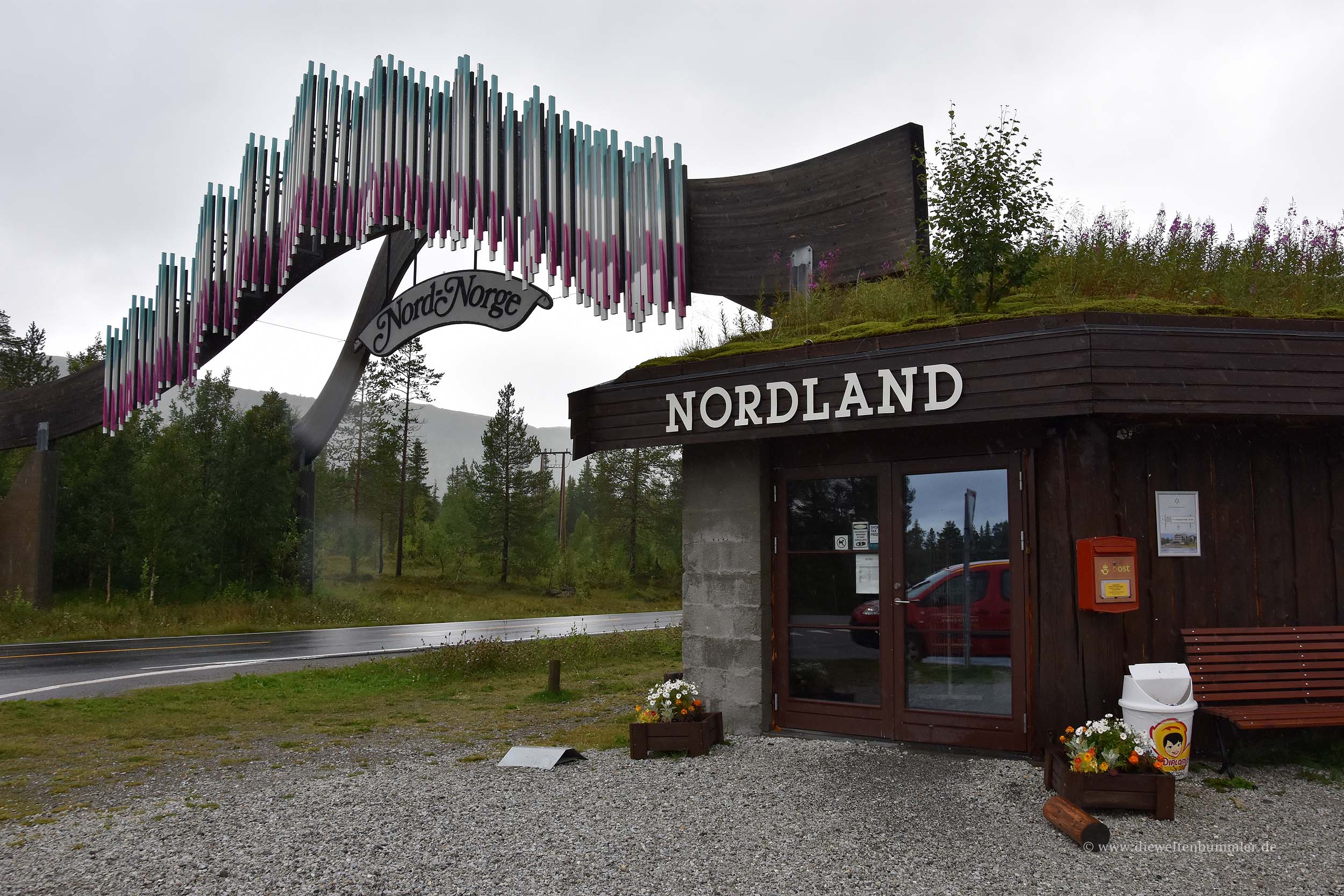 Am Morgen verließen wir den Stellplatz recht zügig. Wir hatten ja noch viel Wegstrecke vor uns und die E6 gleich nebenan. Also nutzten wir sie und fuhren wie gehabt weiter nordwärts. Ohne größere Verzögerungen kamen wir nach rund drei Stunden an die Grenze der beiden norwegischen Provinzen Nord-Trøndelag und Nordland. Alleine schon die Bezeichnung Nord in den beiden Namen war natürlich schön zu lesen. Das Wetter war schlecht und daher hielten wir nur kurz an dem Rastplatz, der sich an dieser Provinzgrenze befindet. Nett war hier aber auf jeden Fall der Torbogen, der hier über der E6 verläuft und quasi das Eingangstor zur Provinz Nordland bzw. nach Nordnorwegen markiert. Dennoch, ein weiter Weg zum Nordkap war es immer noch. Aber weil das Wetter nicht wirklich eine Schönheit war, nutzten wir die Gelegenheit, um weitere Kilometer zu machen. Es folgten die Ortschaften Mosjøen und Mo i Rana. In letzterer wussten wir von einer Entsorgungsstation, die sich links der E6 befindet und die wir so ansteuerten, als würden wir jede Woche dort Halt machen.