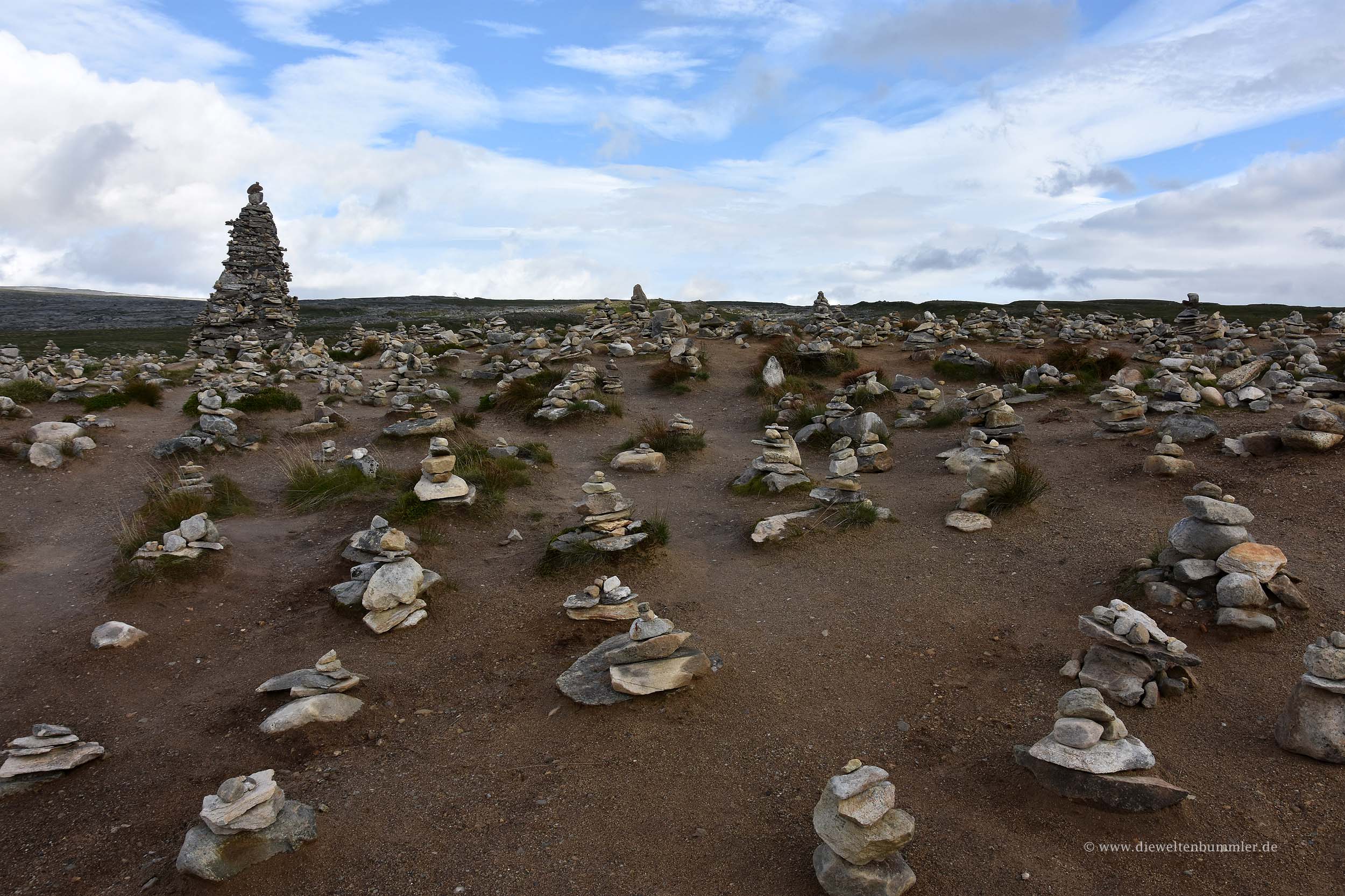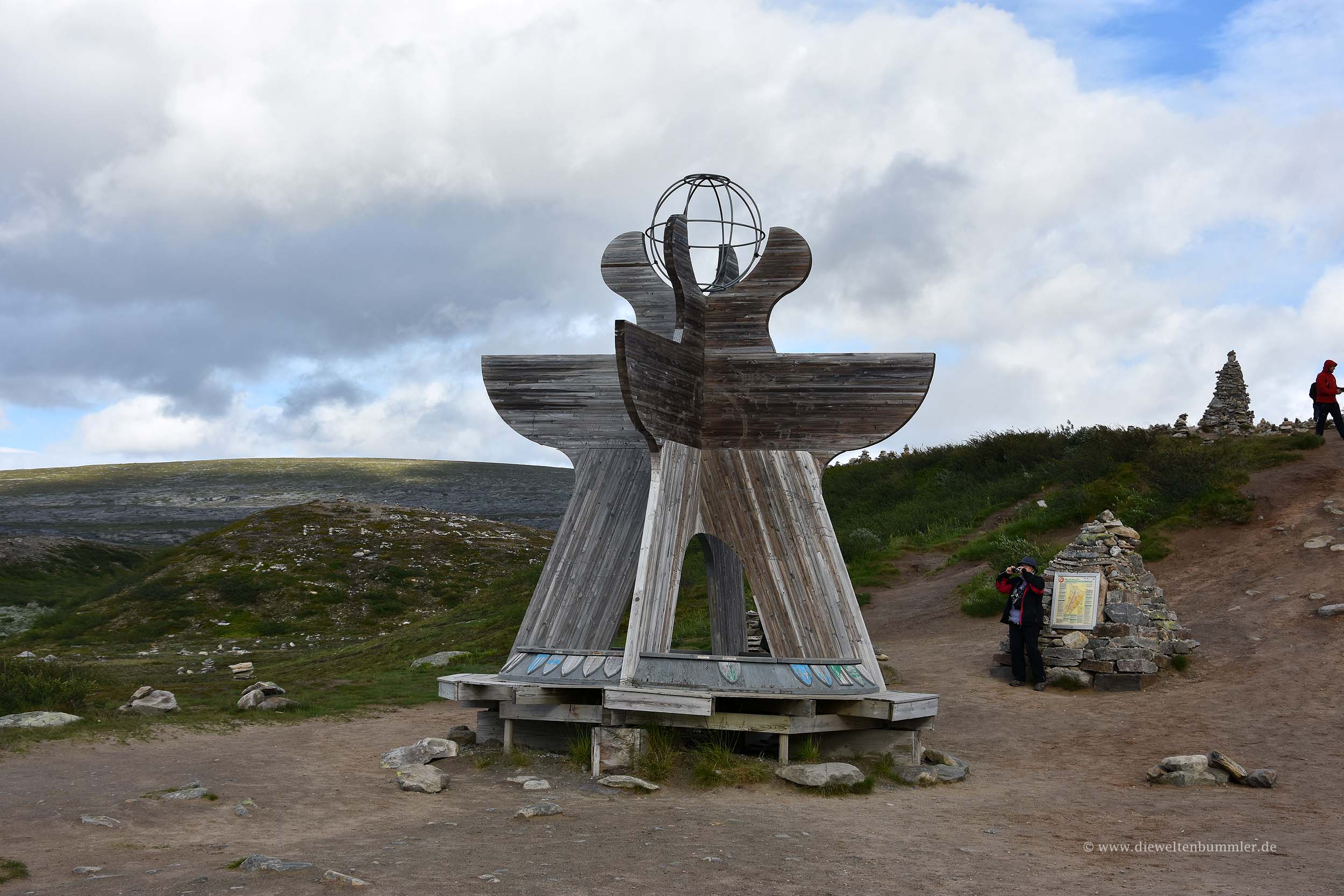 Wie auch immer, nach dieser und einer weiteren Baustelle hatten wir ein weiteres Zwischenziel erreicht: Wir waren am Polarkreis angekommen. Wir stellten unser Wohnmobil auf den großen Parkplatz und freuten uns, dass wir mal wieder hier waren. Natürlich schlenderten wir durch den Souvenirshop und kauften uns mal wieder ein Zertifikat, dass wir den Polarkreis überquerten. Und wir wanderten auch ein wenig durch die angrenzende Landschaft, wo Touristen kleine Steinhäufchen bilden, obwohl von norwegischer Seite aus strikt darum gebeten wird, das eben nicht zu machen. Auch dies sei eben eine Landschaftsveränderung. Ich kann diese Bitte irgendwie nachvollziehen, denke aber andererseits, dass man das ja dann nur hier macht und nicht zwei Kilometer weiter. Trotzdem, wenn das Gastgeberland das bittet, dann sollte man das auch respektieren. Und ja, an manchen Stellen wird dann auch schon ziemlich übertrieben. Da wird mit zahlreichen kleinen Steinen ein riesiger Schriftzug gestaltet und der nächste will diesen Schriftzug dann überbieten. Kein Wunder, dass man das eben nicht machen soll.