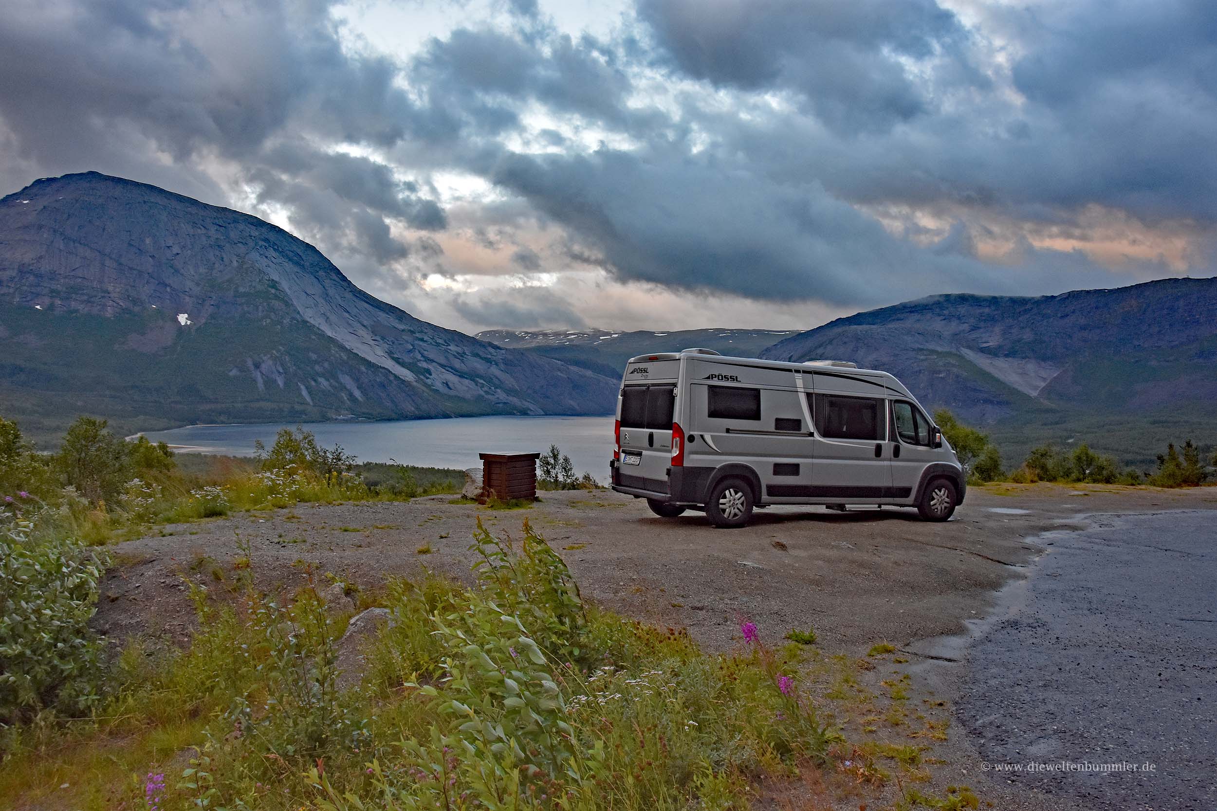 Ein anderes Wohnmobil stand auch schon hier und wir kamen kurz mit dem Fahrer aus Hamburg ins Gespräch. Er erzählte uns, dass er gerade von den Lofoten käme und sie dort vier Tage lang ständig Regen gehabt hätten. Das Wetter wäre so schlecht gewesen, dass sie nicht einmal wandern konnte. Das ist natürlich schade und wir hofften, dass uns das unterwegs nicht auch noch passieren würde. Momentan war das Wetter definitiv schlecht und ungemütlich. Aber momentan war es uns eben auch egal, weil wir sowieso nur fuhren. Immerhin sind wir an diesem Tag rund 650 Kilometer gefahren, was für norwegische Verhältnisse schon eine ganze Menge ist. Man darf ja nicht vergessen, dass die E6 so weit im Norden keine autobahnähnliche Straße mehr ist, sondern eher eine bessere Landstraße. Und „besser“ eben auch nicht in jedem Fall.