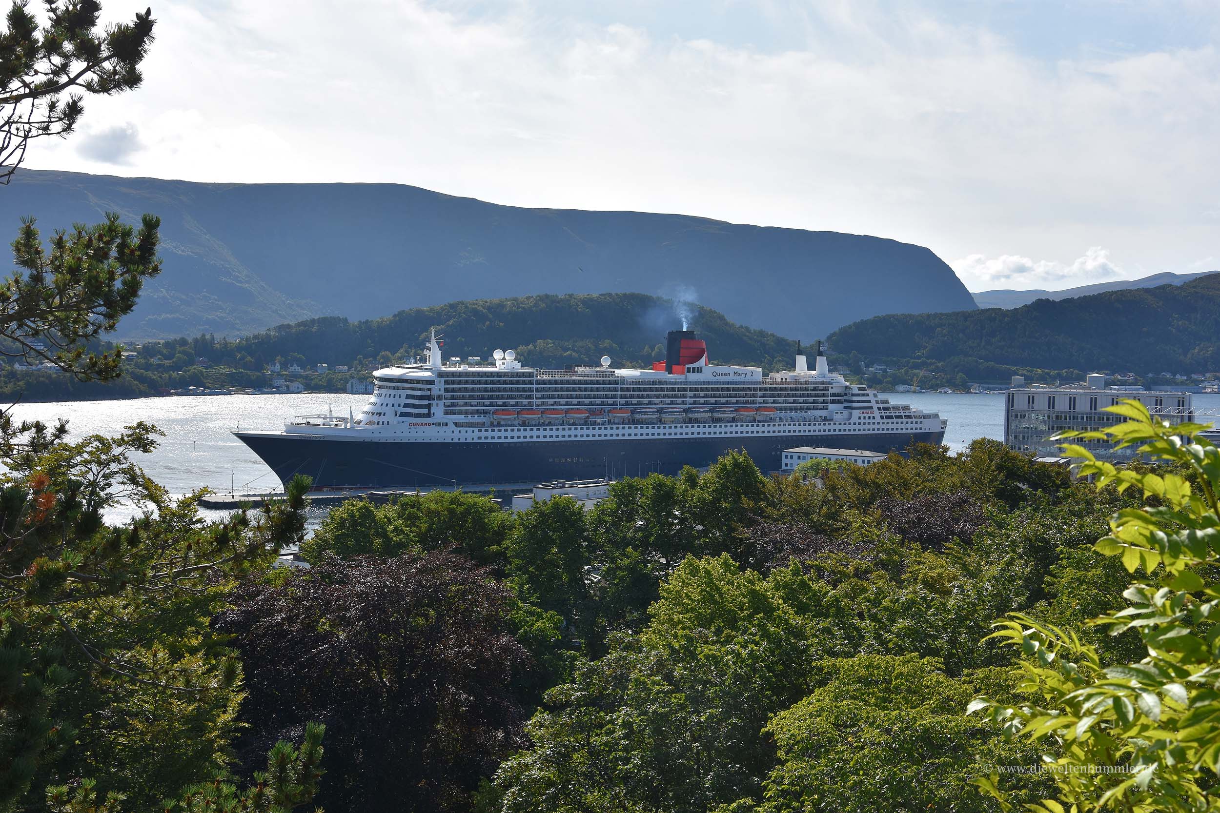 Im letzten Jahr reisten wir mit der Queen Mary 2 über den Atlantik nach New York, um dort mit dem Mietwagen durch die USA zu fahren. Auch die Rückfahrt legten wir mit der Queen Mary 2 von New York nach Southampton zurück. Wir waren so begeistert von dem Schiff, dass wir nach dieser Reise immer wieder mal schauten, wo es denn gerade unterwegs sei. Daher wussten wir, dass die Queen Mary 2 derzeit eine Fjord-Kreuzfahrt macht und einige Orte in Norwegen ansteuert. Am gestrigen Abend schauten wir ebenfalls im Internet nach, wo das Schiff eigentlich genau sei. Und wie es der Zufall so will, würde die Queen Mary 2 am heutigen Tag in Ålesund anlegen. Das war natürlich dann etwas, was wir uns nicht entgehen lassen wollten.