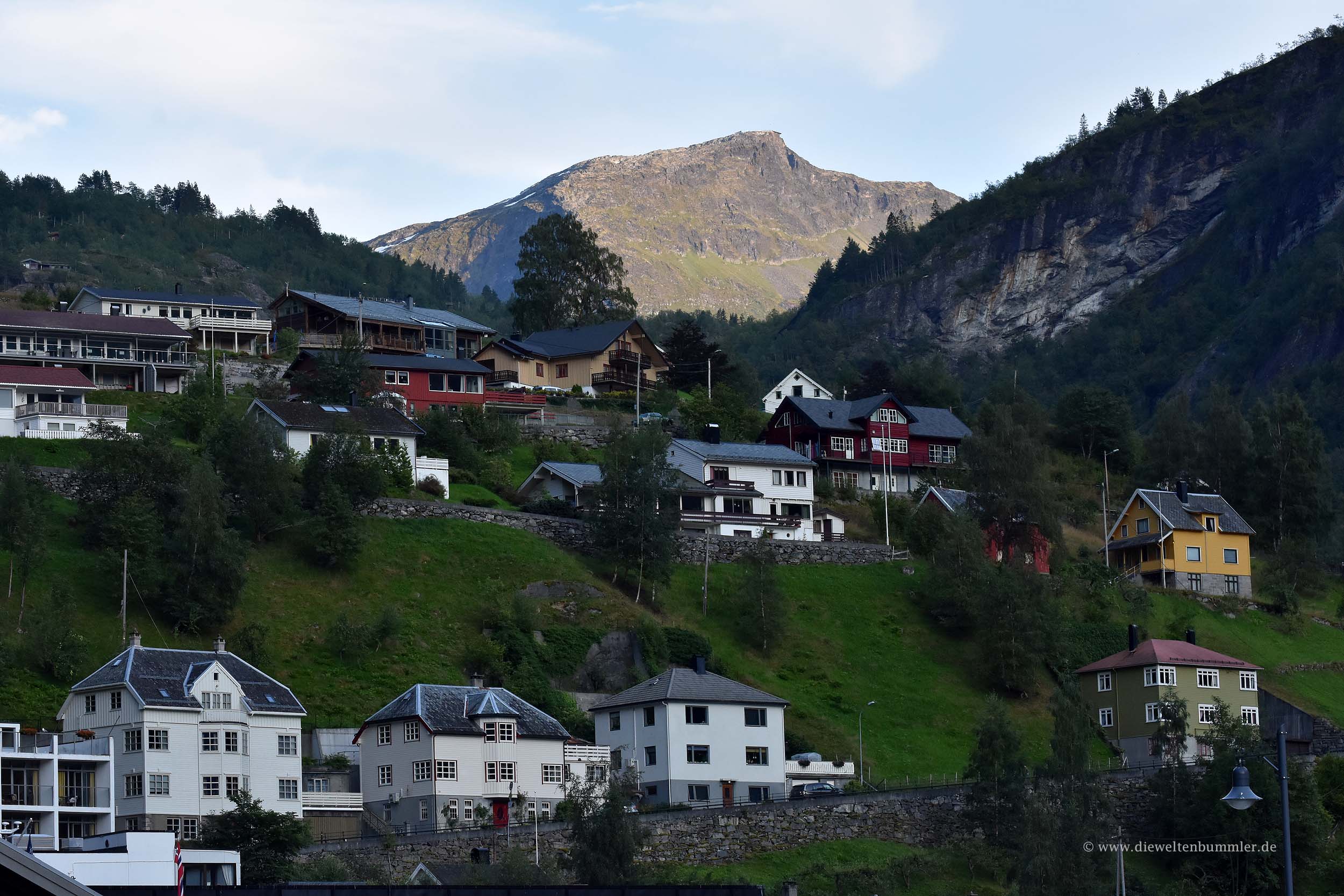 Auf dem Parkplatz oberhalb der Serpentinenstraße ist laut Beschilderung das Übernachten verboten. So fuhren wir dann doch runter zum Fjord. Viel Zeit ließen wir uns dabei, um die Bremsen nicht zu überhitzen. Es war uns ja nicht eilig. Unten auf dem Wasser sahen wir ein Schiff der Costa-Reederei, das gerade losmachte und den Geirangerfjord langsam verließ. Erschreckenderweise machte das Schiff dabei einen Höllenlärm und beschallte mit der Lautsprecheranlage den gesamten Fjord musikalisch. Das fanden wir schlimm und waren wieder einmal froh, dass wir unsere Reise damals mit Cunard machten, wo es deutlich stilvoller zugeht.