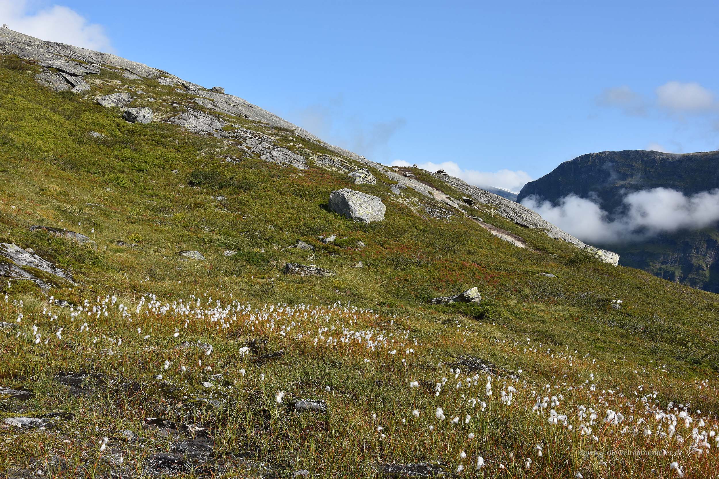 Das Wetter war so wie es uns in der Vorhersage versprochen wurde. Blauer Himmel, wenige Wolken, also ideal, um weitere Aussichten zu genießen oder zu wandern. Wir steuerten das Wohnmobil vom Campingplatz runter und setzten gleich zur Bergfahrt an, um den Geirangerfjord zu verlassen. Steil ging die Straße rauf und wir hatten das gar nicht mehr so hoch in Erinnerung. Allerdings sind wir die Straße bisher auch immer nur hinab gefahren und noch nie hinauf. Zwischendurch hielten wir manchmal an, um wieder zurückzublicken und erfreuten uns auch an dem Wollgras, das hier oben überall wuchs.