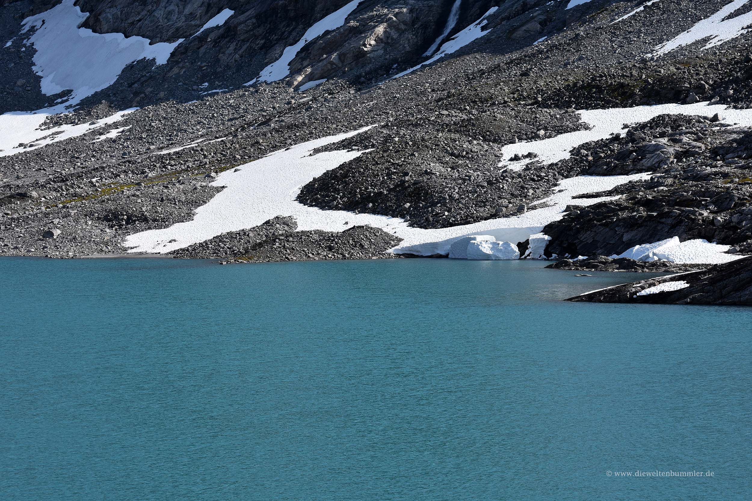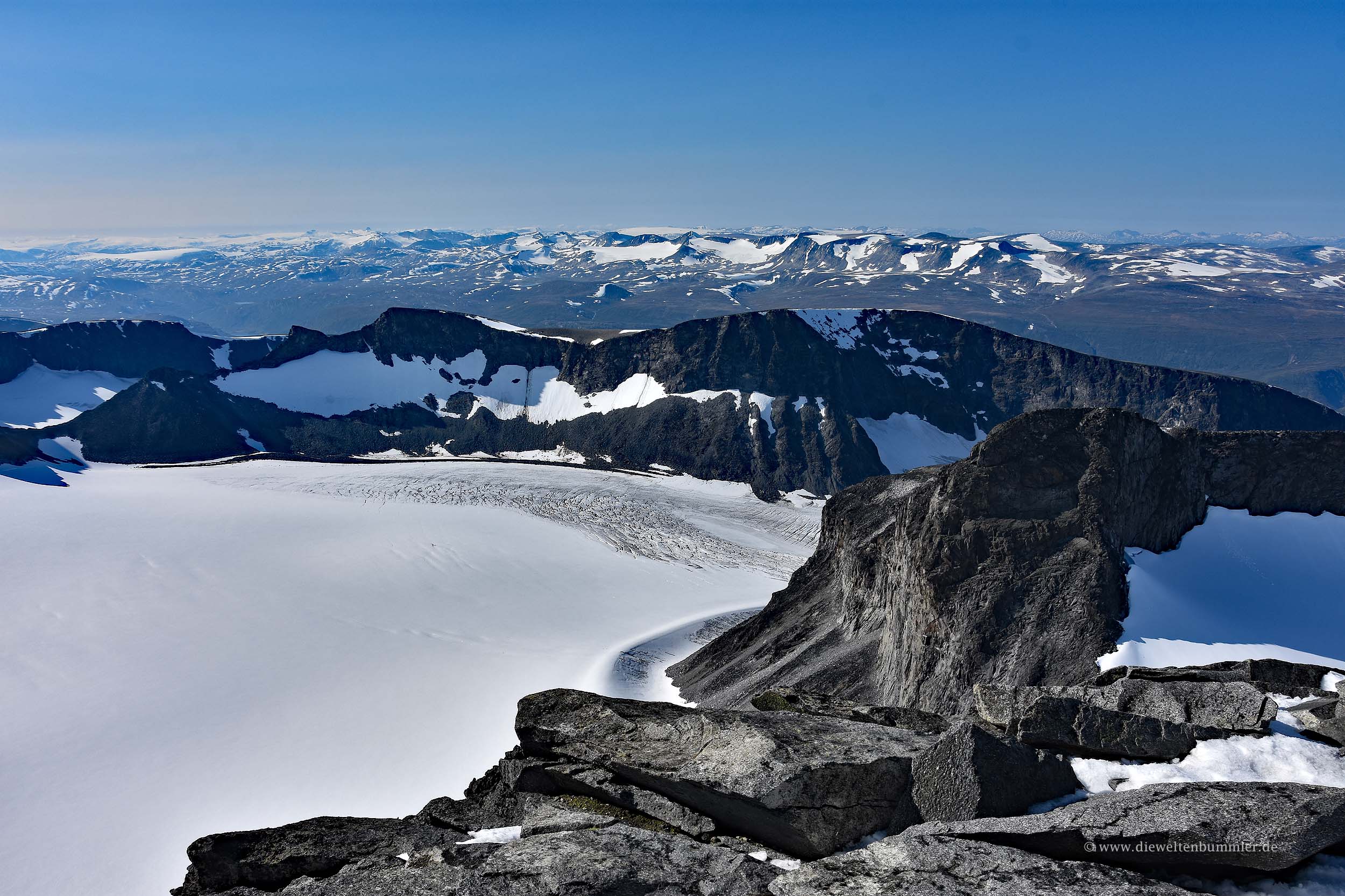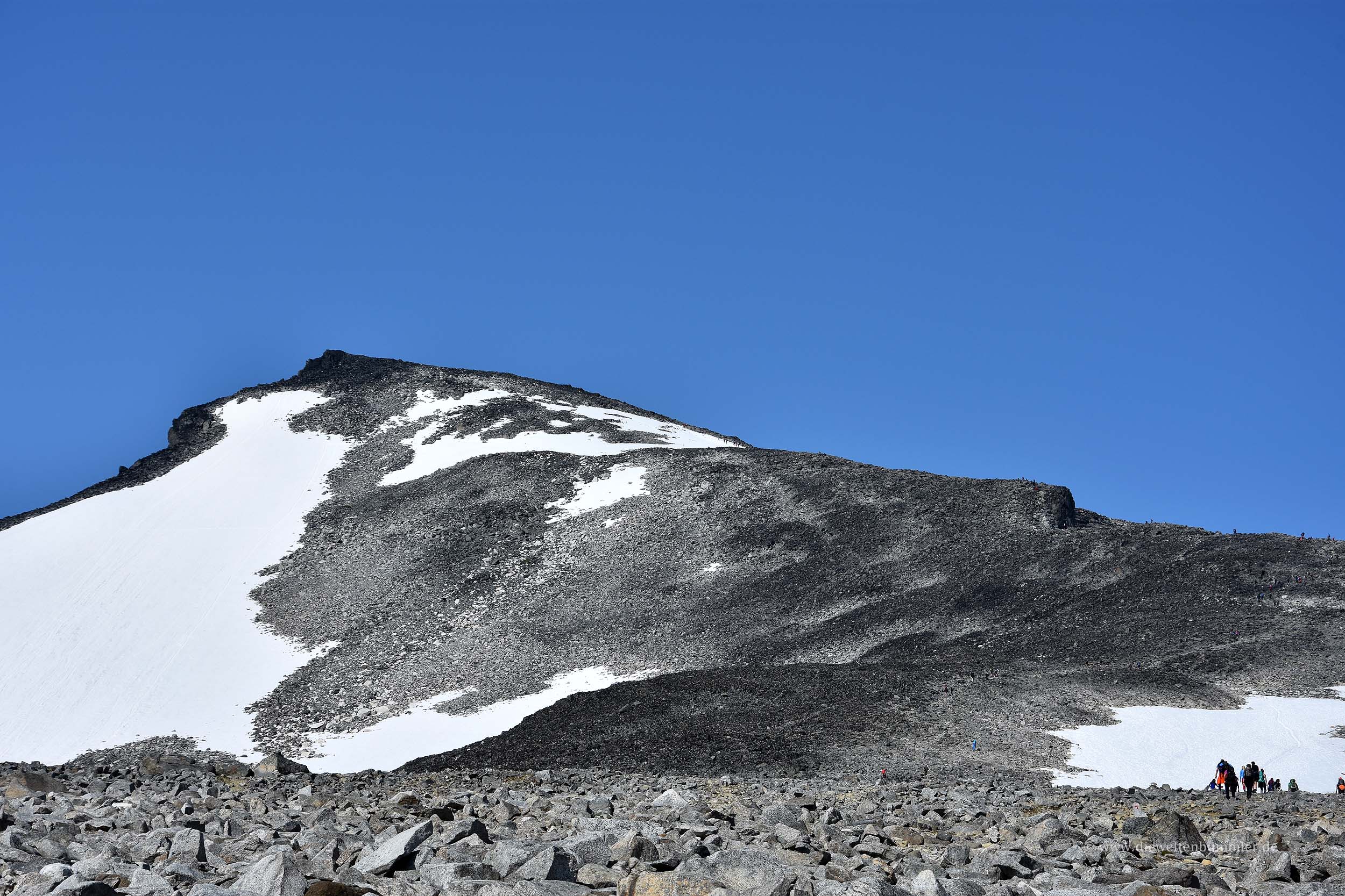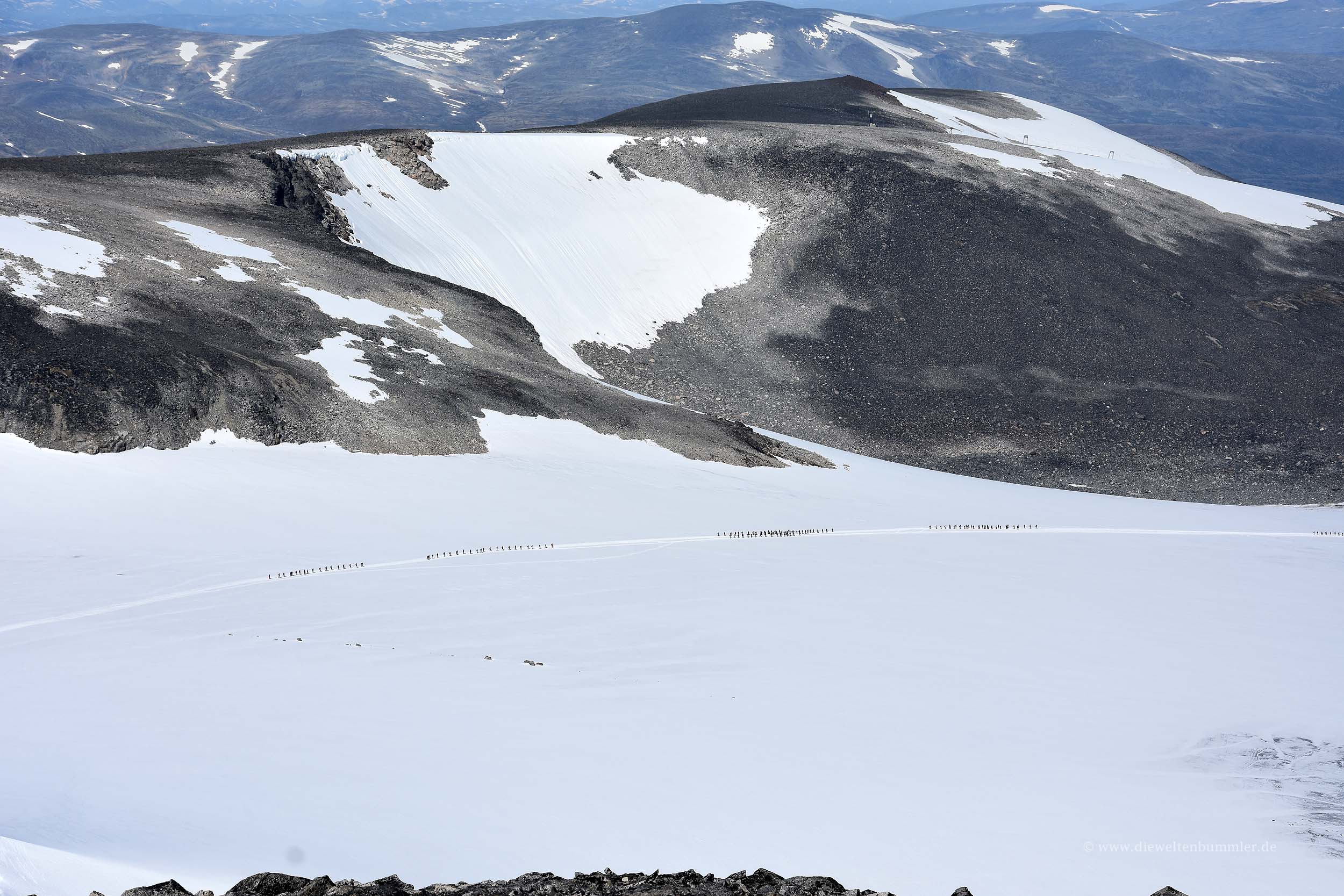 Das Gemeine an diesem Berg ist ja, dass man seinen Gipfel extrem lange nicht sieht. Erst rund 100 Höhenmeter vor dem Erreichen des Gipfels sieht man diesen auch. Das ist unterwegs recht zermürbend. Und ganz so leicht ist es mit der Tour auch nicht. Einige Schneefelder sind zu überqueren. An manchen Felsen macht es zudem Sinn, alle Viere zu benutzen, aber im Großen und Ganzen ist das eine Wanderung, die erfahrene Wanderer gut bewältigen können. Zwischendurch überwindet man zwei kleinere Gipfel, die einem die Sicht auf den Galdhøppigen nehmen, dafür aber eine Aussicht auf den angrenzenden Gletscher ermöglichen.
