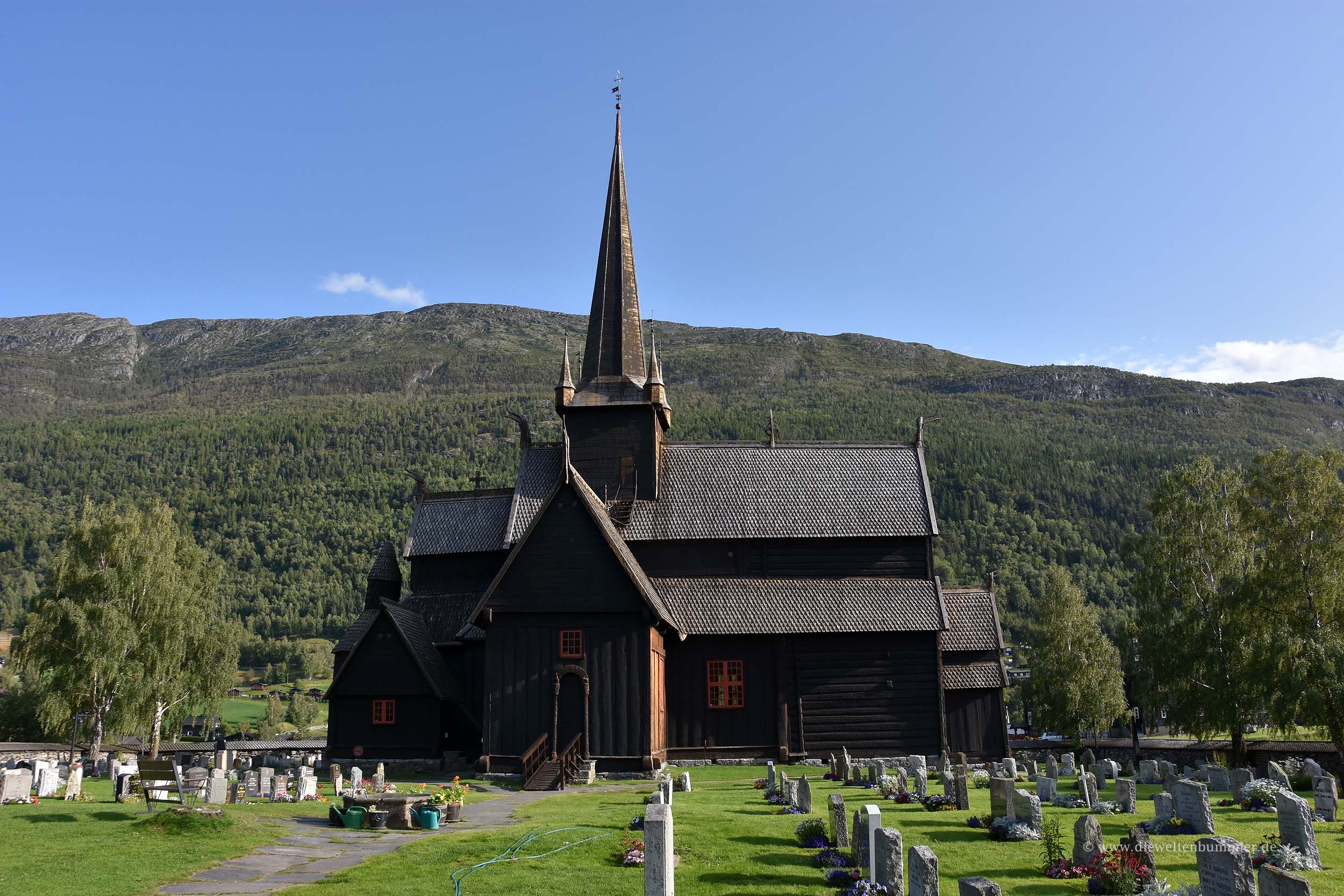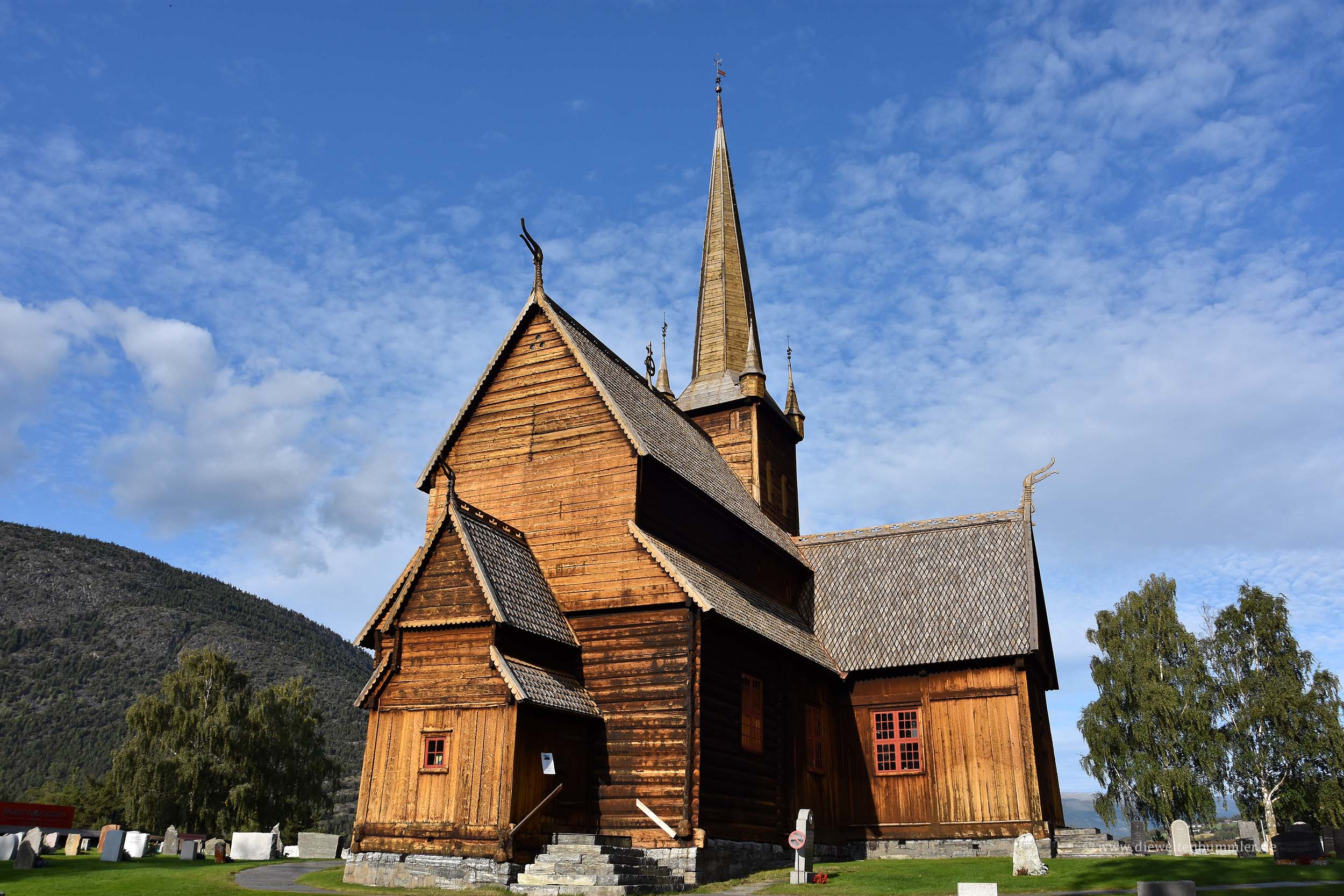 Ich war nur noch ein wenig unentschlossen, weil die Satellitenansicht bei Googlemaps so aussah, als würde sich die Hütte in einem engen und dunklen Tal befinden. Und auf Enge hatte ich irgendwie wenig Lust. Daher schauten wir auch noch, ob es in Lom oder in unmittelbarer Umgebung vielleicht auch noch ein Plätzchen geben würde, an dem wir stehen könnten. Doch abgesehen von dem offiziellen Campingplatz, der uns entschieden zu teuer war, war da wenig Hoffnung. Also besichtigten wir die Stabkirche von Lom, schlenderten durch den Ort und gingen noch im Supermarkt einkaufen.