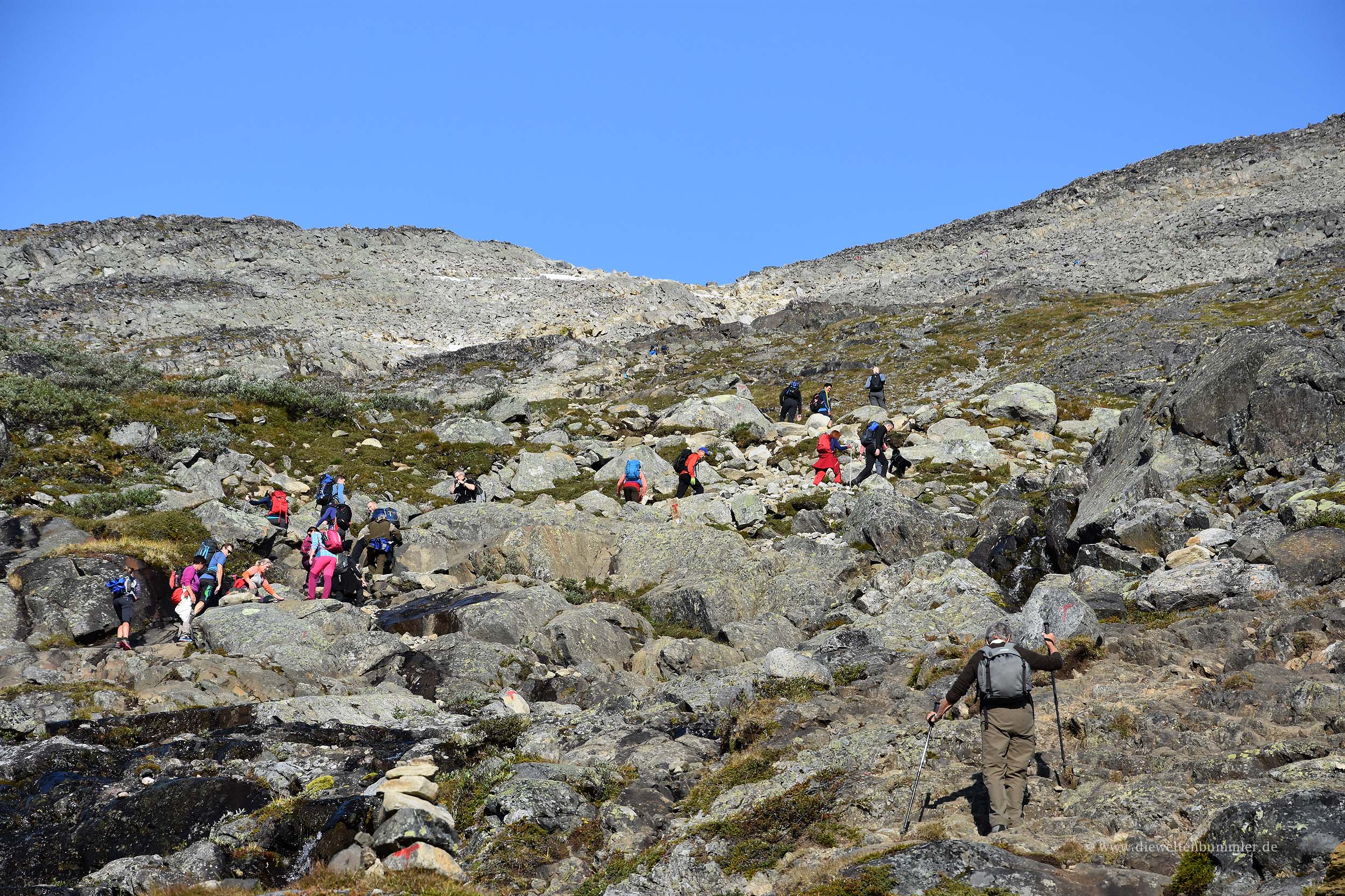 Frühmorgens standen wir auf. Es war noch kalt. Das Tal lag noch im Schatten und wir packten uns warm ein, um die anstehende Wanderung zu starten. Details zu der Wanderung auf den Galdhøppigen hatte ich ja bereits im Blog beschrieben. Schon kurz nachdem wir loszogen, mussten wir uns teilweise unserer warmen Kleidung entledigen. Da es gleich zu Beginn gnadenlos in die Höhe geht, wurde uns trotz der Höhe und des Schattens sehr schnell sehr warm. Also schleppten wir fast von Anfang an noch Kleidung auf den Berg, die wir unterwegs nicht mehr benötigen würden. Aber man weiß ja nie.