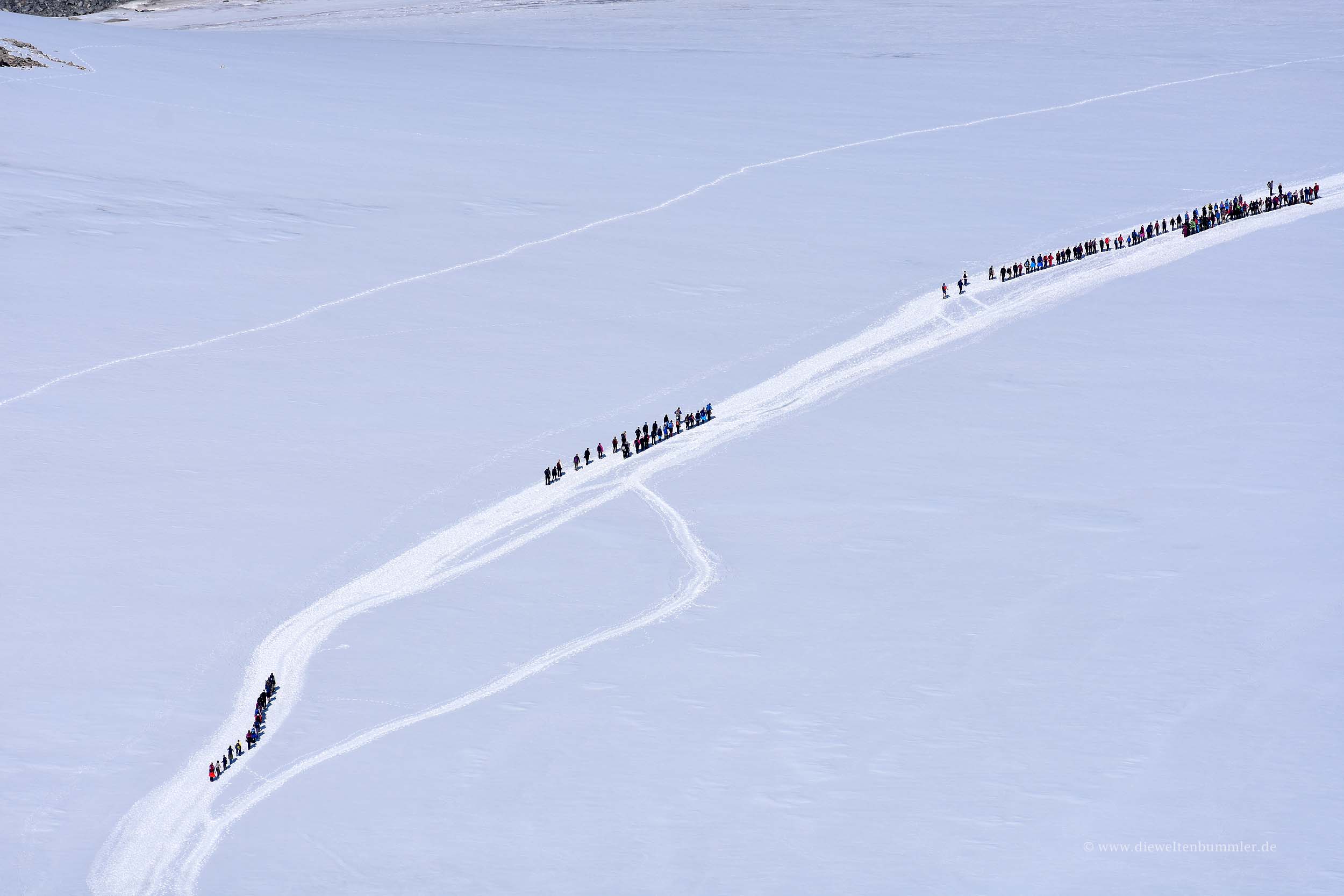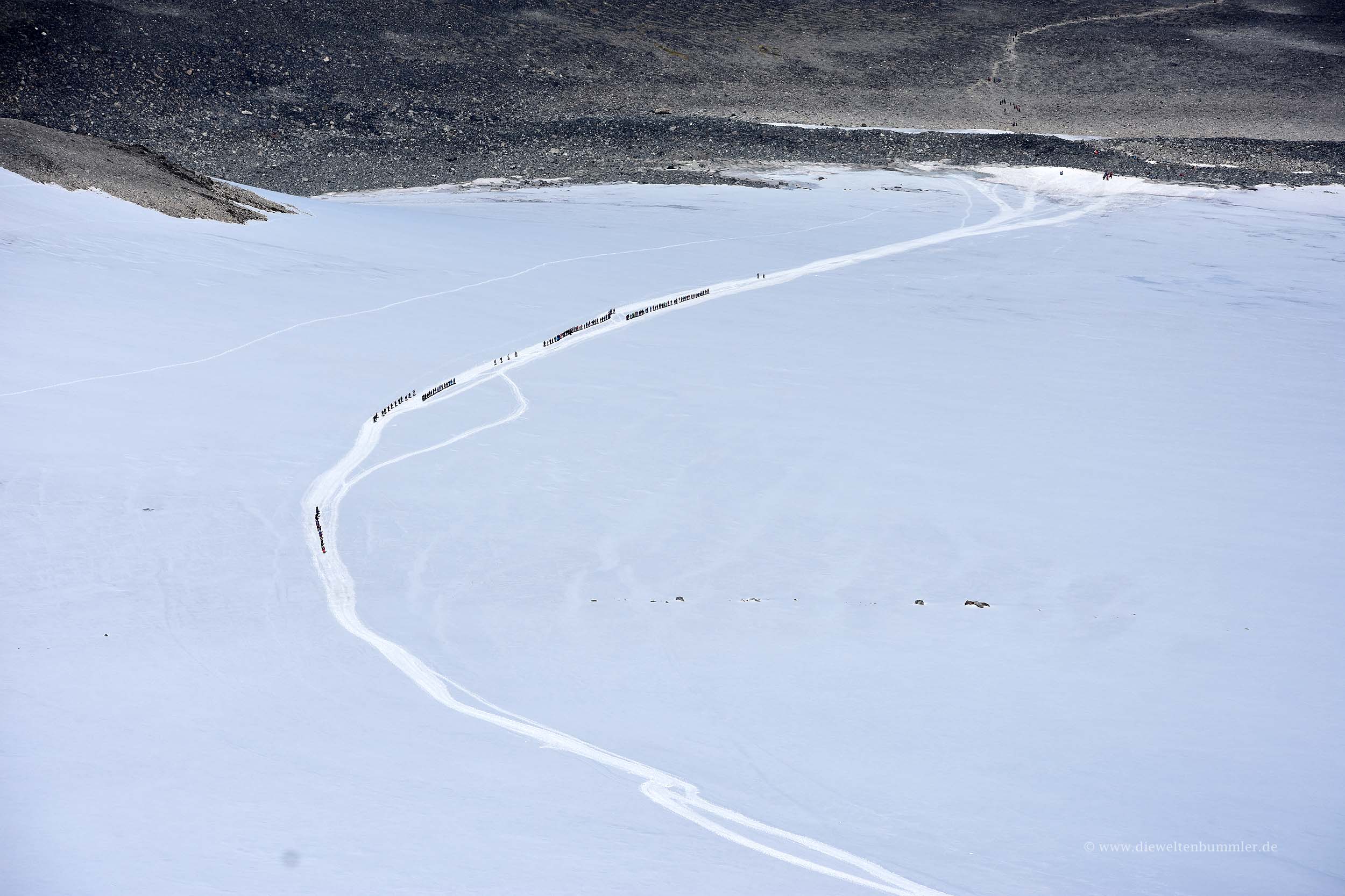 Auf dem Gletscher sieht man dann mehrere Kolonnen von Wanderern, die seilgesichert und als Gruppe diesen Gletscher überqueren. Dieser Weg kann als Alternative genutzt werden und erfordert deutlich weniger Höhenmeter. Doch auf eine geführte Tour hatten wir keine Lust, weshalb wir lieber die lange Individualtour bevorzugten.