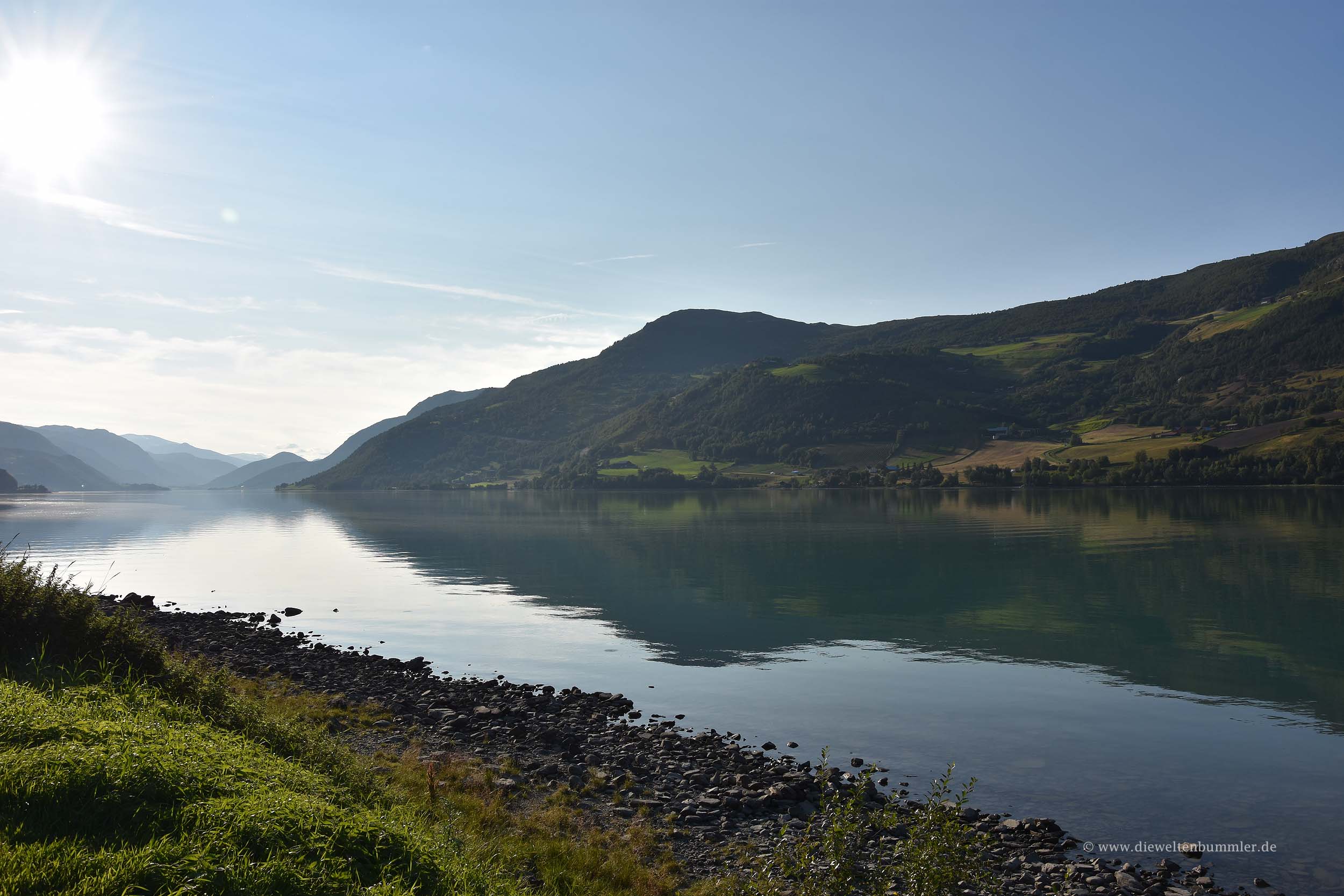 Unten angekommen fuhren wir in Richtung Campingplatz und an diesem vorbei. Wir wussten noch vom letzten Mal, dass es an der kleinen Straße direkt am Ufer Parkplätze gibt, auf denen man übernachten kann. Doch wir sahen wir schon von weiter oben, dass es wohl schwierig werden dürfte, dort noch einen Platz zu ergattern. Und so war es letztendlich auch, mehrere Wohnmobile blockierten bereits die wenigen Flächen zwischen Straße und Ufer und so blieb uns nichts anderes übrig, als entweder weiter zu fahren oder den Campingplatz von Geiranger aufzusuchen.
