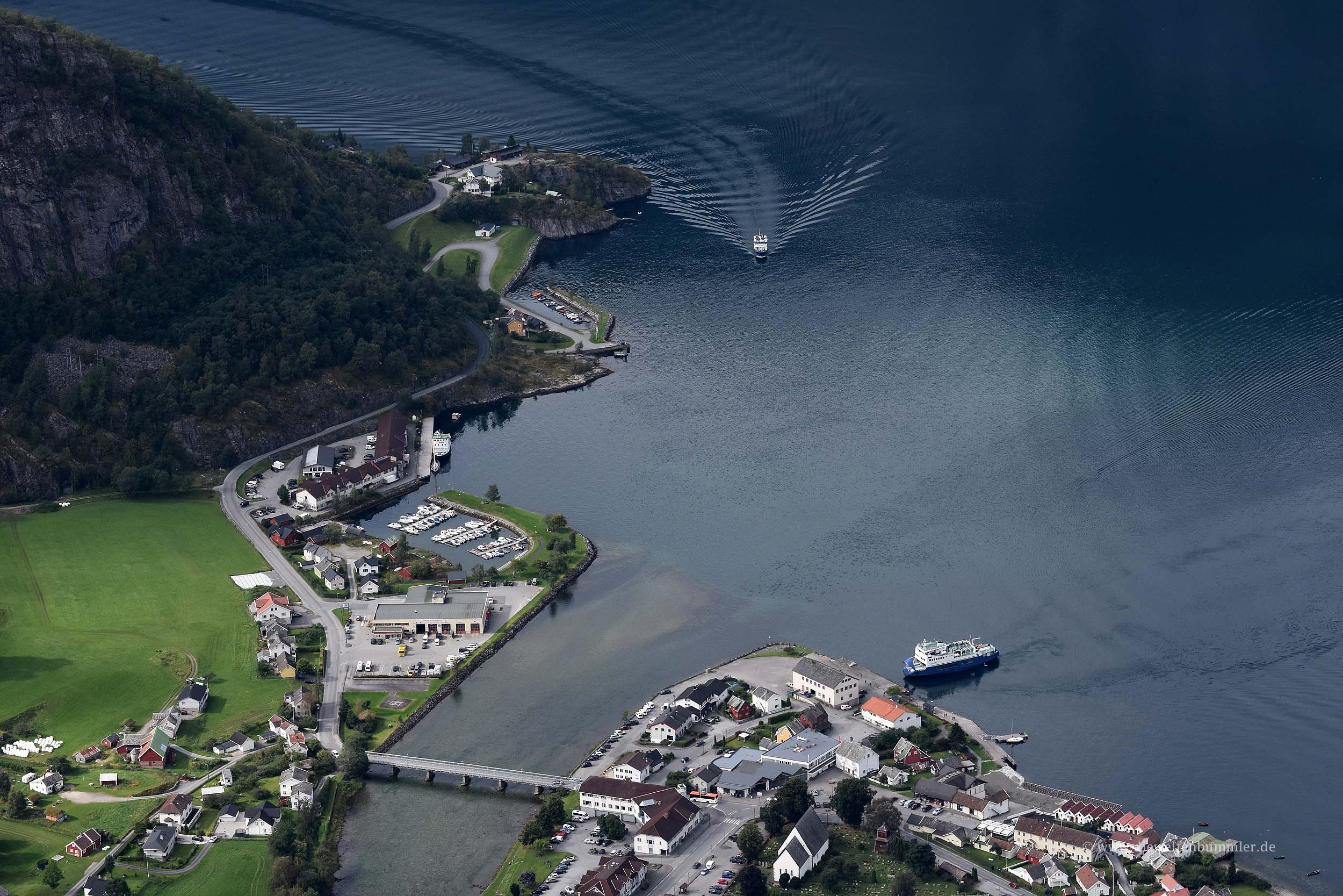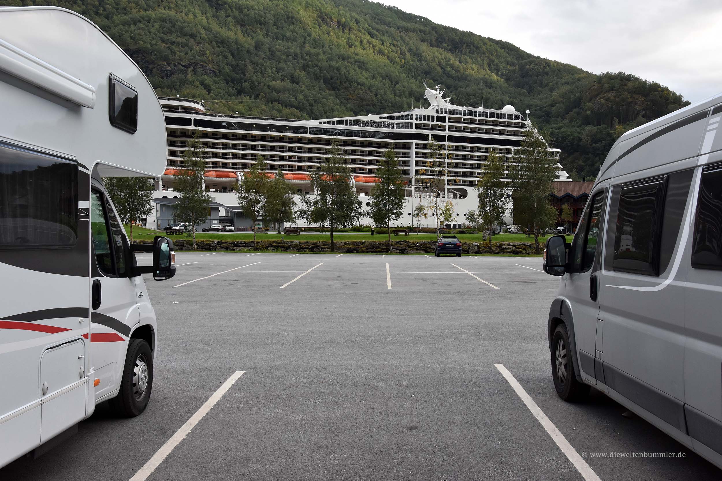 Auch den Rest des Abstiegs gingen wir ganz gemächlich an und fuhren entspannt im ersten Gang hinab, bis wir am Fjord standen. Dort wechselten wir auf die Straße in Richtung Flåm und sahen schon von Weitem zwei Kreuzfahrtschiffe, die im Hafen angelegt hatten.