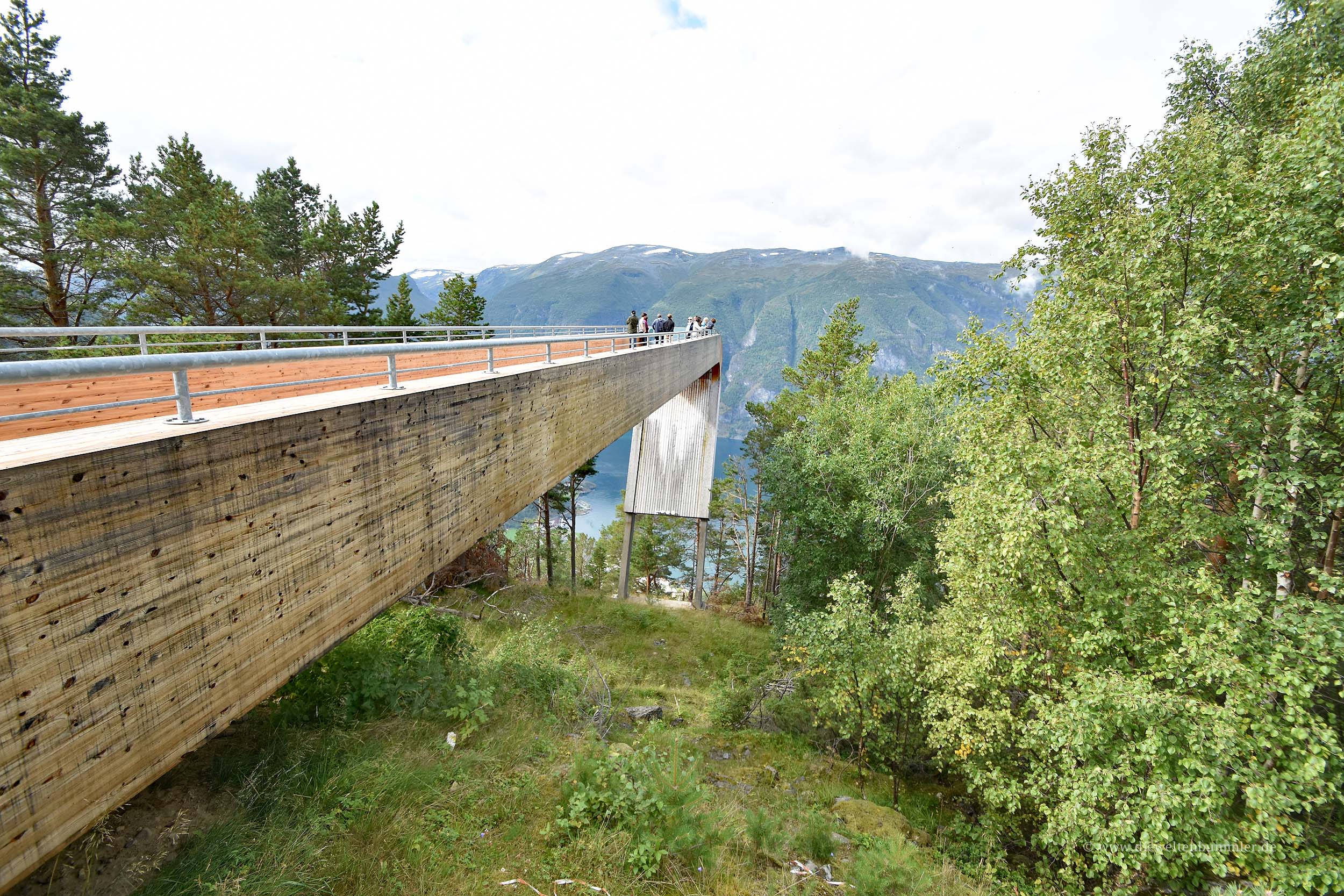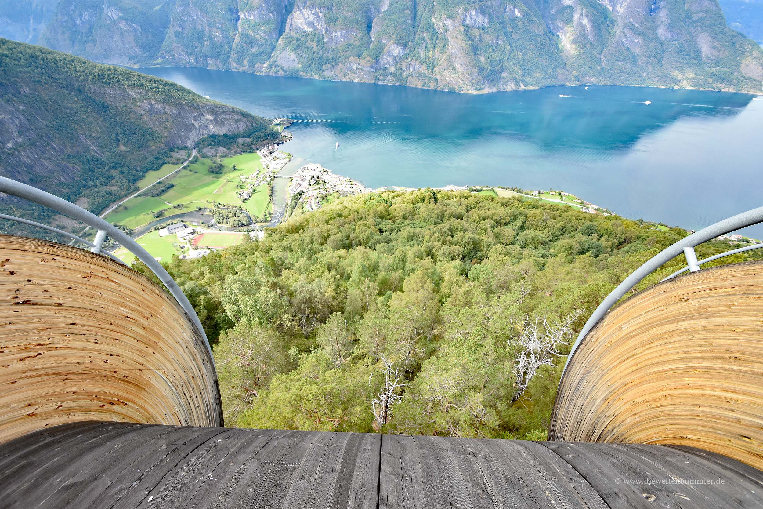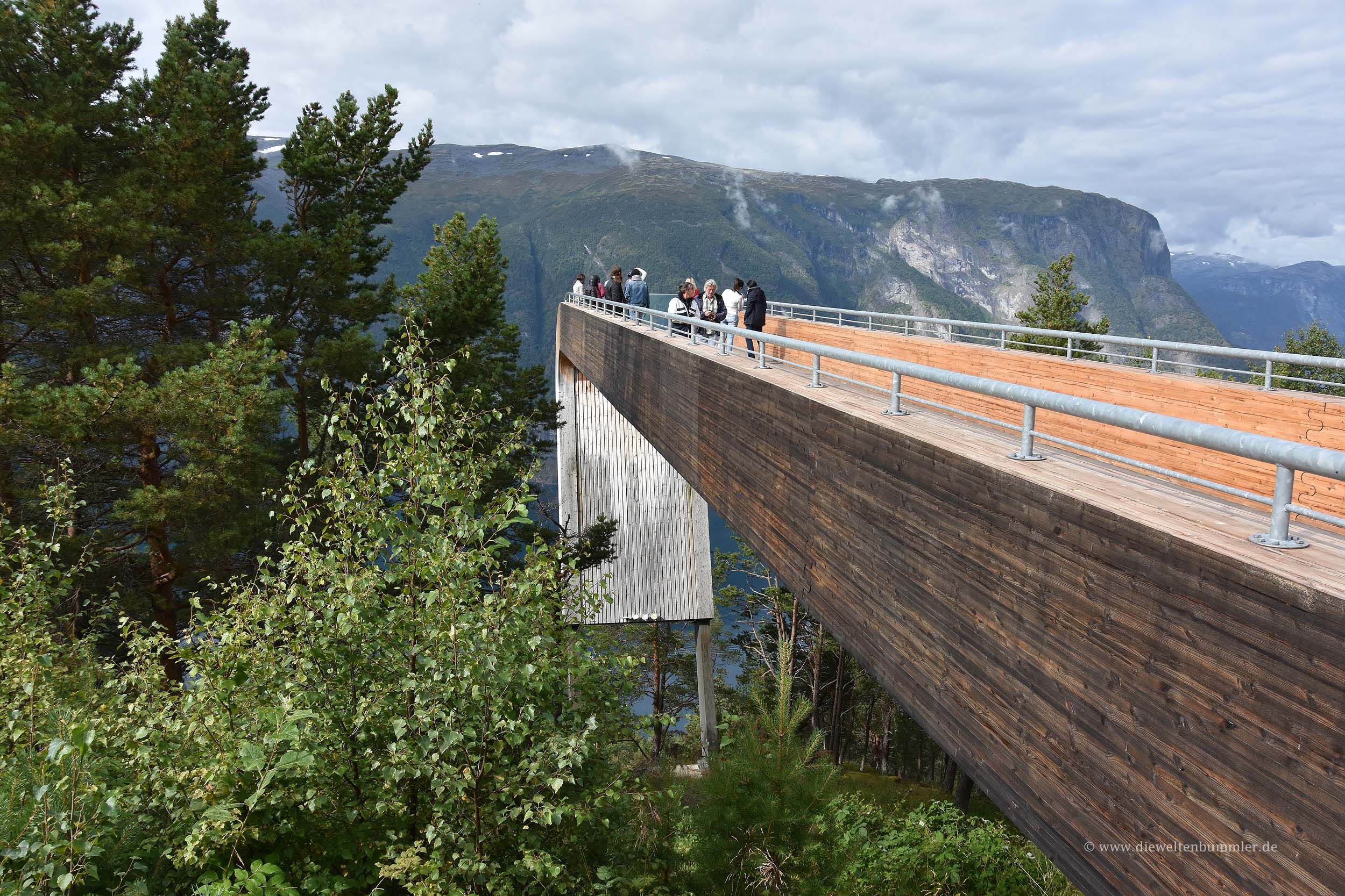 Auch andere Wohnmobile, die kurz nach uns vom Pass hinunterkamen, quietschten deutlich. Außerdem rochen diese Fahrzeuge nach verbranntem Material. Stegastein ist ein hölzerner Aussichtspunkt, von dem aus man einen tollen Blick auf den weiter unten liegenden Fjord hat. Lange bleibt man dort nicht, doch für eine kurze Pause mit Weitsicht ist dieser Platz ideal und sehr schön.