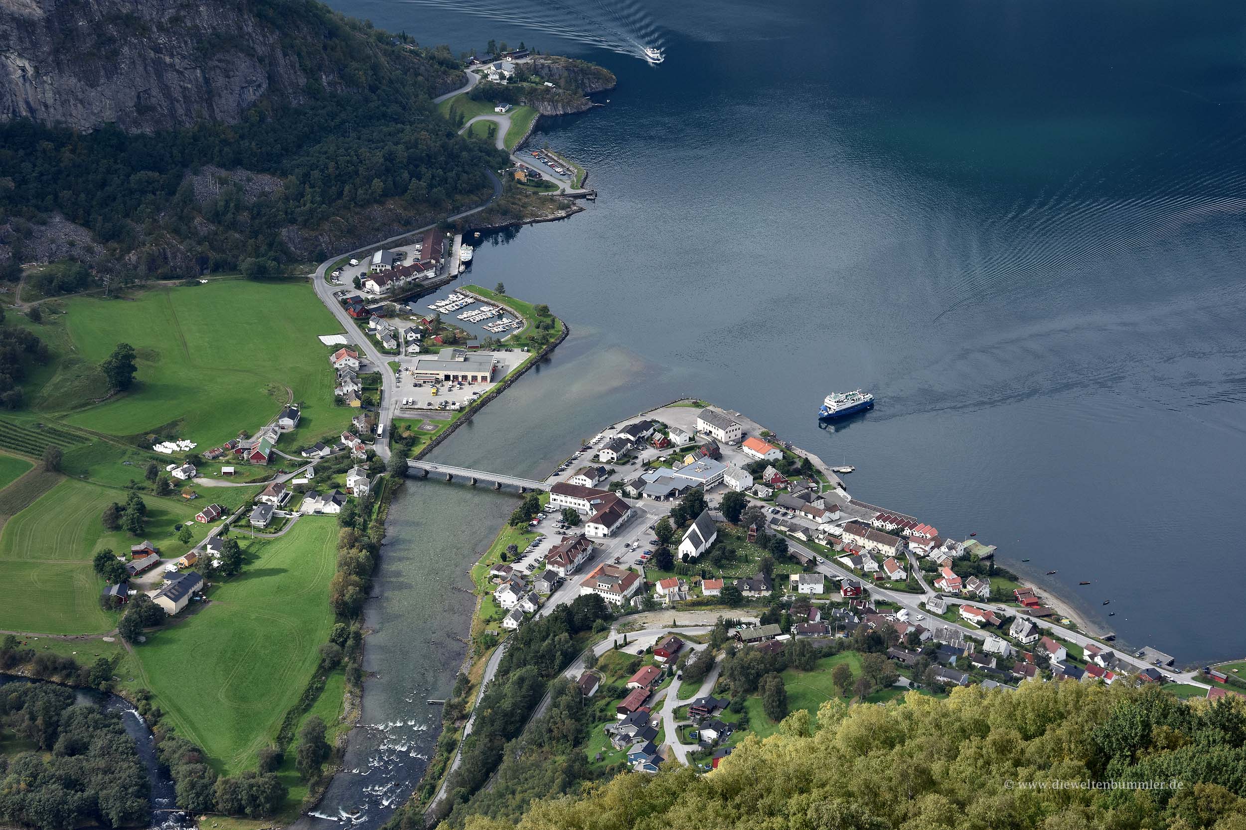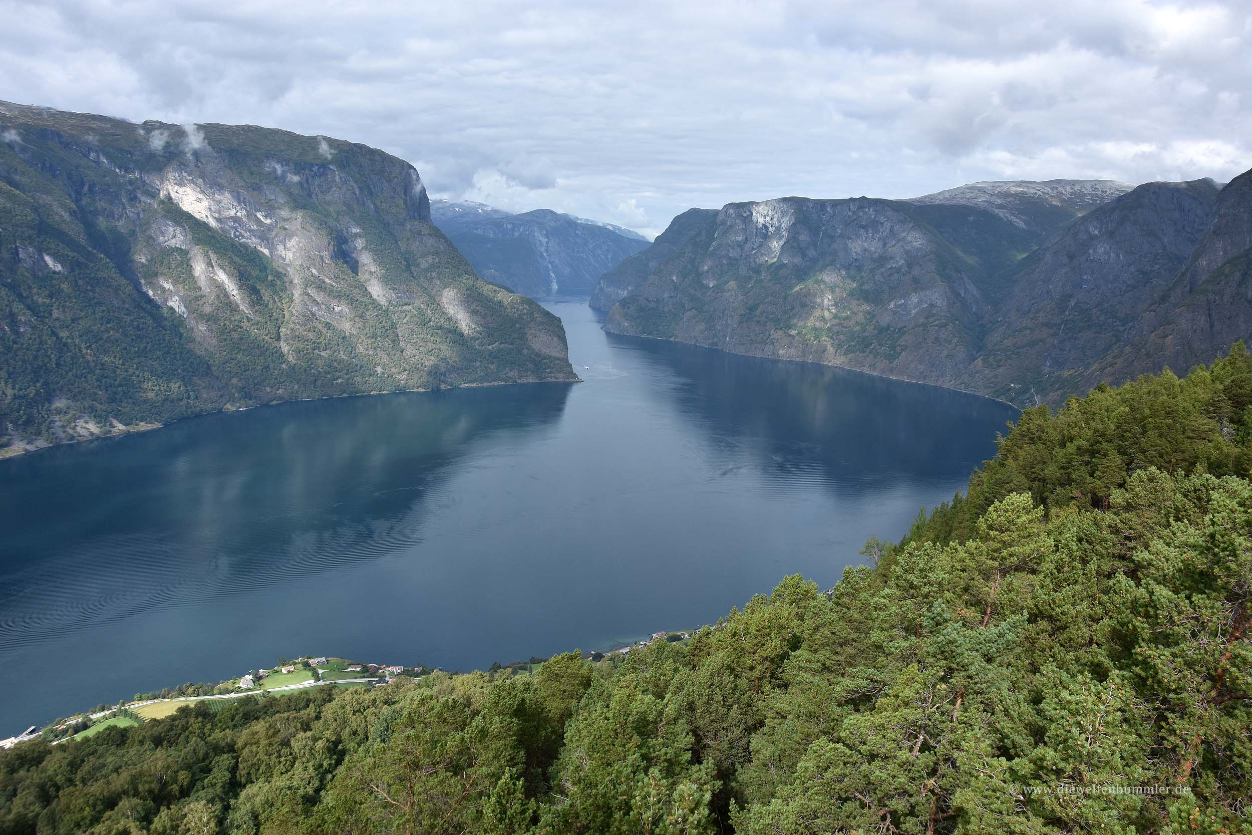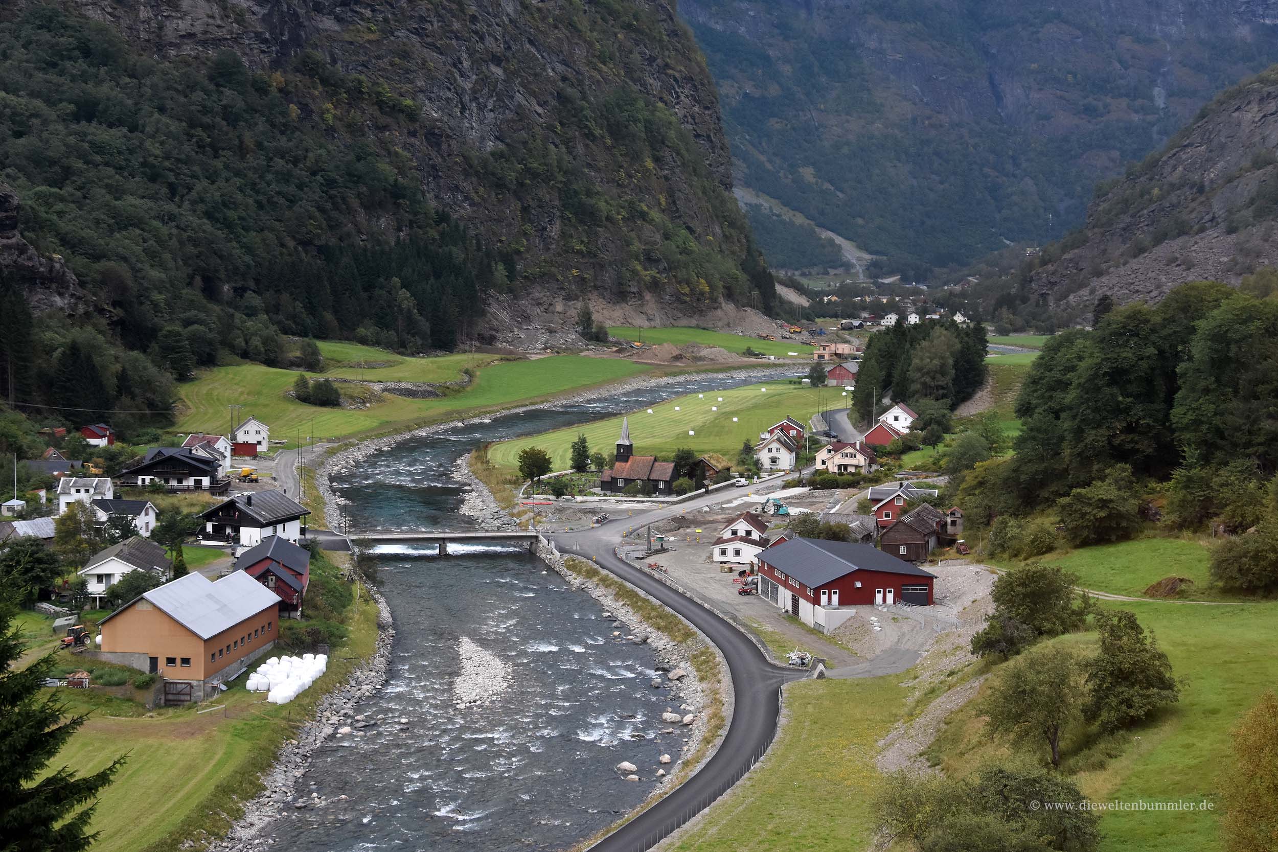 Wir umrundeten die Ortschaft und stellten unser Wohnmobil auf einem kleinen Parkplatz ab, von wo aus wir durch Flåm spazierten. Der Ort ist nicht sonderlich groß und blühte zumindest an diesem Tag wegen der Schiffe auf, die zahllose Touristen ausspuckten. Außerdem gibt es hier einen Bahnhof, von dem aus man die beliebte Touristenbahn Flåmsbana nutzen und bergauf fahren kann.